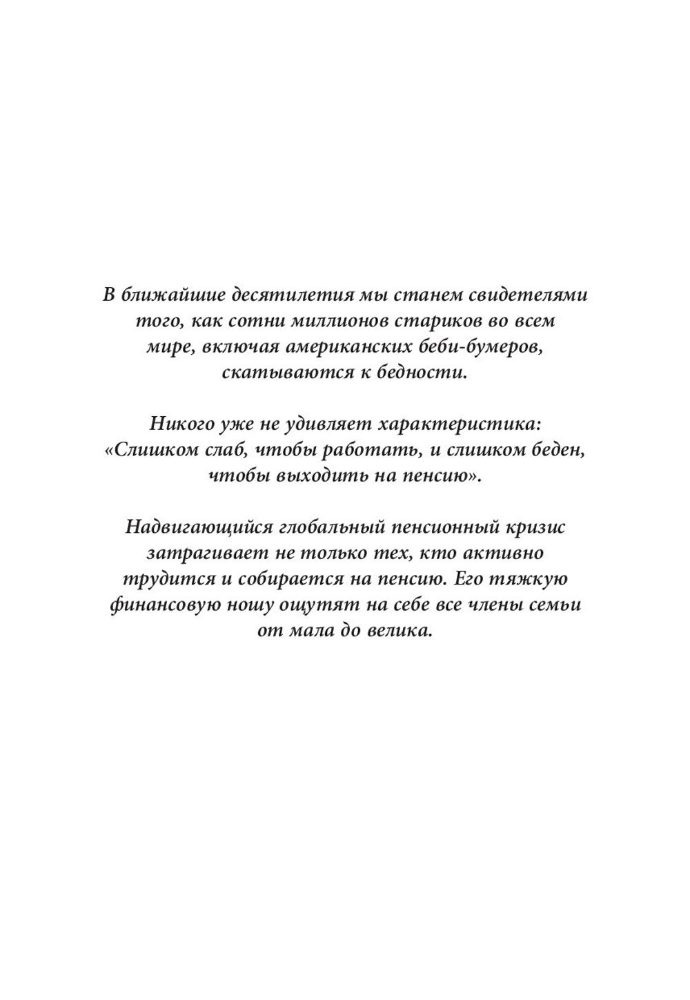 В ближайшие десятилетия мы станем свидетелями того, как сотни миллионов стариков во всем мире, включая и американских беби-бумеров, скатываются к нищете. О них будут говорить: «Слишком слабы, чтобы работать, и слишком бедны, чтобы выходить на пенсию». Надвигающийся глобальный кризис затрагивает не только людей пенсионного и предпенсионного возраста, но и всех членов их семей - молодых и пожилых, - которые будут нести на себе финансовое бремя стареющего населения планеты. Книга «Кто крадет вашу пенсию» представляет собой глубокий анализ пенсионного кризиса, с которым сегодня сталкивается мир, злоупотреблений и системной коррупции, которые стали его причиной, и в то же время попытку наметить шаги, которые могут предпринять миллионы людей, рассчитывающих на достойную пенсию. Почему авторов двое? Потому что существует два вида пенсионных систем. Эдвард Сидл - бывший юрист Комиссии по ценным бумагам и биржам США, ведущий эксперт по расследованиям злоупотреблений в области пенсионного обеспечения государственных служащих, учителей, пожарных, полицейских, военных и других работников бюджетной сферы. Роберт Кийосаки - пропагандист финансового просвещения и автор мирового бестселлера «Богатый папа, бедный папа», эксперт в области накопительных пенсионных программ с фиксированными взносами типа 401(k), Superannuation, RRSP и IRA.