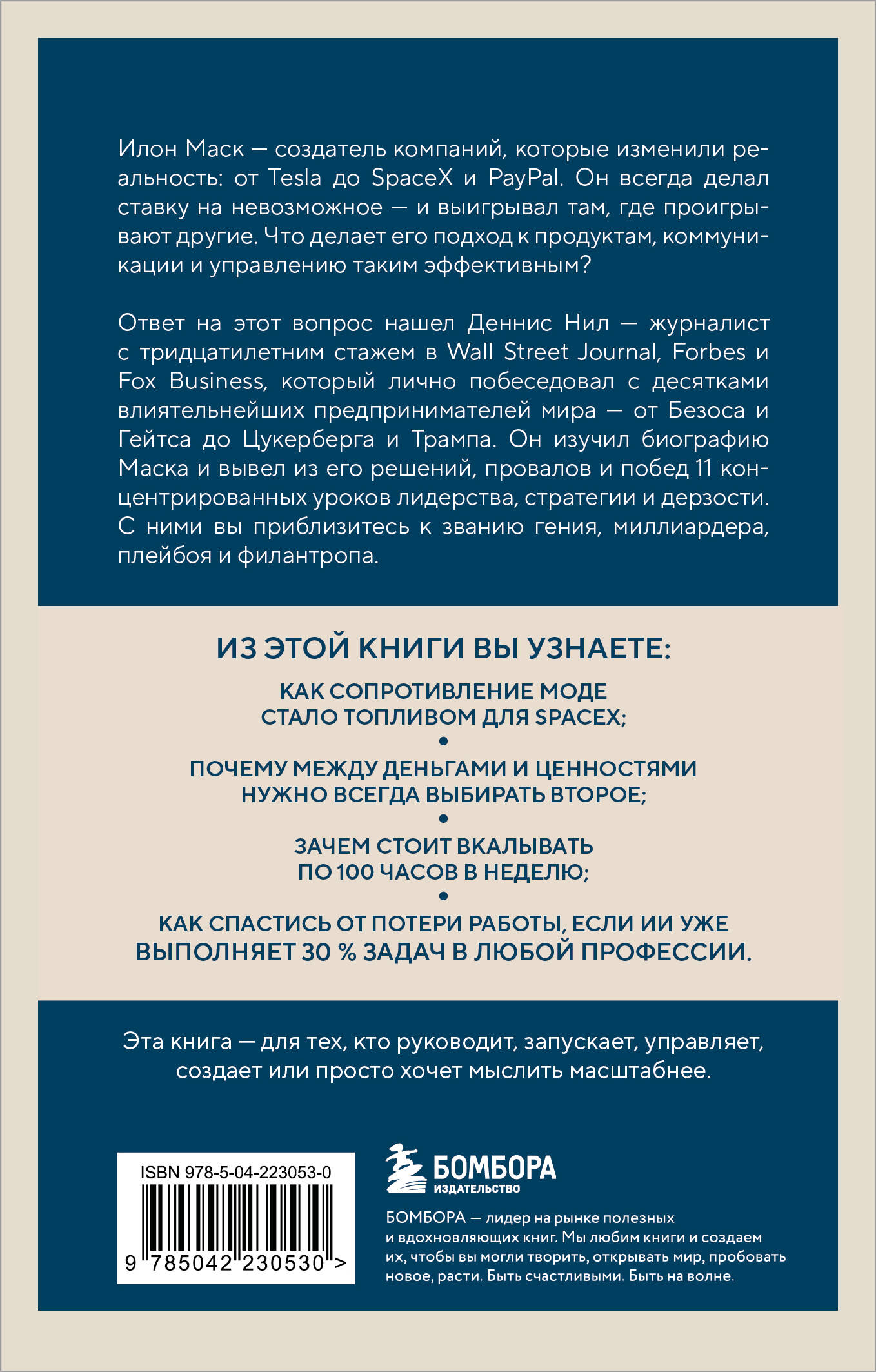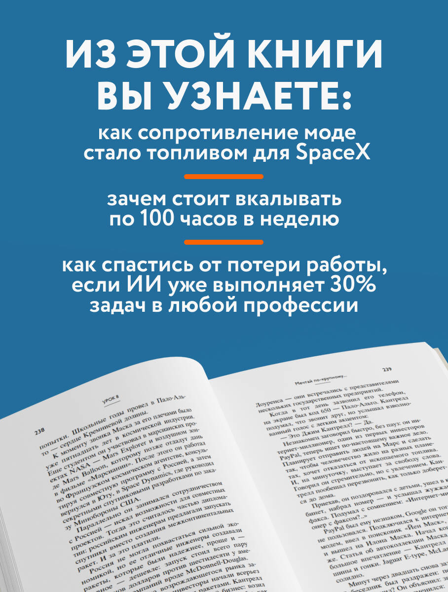 Илон Маск - создатель компаний, которые изменили реальность: от Tesla до SpaceX и PayPal. Он всегда делал ставку на невозможное - и выигрывал там, где проигрывают другие. Что делает его подход к продуктам, коммуникации и управлению таким эффективным? Ответ на этот вопрос нашел Деннис Нил - журналист с тридцатилетним стажем в Wall Street Journal, Forbes и Fox Business, который лично побеседовал с десятками влиятельнейших предпринимателей мира от Безоса и Гейтса до Цукерберга и Трампа. Он изучил биографию Маска и вывел из его решений, провалов и побед 11 концентрированных уроков лидерства, стратегии и дерзости. С ними вы приблизитесь к званию гения, миллиардера, плейбоя и филантропа. Из этой книги вы узнаете: - Как сопротивление моде стало топливом для SpaceX? - Почему между деньгами и ценностями нужно всегда выбирать второе? - Зачем стоит вкалывать по 100 часов в неделю? - Как спастись от потери работы, если ИИ уже выполняет 30% задач в любой профессии. Эта книга - для тех, кто руководит, запускает, управляет, создаёт или просто хочет мыслить масштабнее.| Издательство | ООО "Издательство "Эксмо" |
