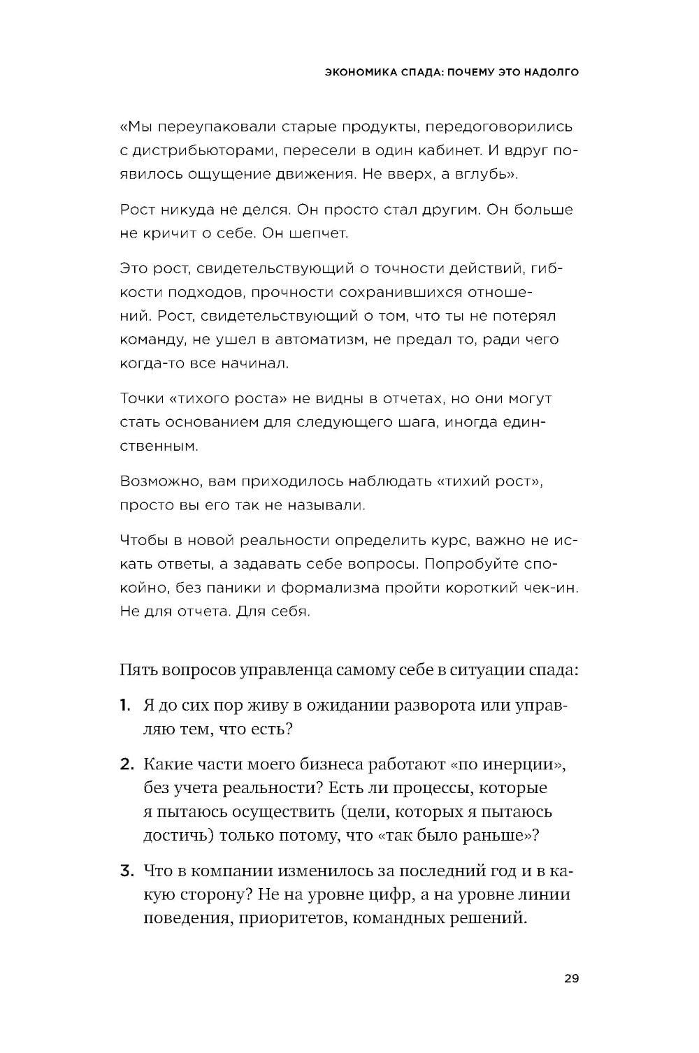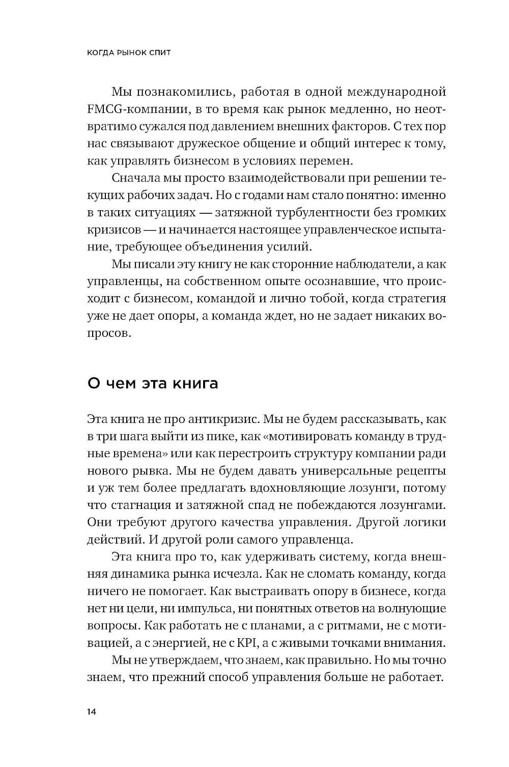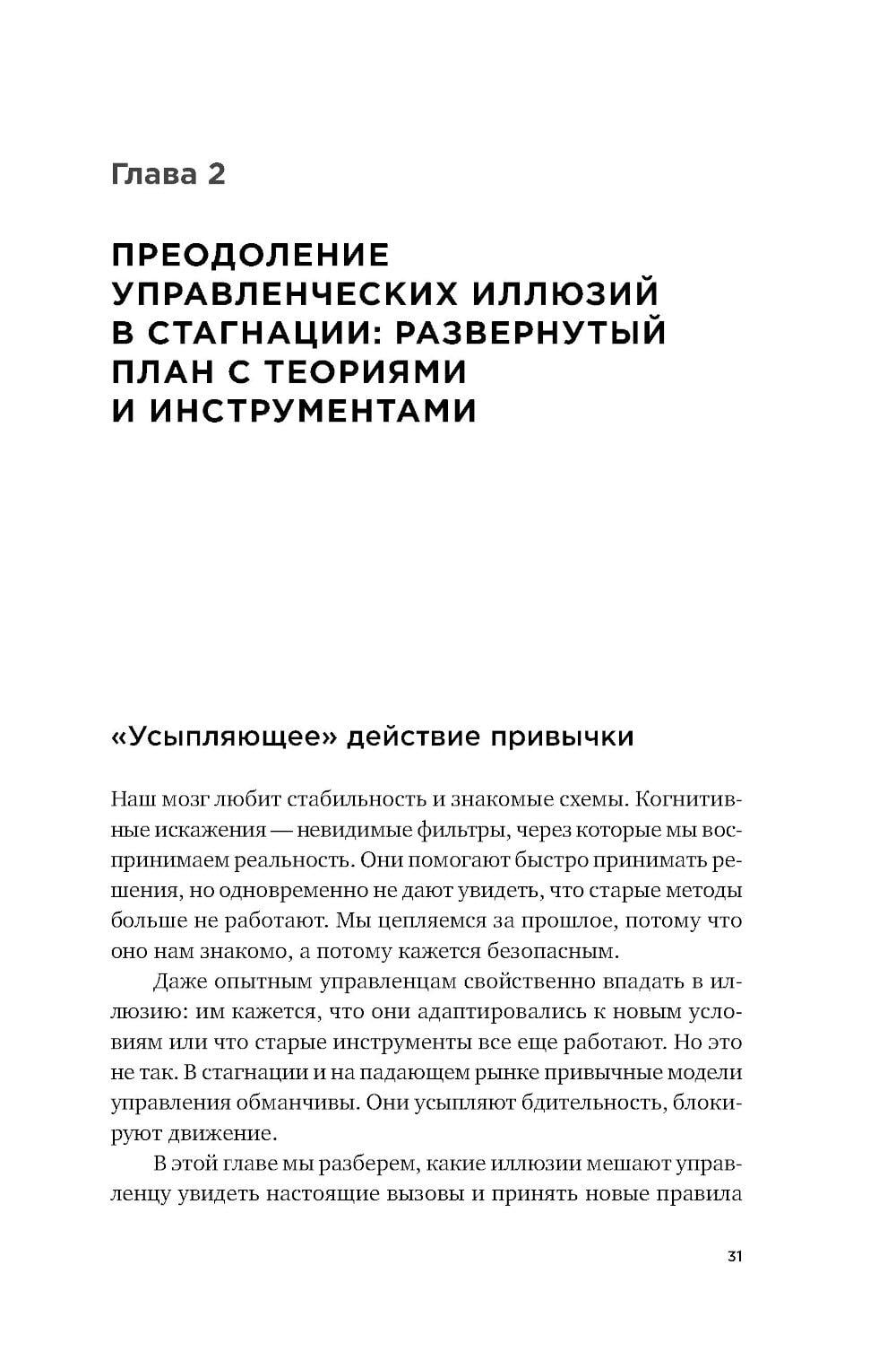 Стагнацию невозможно переждать, как временный кризис: это состояние - новая реальность для многих рынков. Сегодня компании продолжают работать, но теряют импульс: сотрудники устают без видимых причин, спрос медленно падает, привычные стратегии перестают давать результат. Авторы книги предлагают признать: старые модели управления больше не работают, и это надолго - и вместо попыток форсировать рост нужен принципиально иной подход. В основе книги лежит пошаговая методология из шести этапов - от осознания новой реальности до пересборки системы управления. Юлия Лахмоткина и Мэри Гукасян развенчивают типичные управленческие иллюзии вроде «Мы уже адаптировались», «Сейчас не время для изменений» или «Все дело в мотивации людей» - и показывают, как именно эти заблуждения усугубляют стагнацию. Особое внимание уделяется системному мышлению - умению видеть скрытые связи между решениями и результатами, петли усиления проблем и точки воздействия на систему. Прочтение книги, вероятно, изменит фокус с достижения амбициозных целей на сохранение жизнеспособности компании. Читатель узнает, почему в стагнации зрелость руководителя важнее харизмы, как усталость команды становится системным сигналом о проблемах и почему доверие превращается в главную валюту выживания. Все рекомендации основаны на реальном опыте управления крупными компаниями в условиях затяжного спада.