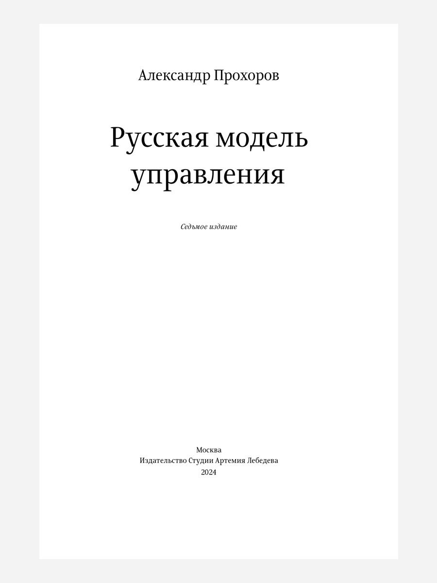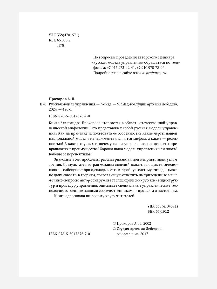 Книга Александра Прохорова вторгается в область отечественной управленческой мифологии. Что представляет собой русская модель управления? Как на практике использовать ее особенности? Какие черты нашей национальной модели менеджмента являются мифом, а какие - реальностью? В каких случаях и почему наши управленческие дефекты превращаются в преимущества? Хороша наша модель управления или плоха? Каковы ее перспективы? Знакомые всем проблемы рассматриваются под непривычным углом зрения. В результате пестрая мозаика явлений, охватывающих тысячелетнюю российскую историю, складывается в стройную систему взглядов (можно даже сказать, в теорию), позволяющую ответить на приведенные выше «вечные» вопросы. Автор обнаруживает специфически «русские» виды структур и процедур управления, описывает специальные управленческие технологии, освоенные нашими соотечественниками в прошлом и настоящем. Книга адресована широкому кругу читателей.| Издательство | Изд. Студии Артемия Лебедева |