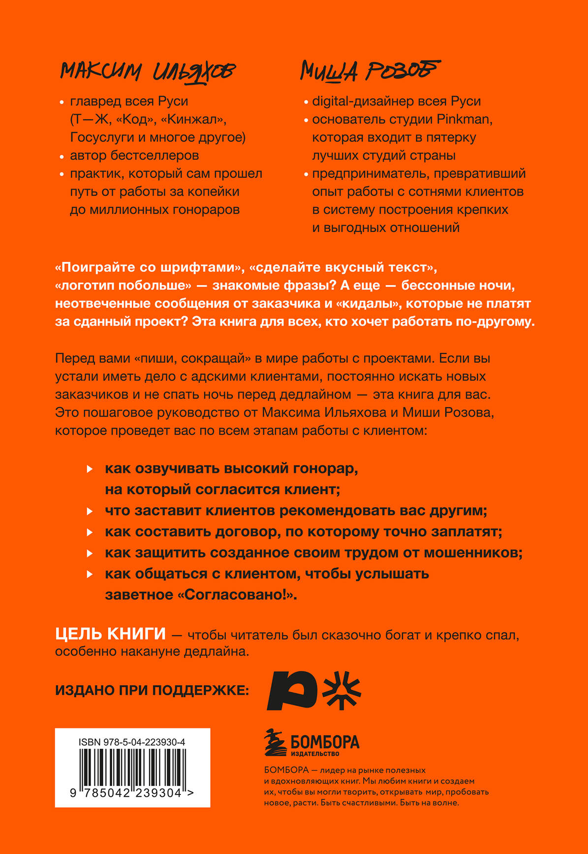 Инструкция по управлению клиентами для дизайнеров, разработчиков, копирайтеров, редакторов, иллюстраторов и всех, кто зарабатывает своим умом. «Поиграйте со шрифтами», «сделайте вкусный текст», «логотип побольше» - знакомые фразы? А еще - бессонные ночи, неотвеченные сообщения от заказчика и «кидалы», которые не платят за сданный проект? Эта книга для всех, кто хочет работать по-другому. Перед вами «Пиши, сокращай» в мире работы с проектами. Если вы устали иметь дело с адскими клиентами, постоянно искать новых заказчиков и не спать ночь перед дедлайном - эта книга для вас. Это пошаговое руководство от Максима Ильяхова и Миши Розова, которое проведет вас по всем этапам работы с клиентом: - как озвучивать высокий гонорар, на который согласится клиент; - что заставит клиентов рекомендовать вас другим; - как составить договор, по которому точно заплатят; - как защитить созданное своим трудом от мошенников; - как общаться с клиентом, чтобы услышать заветное «Согласовано!». Цель книги - чтобы читатель был сказочно богат и крепко спал, особенно накануне дедлайна. Авторы книги: Максим Ильяхов - главред всея Руси (Т-Ж, «Код», «Кинжал», Госуслуги и многое другое), автор бестселлеров, практик, который сам прошел путь от работы за копейки до миллионных гонораров. Миша Розов - digital-дизайнер всея Руси, основатель студии Pinkman, входит в пятерку лучших студий страны, предприниматель, превративший опыт работы с сотнями клиентов в понятную систему построения крепких и выгодных отношений.| Издательство | ООО "Издательство "Эксмо" |