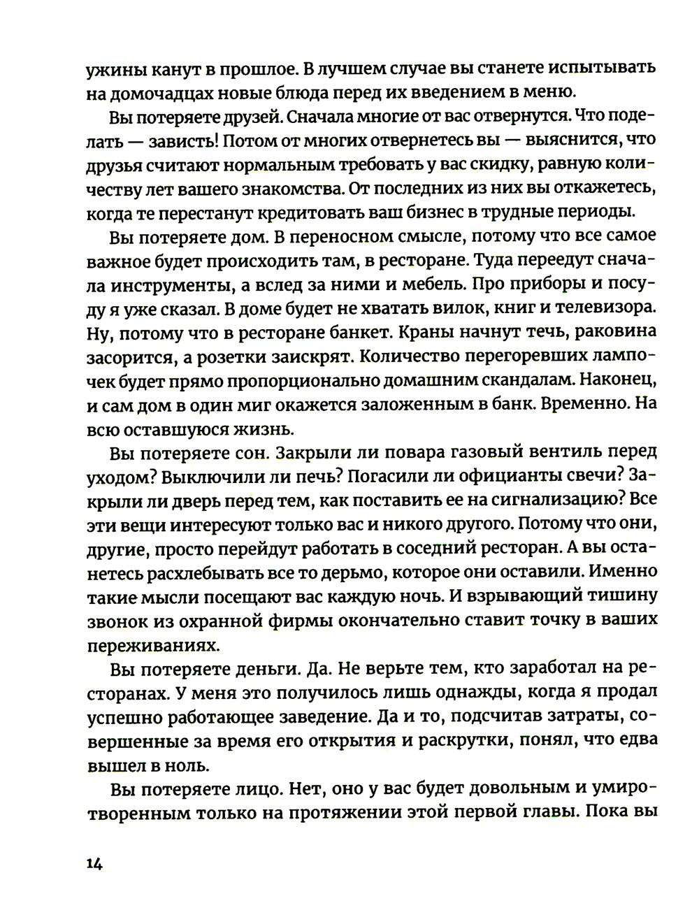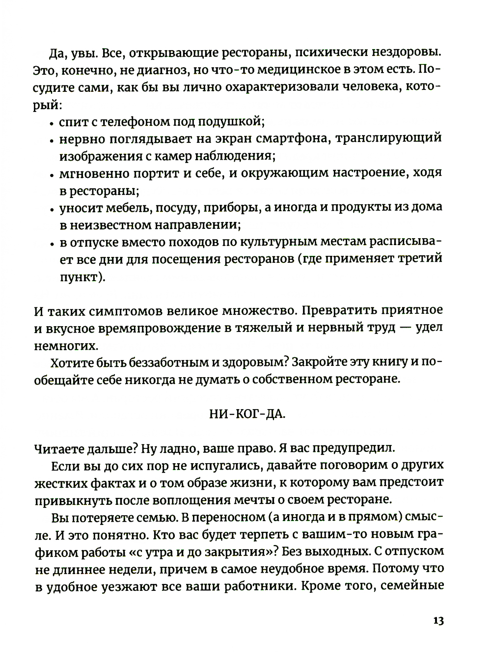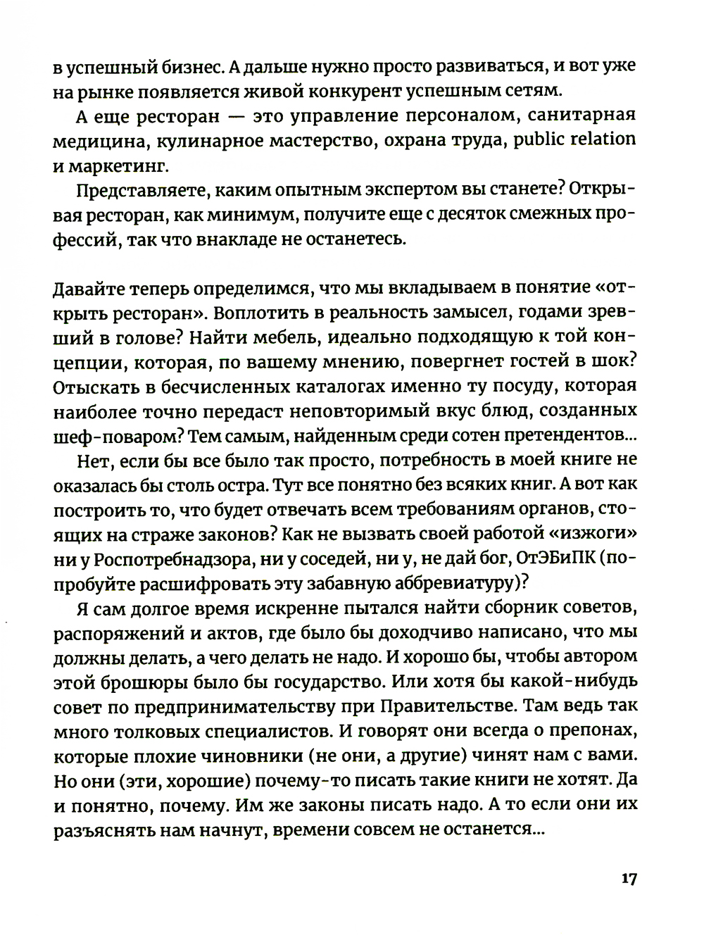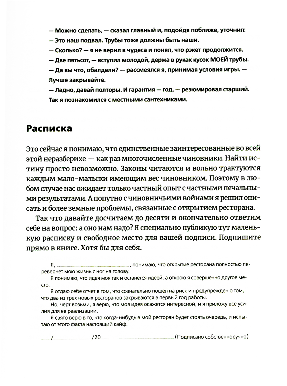 Планируете открыть свой первый ресторан? Сначала прочитайте эту книгу! Вместе с известным российским ресторатором, автором бестселлеров по созданию и управлению ресторанным бизнесом, вы пройдете весь путь к открытию собственного заведения - от рождения идеи до первых гостей. Путь этот извилист и непрост, но опытный гид проведет вас по нему максимально безопасно - расскажет, на что обратить внимание, даст практические советы, предупредит о ловушках, предостережет от ошибок. А если на каком-то этапе вам станет совсем тяжело (как известно, строительство ресторана легким не бывает), развлечет вас забавными историями и поучительными байками из своего профессионального опыта. Пожалуй, это самая полезная и веселая книга об открытии ресторана, которая когда-либо выходила в нашей стране.| Издательство | Изд.Река |