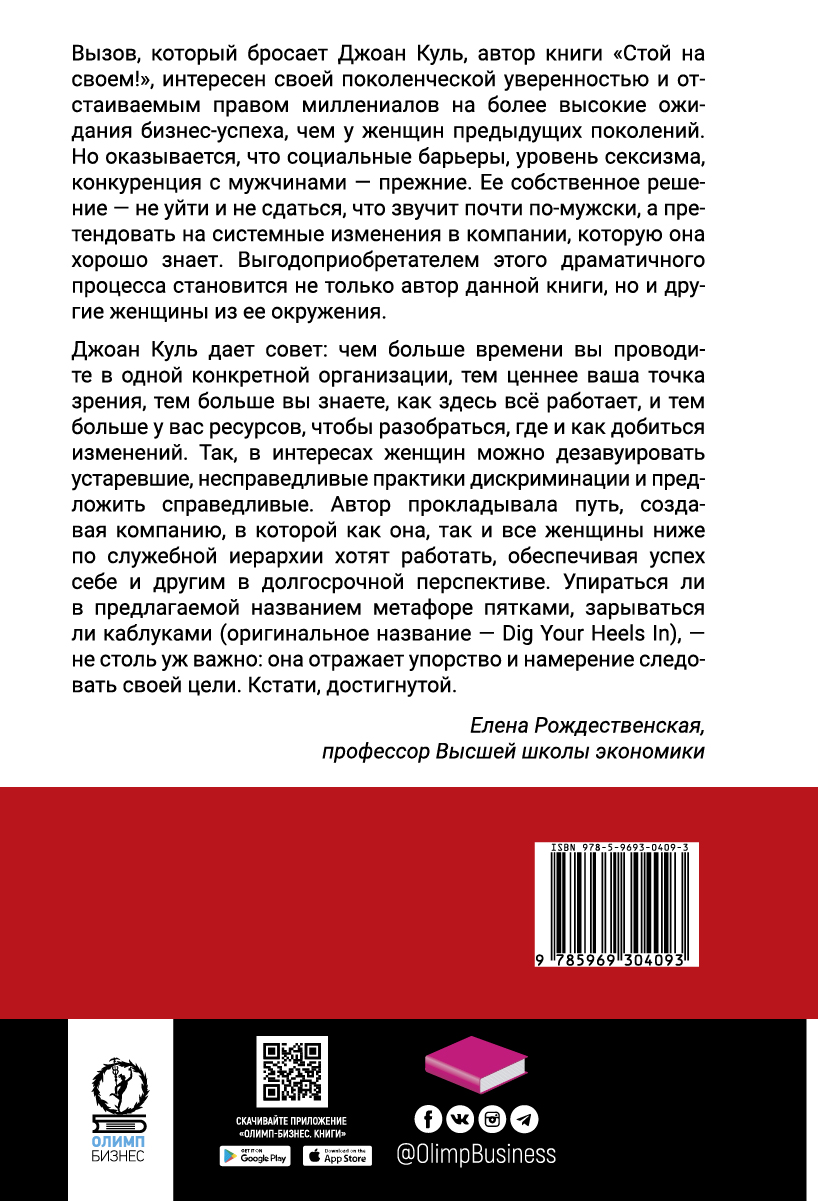 «Стой на своем!» - это руководство для женщин, настроенных на карьерный рост, которое создала и в течение многих лет внедряла в разных компаниях Джоан Куль. Следуя этой программе, можно избавить компанию от сексистских представлений о тендере и лидерстве, побороть в себе синдром самозванца и подняться по служебной лестнице. Джоан Куль показывает, как спланировать карьеру, доказать свою компетентность и где искать поддержку. Создание эффективного нетворкинга, подбор группы союзников, менторство и обязательная обратная связь - вот залог успеха. Джоан обращается и к важной «женской теме» - как работать в полную силу и не забывать о семье, материнстве и личной жизни. Книга адресована тем женщинам, кто стремится обрести уверенность в себе и хочет занять кресло руководителя.| Издательство | Олимп-Бизнес |