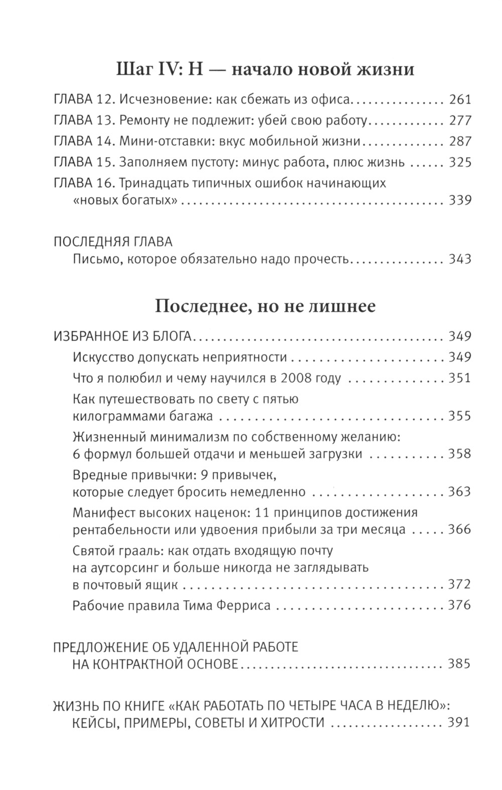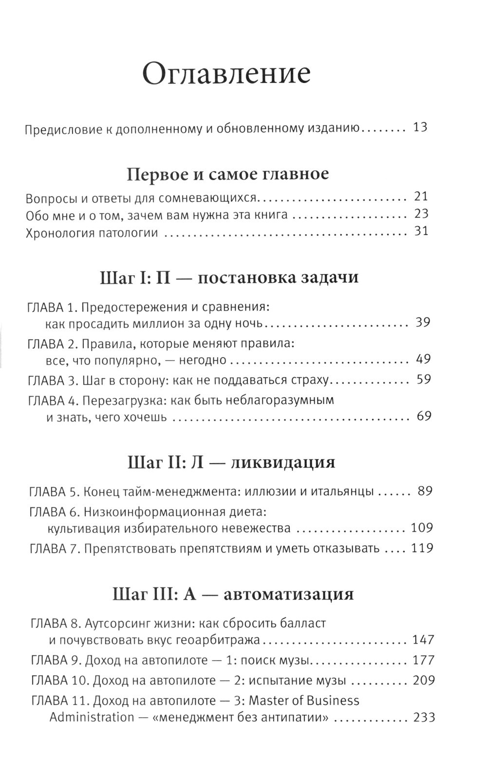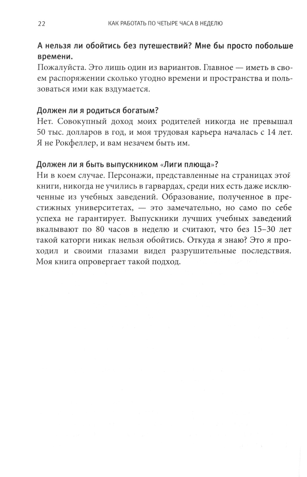 Если вы хотите освободиться от офисного рабства, мечтаете объездить весь мир, много зарабатывать, не жертвуя собой, или просто больше получать удовольствие от жизни и меньше работать, эта книга станет для вас руководством к действию. Прочитав эту книгу, вы сможете: • увеличить свой ежемесячный доход в десятки раз, отдав на аутсорсинг неприятную часть своей жизни; • путешествовать по миру свободно и дешево, не бросая работу и находя бесплатное жилье в любой стране; • управлять своим бизнесом из любой точки мира. Новое дополненное издание содержит: • более 100 страниц новых материалов - еще больше ресурсов, инструментов и "фишек" для тех, кто хочет работать по 4 часа в неделю; • более 50 реальных историй успеха читателей этой книги, которые стали работать по 4 часа в неделю; • шаблоны и приемы, помогающие полностью передать обработку электронной почты на аутсорсинг, путешествовать по всему миру всего с пятью килограммами багажа, успешно вести переговоры с начальством о переходе на удаленную работу, радикально повысить рентабельность бизнеса и эффективность работы с клиентами, и даже обзавестись личным шеф-поваром, обед которого обойдется менее чем в 8 долларов.