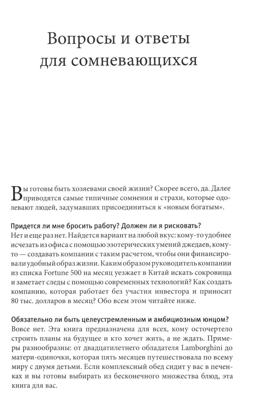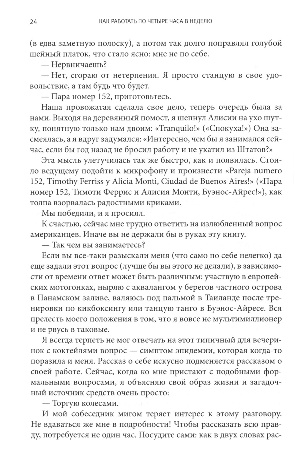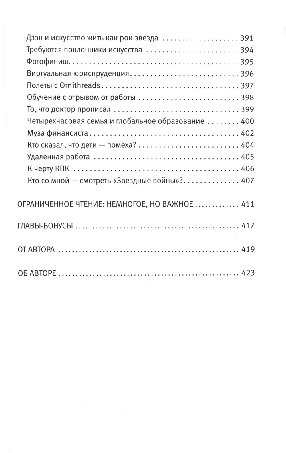 Если вы хотите освободиться от офисного рабства, мечтаете объездить весь мир, много зарабатывать, не жертвуя собой, или просто больше получать удовольствие от жизни и меньше работать, эта книга станет для вас руководством к действию. Прочитав эту книгу, вы сможете: • увеличить свой ежемесячный доход в десятки раз, отдав на аутсорсинг неприятную часть своей жизни; • путешествовать по миру свободно и дешево, не бросая работу и находя бесплатное жилье в любой стране; • управлять своим бизнесом из любой точки мира. Новое дополненное издание содержит: • более 100 страниц новых материалов - еще больше ресурсов, инструментов и "фишек" для тех, кто хочет работать по 4 часа в неделю; • более 50 реальных историй успеха читателей этой книги, которые стали работать по 4 часа в неделю; • шаблоны и приемы, помогающие полностью передать обработку электронной почты на аутсорсинг, путешествовать по всему миру всего с пятью килограммами багажа, успешно вести переговоры с начальством о переходе на удаленную работу, радикально повысить рентабельность бизнеса и эффективность работы с клиентами, и даже обзавестись личным шеф-поваром, обед которого обойдется менее чем в 8 долларов.