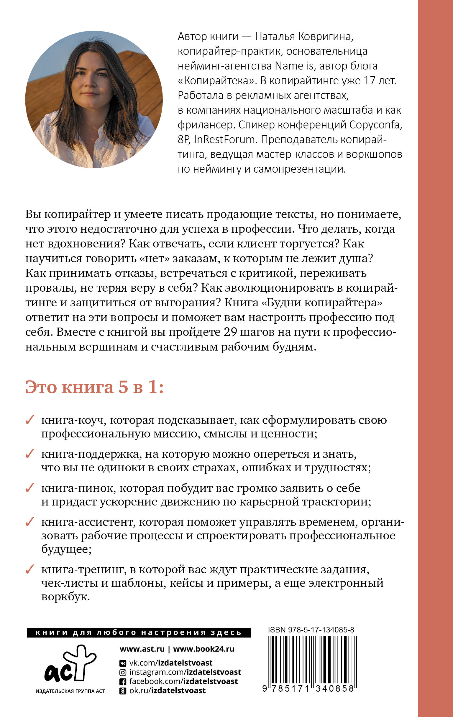 Вы копирайтер и умеете писать продающие тексты, но понимаете, что этого недостаточно для успеха в профессии. Что делать, когда нет вдохновения? Как отвечать, если клиент торгуется? Как научиться говорить "нет" заказам, к которым не лежит душа? Как принимать отказы, встречаться с критикой, переживать провалы, не теряя веру в себя? Как эволюционировать в копирайтинге и защититься от выгорания? Книга "Будни копирайтера" ответит на эти вопросы и поможет вам настроить профессию под себя. Вместе с книгой вы пройдете 29 шагов на пути к профессиональным вершинам и счастливым рабочим будням. Это книга 5 в 1: - книга-коуч, которая подсказывает, как сформулировать свою профессиональную миссию, смыслы и ценности; - книга-поддержка, на которую можно опереться и знать, что вы не одиноки в своих страхах, ошибках и трудностях; - книга-пинок, которая побудит вас громко заявить о себе и придаст ускорение движению по карьерной траектории; - книга-ассистент, которая поможет управлять временем, организовать рабочие процессы и спроектировать профессиональное будущее; - книга-тренинг, в которой вас ждут практические задания, чек-листы и шаблоны, кейсы и примеры, а еще электронный воркбук. Автор книги - Наталья Ковригина, копирайтер-практик, основательница нейминг-агентства Name is, автор блога "Копирайтека". В копирайтинге уже 17 лет. Работала в рекламных агентствах, в компаниях национального масштаба и как фрилансер. Спикер конференций Copyconfa, 8P, InRestForum. Преподаватель копирайтинга, ведущая мастер-классов и воркшопов по неймингу и самопрезентации.| Издательство | ИЗДАТЕЛЬСТВО "АСТ" |