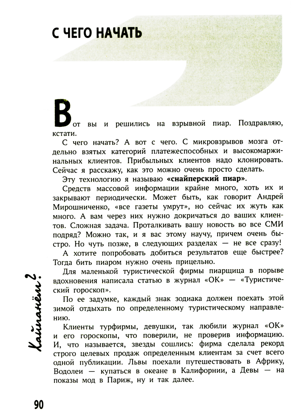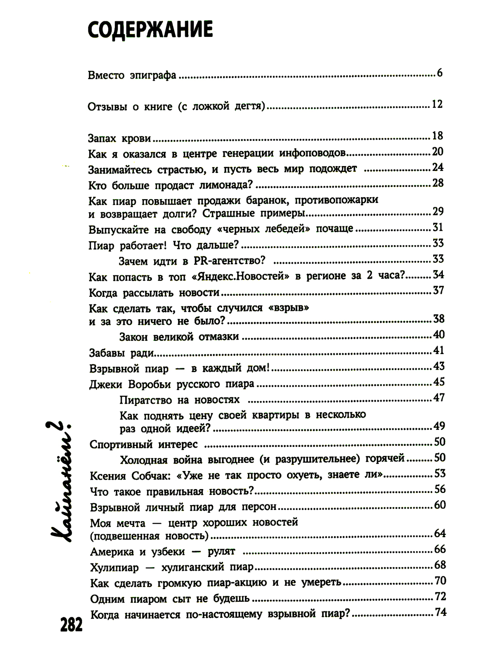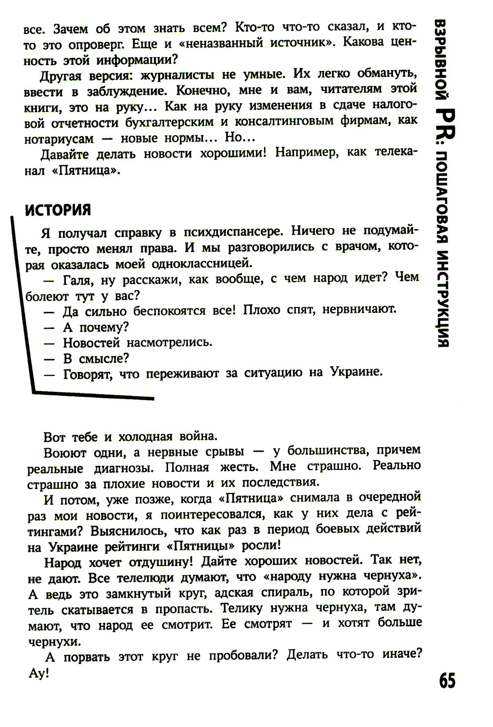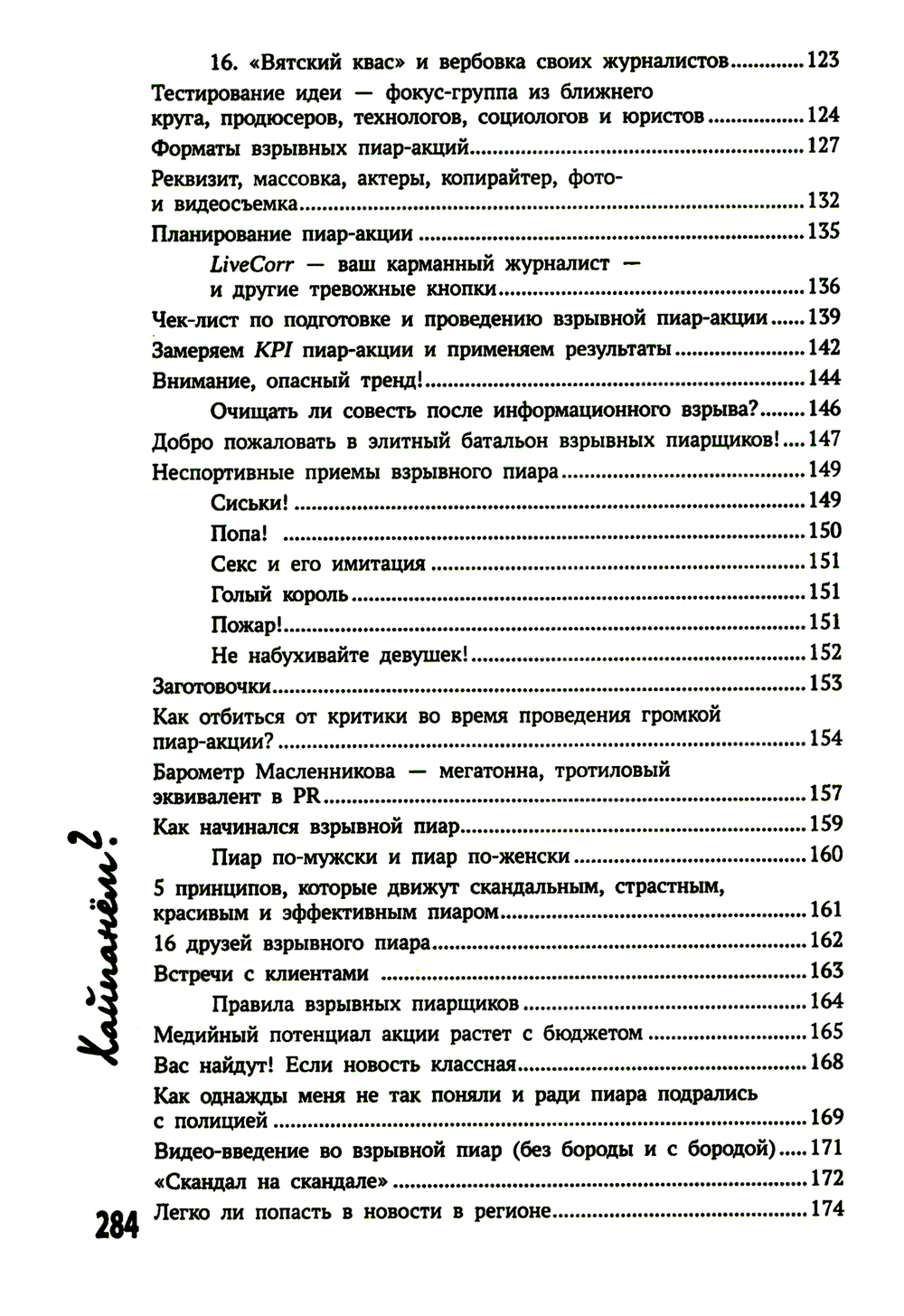 Это - книга-сенсация. Это книга-хайп. Это книга-скандал. Все хотят и прогреметь на всю страну или на весь мир, но так, чтобы «за это ничего не было». Впервые широкой публике представляется практическое руководство по управляемому (!) информационному взрыву и вирусному маркетингу. Каждый день человек видит 2 млн брендов, месседжей, смыслов. Из них осознается не более 2000. Но деньги человек отдаёт не всем! И принимает ключевые послания не больше чем от 10-100 брендов. Шум? Шум! Шум!!! Как выделиться среди перенасыщенного медиаполя? Не скажу, что легко. В общем-то, все просто, но решиться на это нелегко. Сначала стрессануть и пожертвовать репутацией в моменте, но выиграть стратегически. Главное не бояться выйти за рамки. - Как придумать Идею, которая раскрутит себя сама? - Как протащить бренд в СМИ без рекламных вложений? - Как победить конкурентов в головах клиентов, когда у вас только мозги, а у них большие бюджеты? - Как на «красном рынке» получить дополнительное преимущество - информационное лидерство? Вы знаете историю банка, про который все думают, что он в топ-5, а он в топ-100 на самом деле. Сила маркетинга и пиара! После этой книги вы будете не только смотреть на новости иначе, но и научитесь делать их. Миссия автора - сделать так, чтобы позитивных новостей в мире и в России было больше! Вы с нами? Скорее читайте книгу и применяйте ее тайные магические знания.| Издательство | Феникс |
