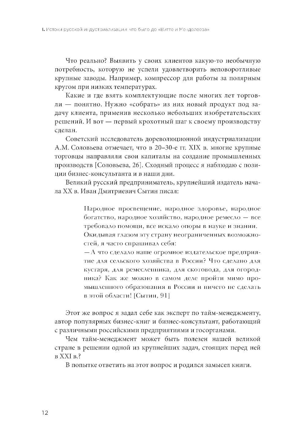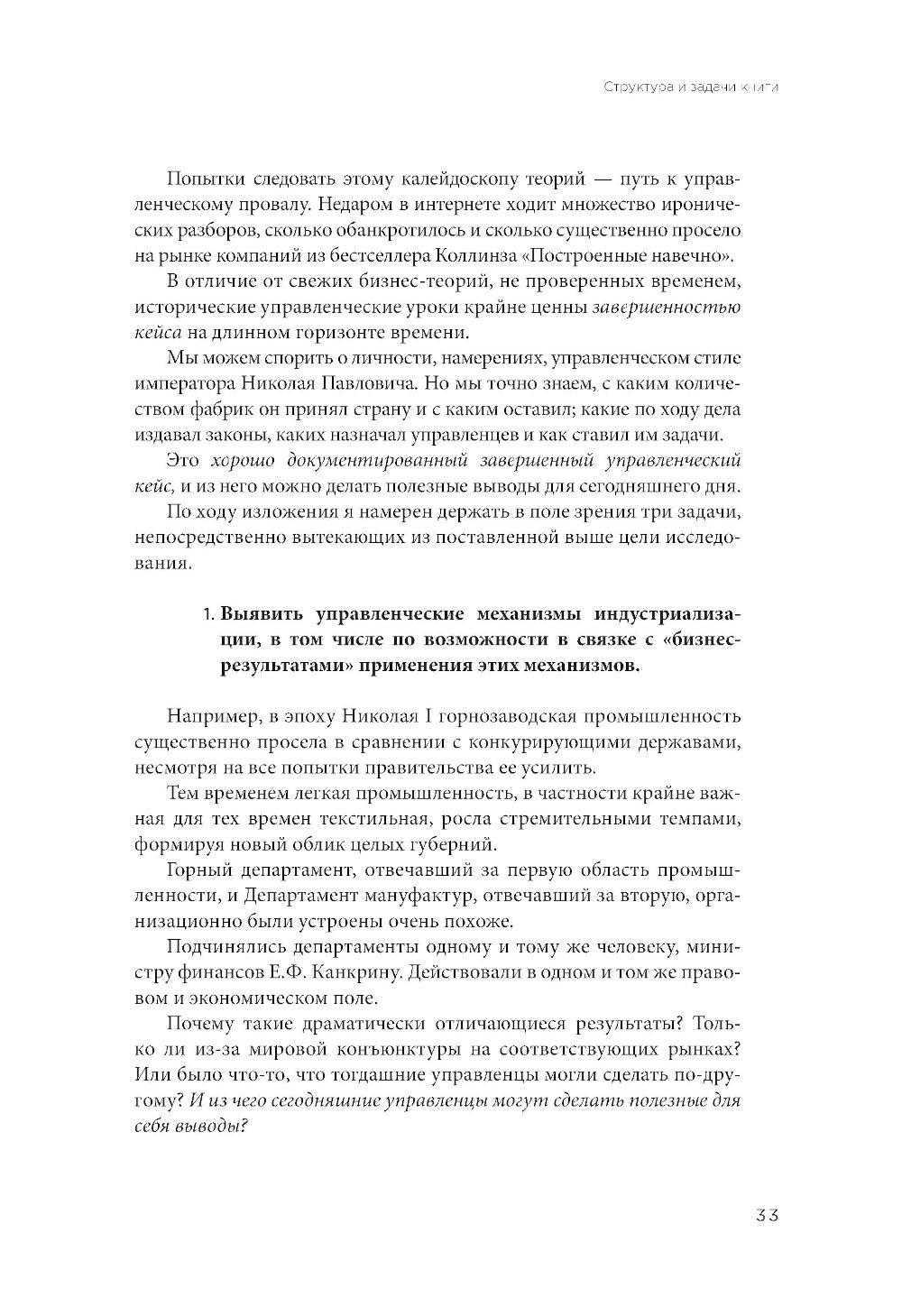 Наша страна сейчас проходит период новой индустриализации, сопоставимой по масштабу с имперской индустриализацией XIX века. и советской первой половины XX века. Мы можем получить много полезных управленческих уроков от наших великих предков. Автор рассматривает первую имперскую индустриализацию под особым углом: с точки зрения управленческих инструментов. Как управляли промышленным ростом государственные органы - Комитет министров, Госсовет, Департамент мануфактур, губернаторы? Какими документами руководствовались лидеры промышленной революции, как они протоколировали совещания, как контролировали исполнение задач? Через какие мануфактурные и коммерческие советы выстраивали взаимодействие с бизнесом? Как распределяли госсубсидии и льготы среди промышленников? В каждой главе сопоставляются подходы, характерные для трех индустриализаций, делаются выводы, полезные для управленцев нашего времени. Книга опирается на значительное количество архивных первоисточников, при этом написана доступным живым языком.| Издательство | Альпина ПРО |