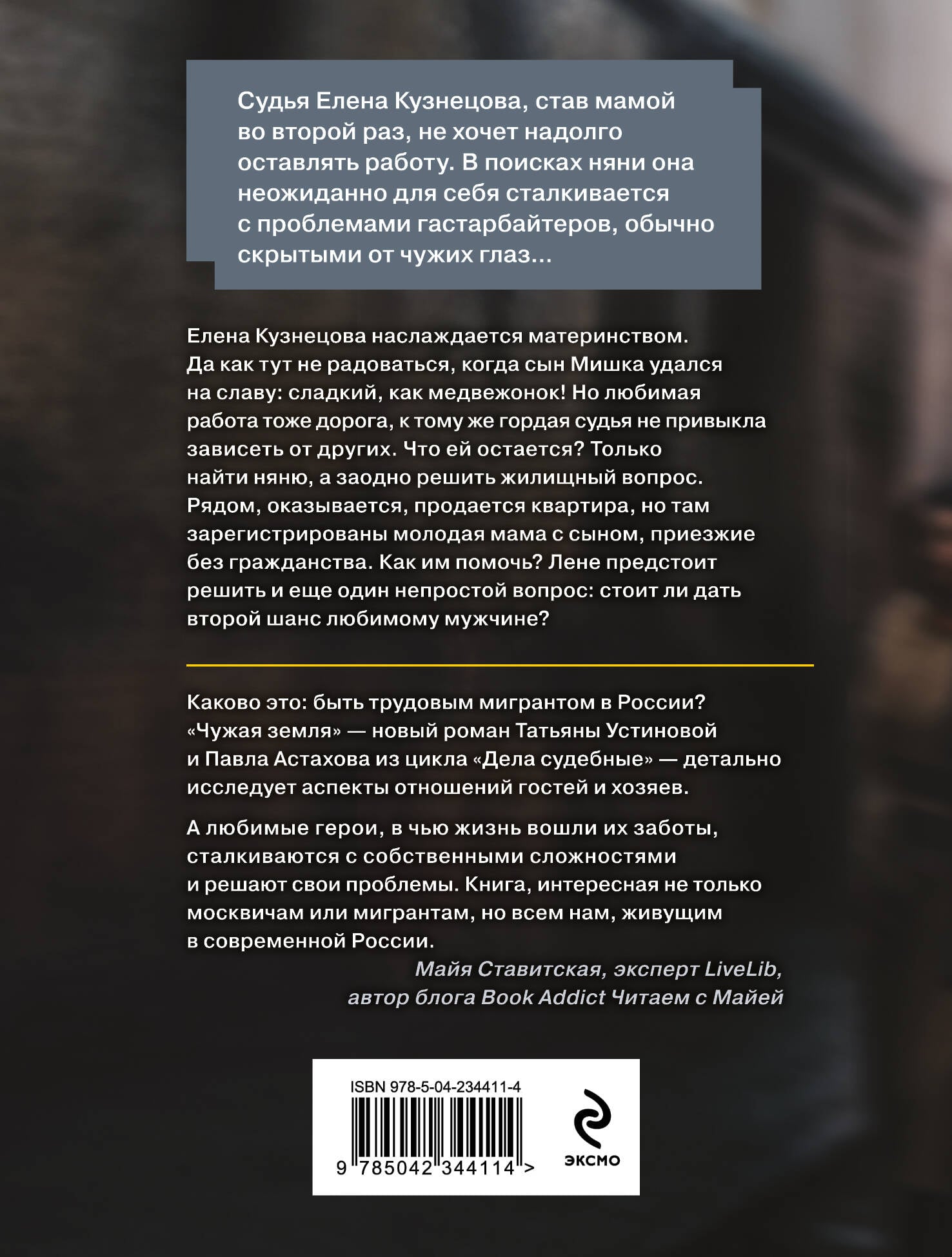Судья Елена Кузнецова, став мамой во второй раз, не хочет надолго оставлять работу. В поисках няни она неожиданно для себя сталкивается с проблемами гастарбайтеров, обычно скрытыми от чужих глаз... Елена Кузнецова наслаждается материнством. Да как тут не радоваться, когда сын Мишка удался на славу: сладкий, как медвежонок! Но любимая работа тоже дорога, к тому же гордая судья не привыкла зависеть от других. Что ей остается? Только найти няню, а заодно решить жилищный вопрос. Рядом, оказывается, продается квартира, но там зарегистрирована молодая мама с сыном, приезжие без гражданства. Как им помочь? Лене предстоит решить и еще один непростой вопрос: стоит ли дать второй шанс любимому мужчине? Новый остросюжетный роман Татьяны Устиновой и Павла Астахова из авторского цикла «Дела судебные» - это увлекательное чтение, где житейские истории переплетаются с судебными делами.