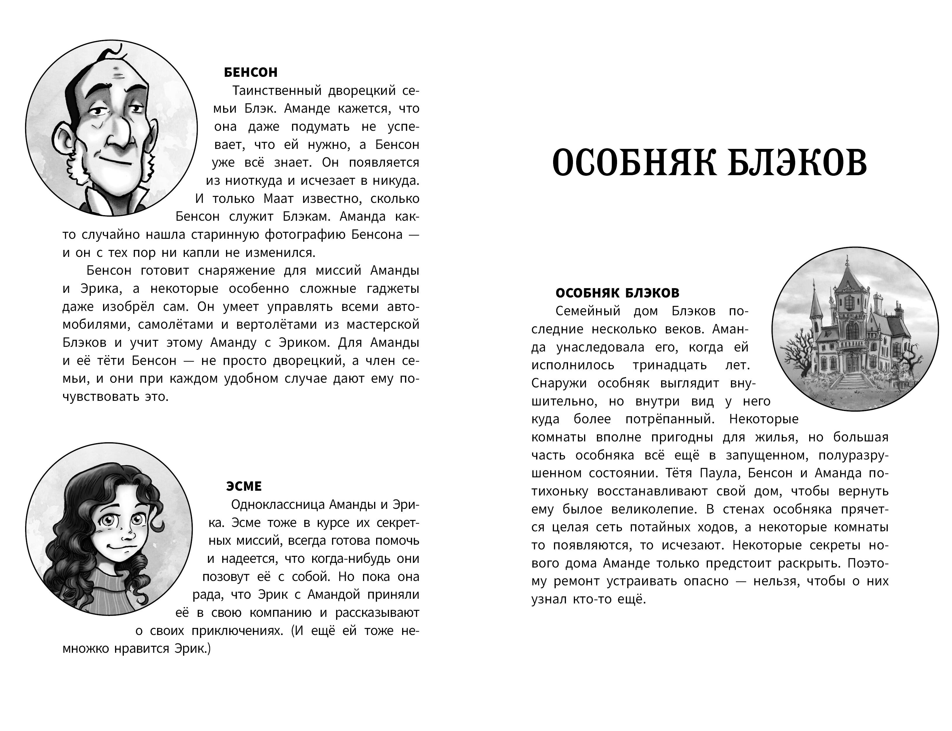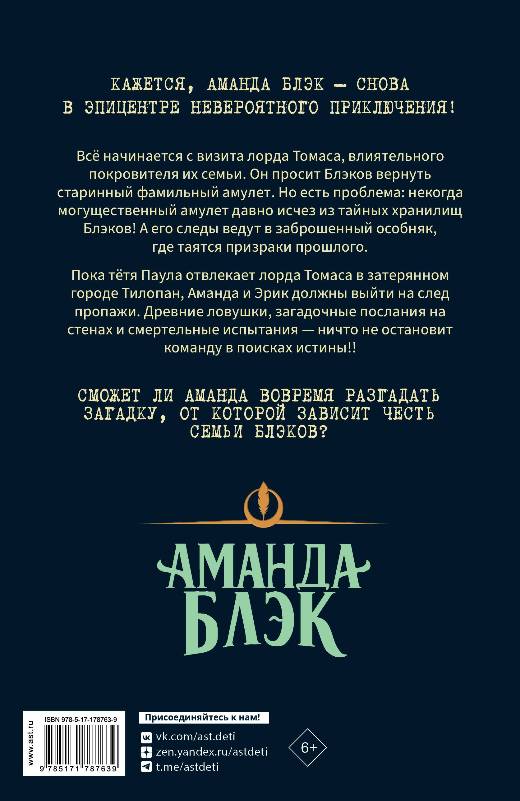 Кажется, Аманда Блэк - снова в эпицентре невероятного приключения! Всё начинается с визита лорда Томаса, влиятельного покровителя их семьи. Он просит Блэков вернуть старинный фамильный амулет. Но есть проблема: некогда могущественный амулет давно исчез из тайных хранилищ Блэков! А его следы ведут в заброшенный особняк, где таятся призраки прошлого. Пока тётя Паула отвлекает лорда Томаса в затерянном городе Тилопан, Аманда и Эрик должны выйти на след пропажи. Древние ловушки, загадочные послания на стенах и смертельные испытания - ничто не остановит команду в поисках истины! Сможет ли Аманда вовремя разгадать загадку, от которой зависит честь семьи Блэков?| Издательство | Издательство "АСТ" |