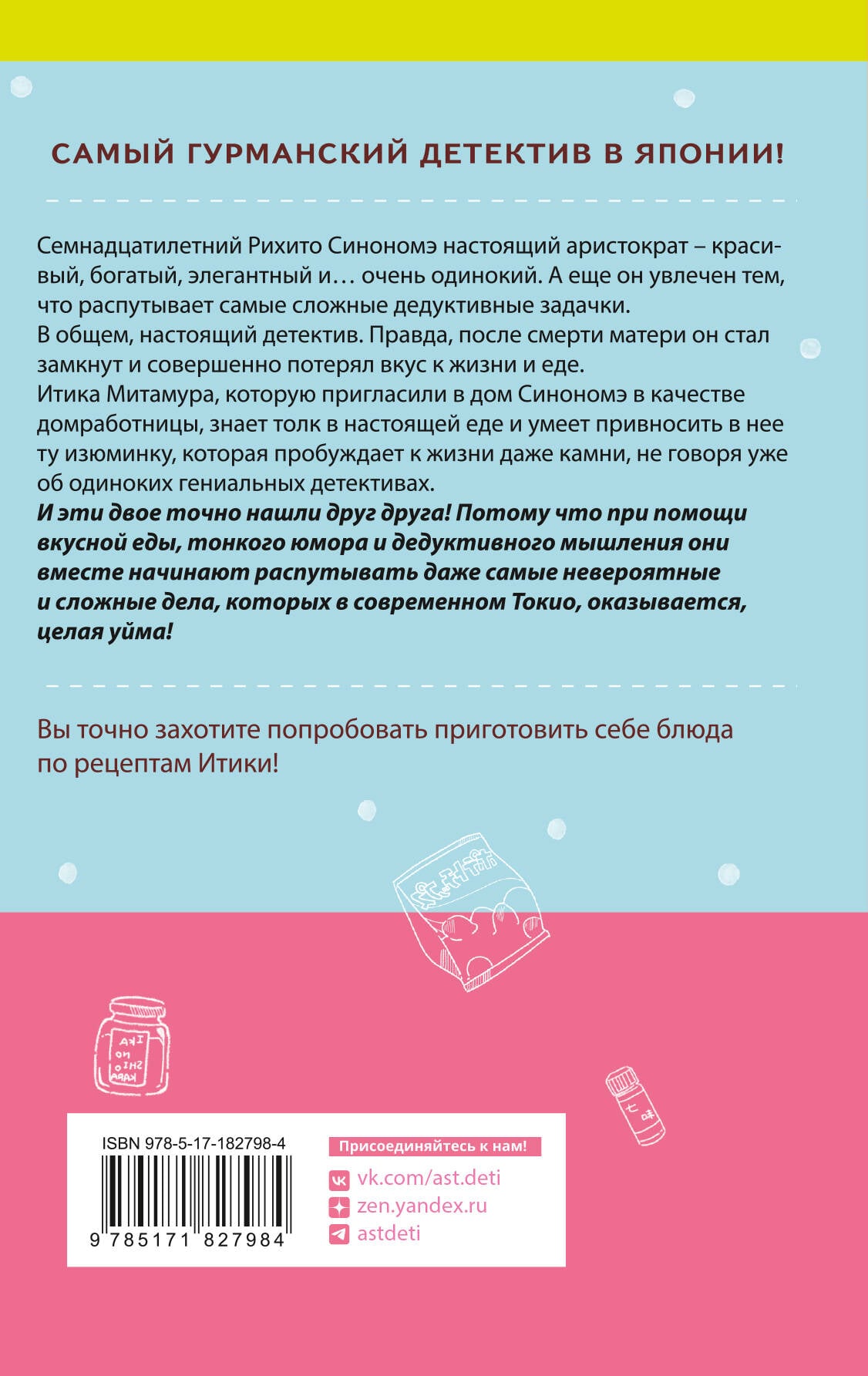 Семнадцатилетний Рихито Синономэ настоящий аристократ - красивый, богатый, элегантный и… очень одинокий. А еще он увлечен тем, что распутывает самые сложные дедуктивные задачки. В общем, настоящий детектив. Правда, после смерти матери он стал замкнут и совершенно потерял вкус к жизни и еде. Итика Митамура, которую пригласили в дом Синономэ в качестве кухарки, знает толк в настоящей еде и умеет привносить в нее ту изюминку, которая пробуждает к жизни даже камни, не говоря уже гениальных детективах. И эти двое точно нашли друг друга! Потому что при помощи вкусной еды, тонкого юмора и дедуктивного мышления они вместе начинают распутывать даже самые невероятные и сложные дела, которых в современном Токио оказывается целая уйма! Вы точно захотите попробовать приготовить себе блюда по рецептам Итики!| Издательство | Издательство "АСТ" |