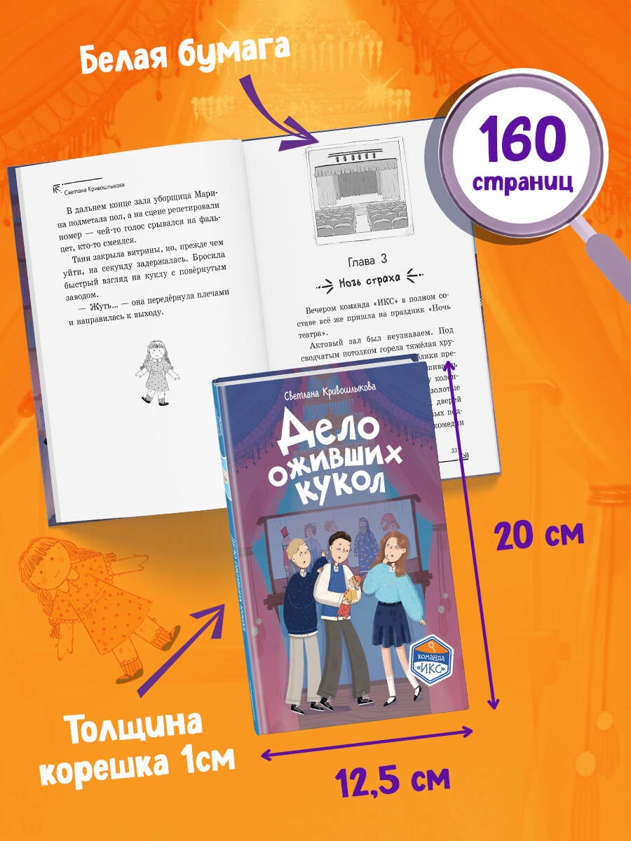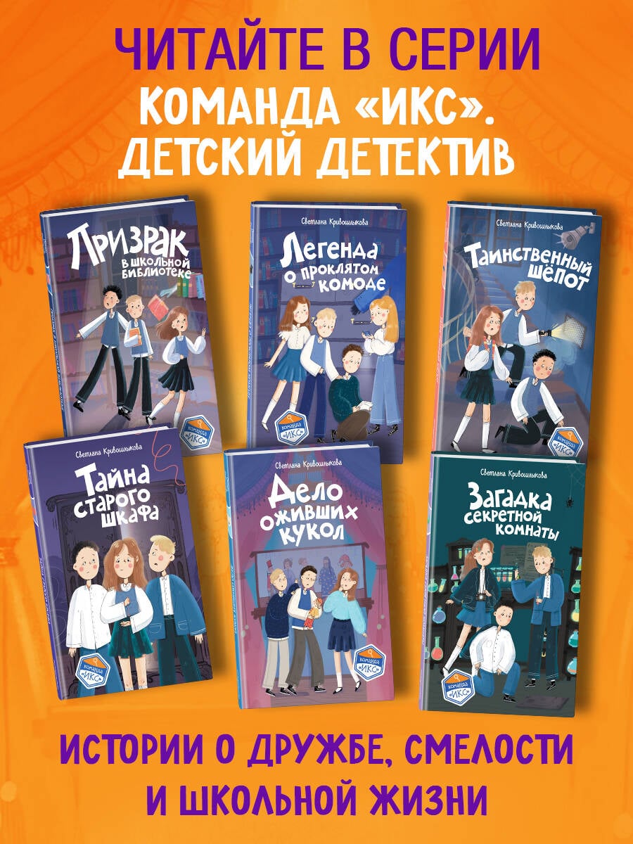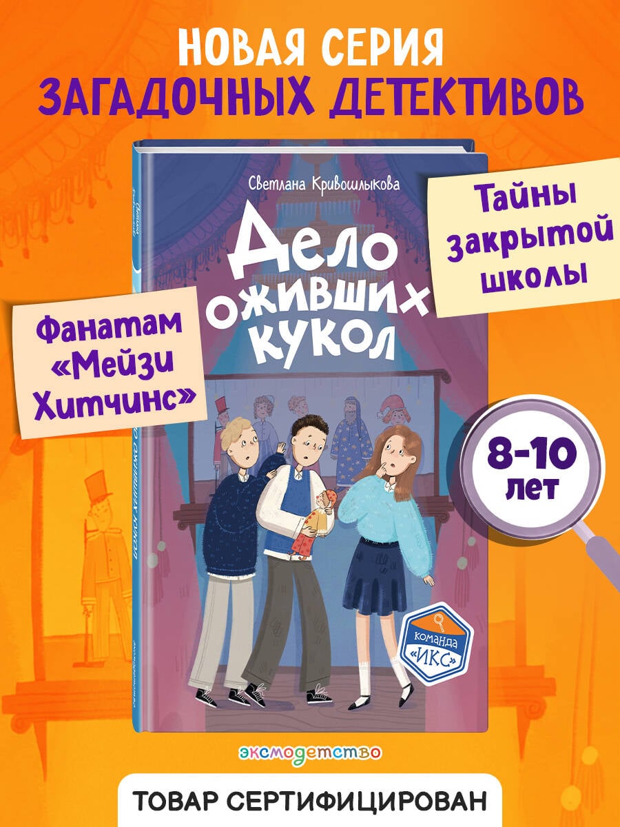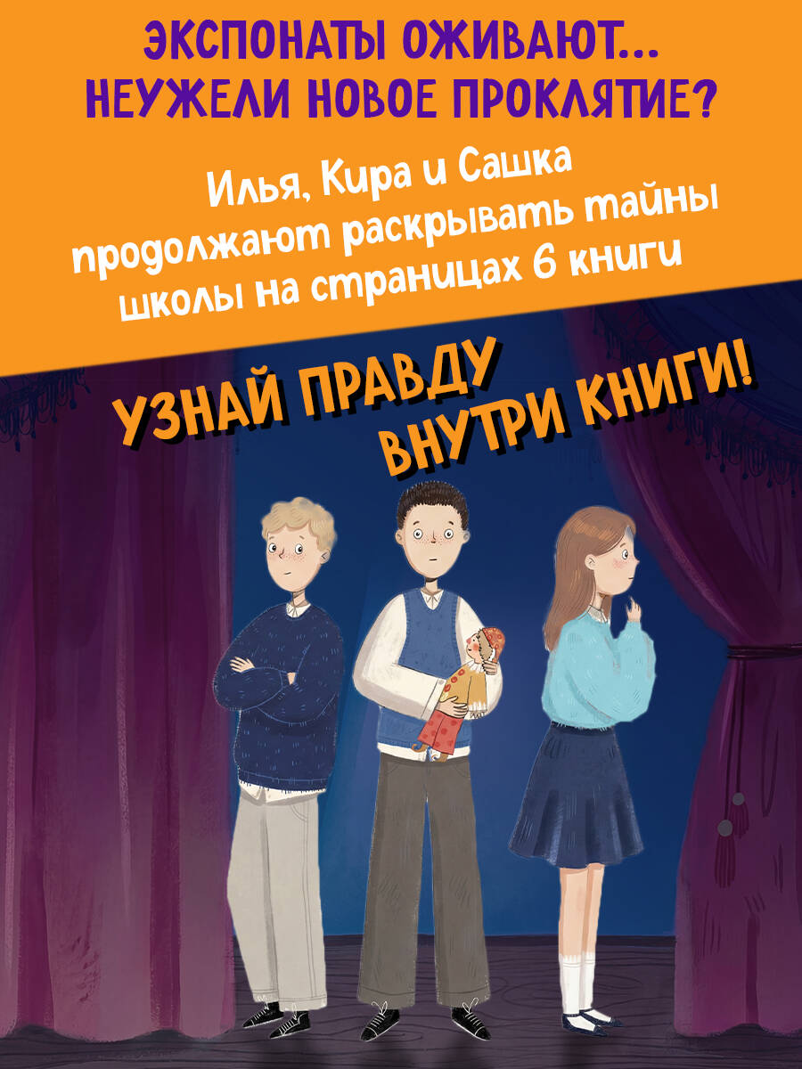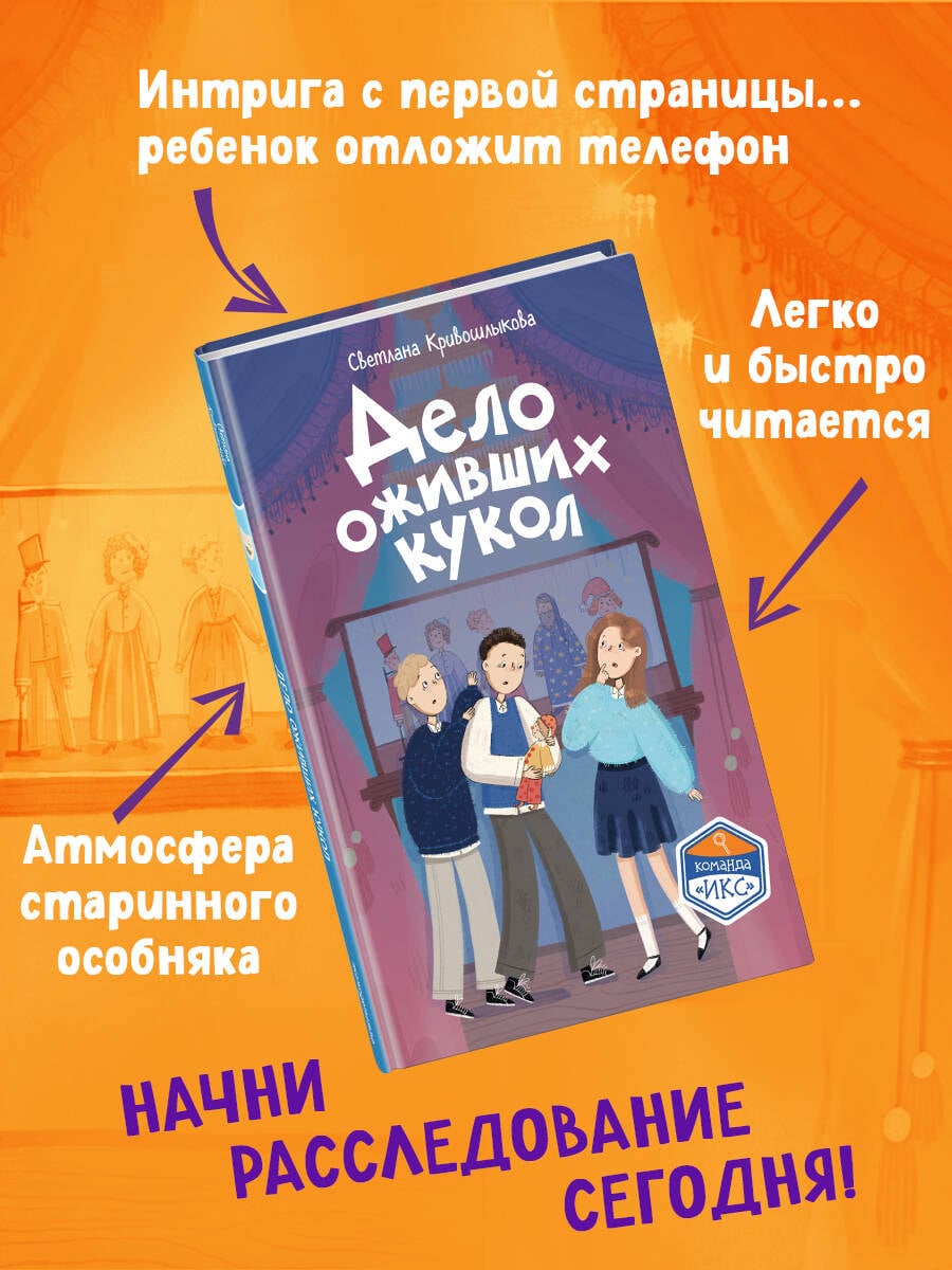 Новая детективная серия для поклонников «Чёрного котёнка» и «Мейзи Хитчинс»! Добро пожаловать в школу-пансион с вековой историей, где за старинными стенами скрываются самые необычные тайны! Светлана Кривошлыкова - автор многочисленных книг для детей и подростков, победитель литературного конкурса «Open Eurasia-2018», председатель Союза детских и юношеских писателей. Трое друзей - Илья, Кира и Сашка - объединяются в команду «ИКС», чтобы расследовать загадочные события. Они учатся, дружат, ссорятся и мирятся… а ещё - берутся за дела, от которых даже у учителей бегут мурашки! Действие историй разворачивается в уникальном месте - школе-пансионе, расположенной в бывшей купеческой усадьбе девятнадцатого века. Светлана Кривошлыкова мастерски описала загадочную атмосферу старинного здания и тайны, хранящиеся в нём. Соединение духа закрытого пансиона с современной жизнью обычных школьников делает чтение увлекательным, а раскрытие тайн - запоминающимся. В школе готовятся к «Ночи театра», но шумное веселье внезапно прерывается. Главные экспонаты актового зала - старинные куклы купца Платонова - оживают! Неужели над школой нависло новое проклятие? Или кто-то захотел подшутить над учениками? Команде «ИКС» необходимо во всём разобраться. Сможет ли команда «ИКС» разгадать тайну оживших кукол? История внутри каждой книги закончена: одна книга - одна загадка. Книги серии можно читать как отдельно друг от друга, так и вместе. Книги рассчитаны на детей от 8 лет и старше. Подойдут для внеклассного чтения. Ребёнок не устанет читать: в книгах крупный шрифт, белая бумага, запоминающееся оформление.| Издательство | ООО "Издательство "Эксмо" |