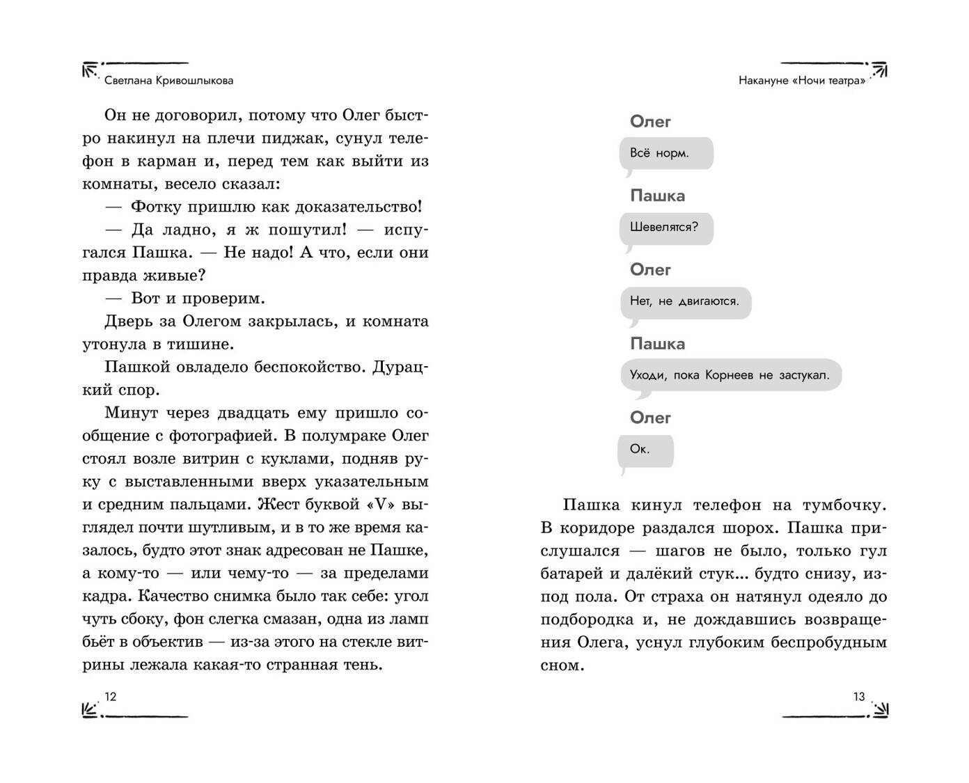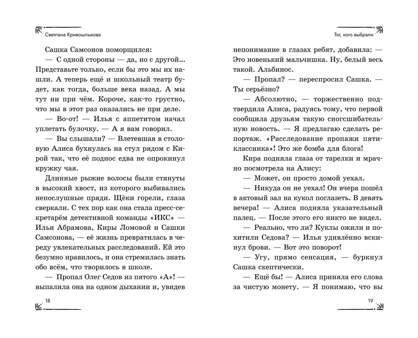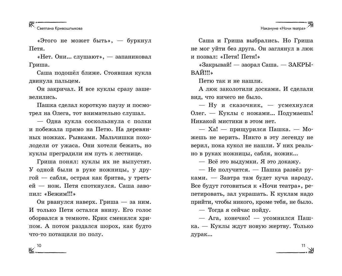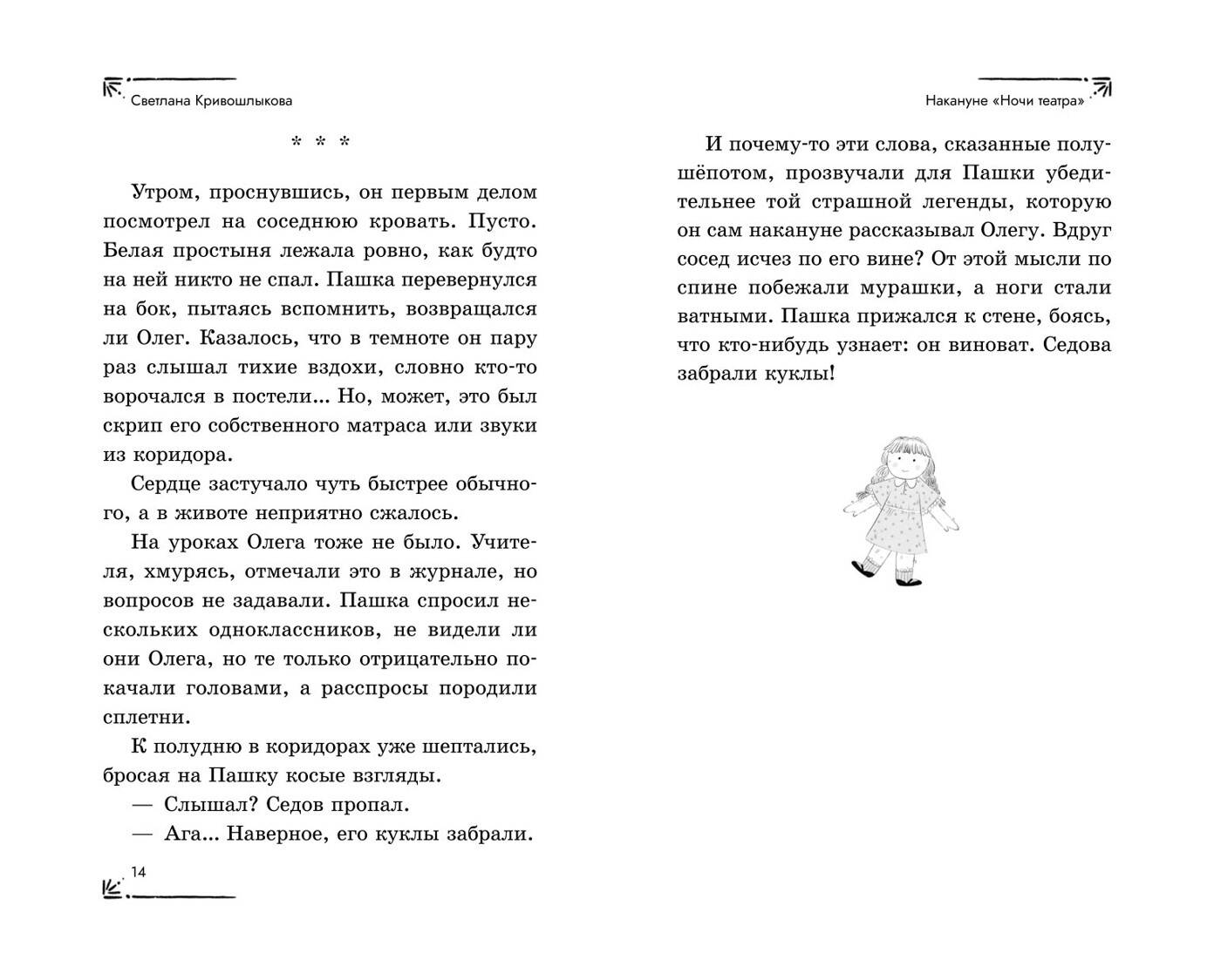 Новая детективная серия для поклонников «Чёрного котёнка» и «Мейзи Хитчинс»! Добро пожаловать в школу-пансион с вековой историей, где за старинными стенами скрываются самые необычные тайны! Светлана Кривошлыкова - автор многочисленных книг для детей и подростков, победитель литературного конкурса «Open Eurasia-2018», председатель Союза детских и юношеских писателей. Трое друзей - Илья, Кира и Сашка - объединяются в команду «ИКС», чтобы расследовать загадочные события. Они учатся, дружат, ссорятся и мирятся… а ещё - берутся за дела, от которых даже у учителей бегут мурашки! Действие историй разворачивается в уникальном месте - школе-пансионе, расположенной в бывшей купеческой усадьбе девятнадцатого века. Светлана Кривошлыкова мастерски описала загадочную атмосферу старинного здания и тайны, хранящиеся в нём. Соединение духа закрытого пансиона с современной жизнью обычных школьников делает чтение увлекательным, а раскрытие тайн - запоминающимся. В школе готовятся к «Ночи театра», но шумное веселье внезапно прерывается. Главные экспонаты актового зала - старинные куклы купца Платонова - оживают! Неужели над школой нависло новое проклятие? Или кто-то захотел подшутить над учениками? Команде «ИКС» необходимо во всём разобраться. Сможет ли команда «ИКС» разгадать тайну оживших кукол? История внутри каждой книги закончена: одна книга - одна загадка. Книги серии можно читать как отдельно друг от друга, так и вместе. Книги рассчитаны на детей от 8 лет и старше. Подойдут для внеклассного чтения. Ребёнок не устанет читать: в книгах крупный шрифт, белая бумага, запоминающееся оформление.| Издательство | ООО "Издательство "Эксмо" |