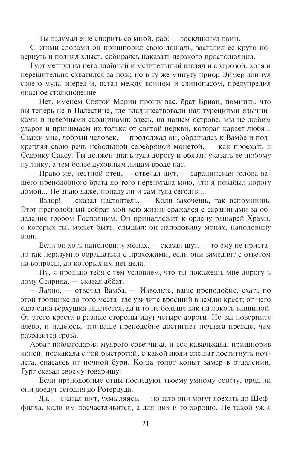 Герой романа, молодой рыцарь Уилфред Айвенго, копьем и мечом защищает свою честь и права, свою возлюбленную, леди Ровену, руки которой всеми средствами домогается жестокий и суровый крестоносец Бриан де Буагильбер. В судьбе юноши горячее участие принимают тайно возвратившийся в Англию король Ричард Львиное Сердце, которого коварные враги пытаются лишить трона, и легендарный разбойник, защитник угнетенных Робин Гуд.| Издательство | Альфа-книга |