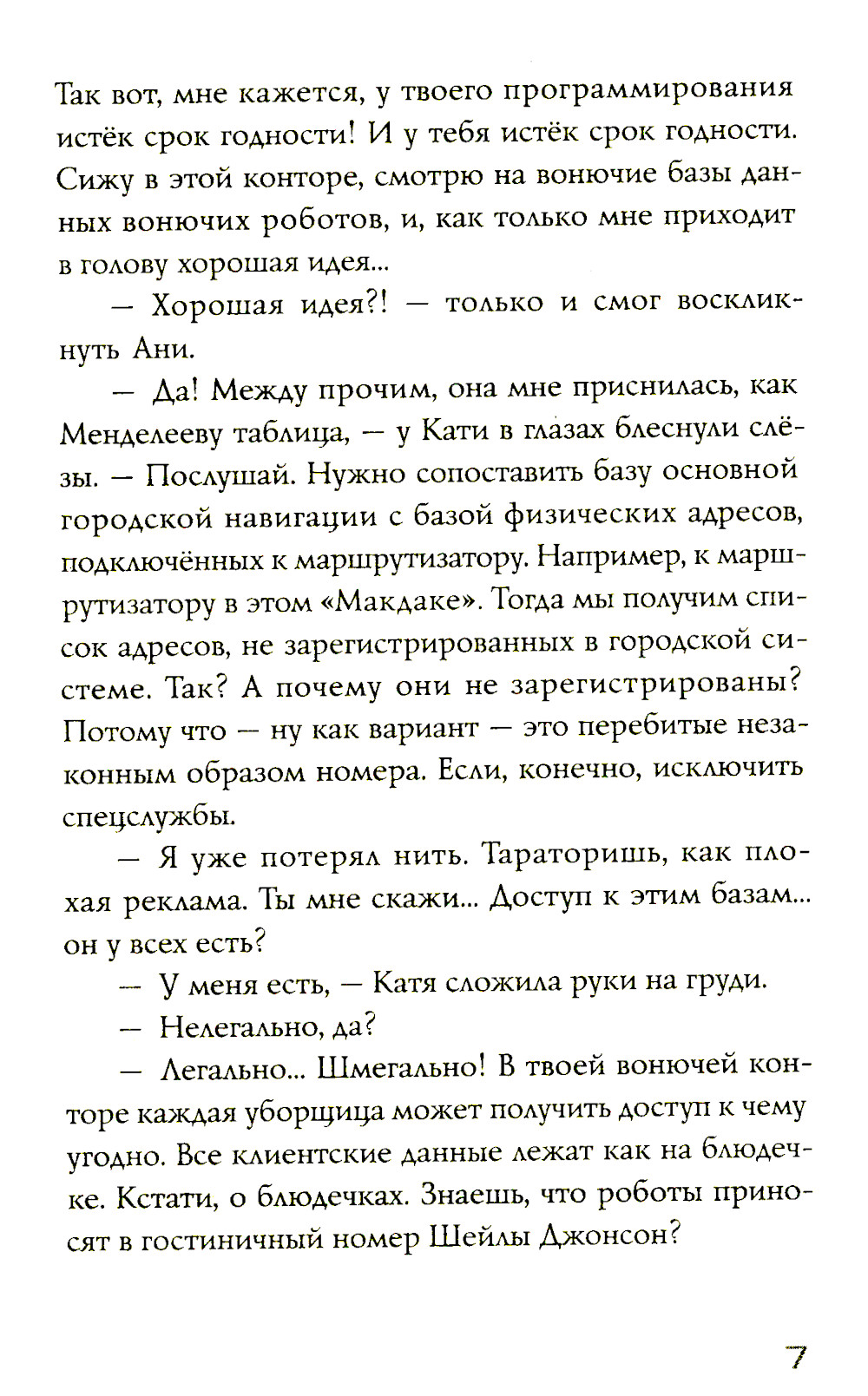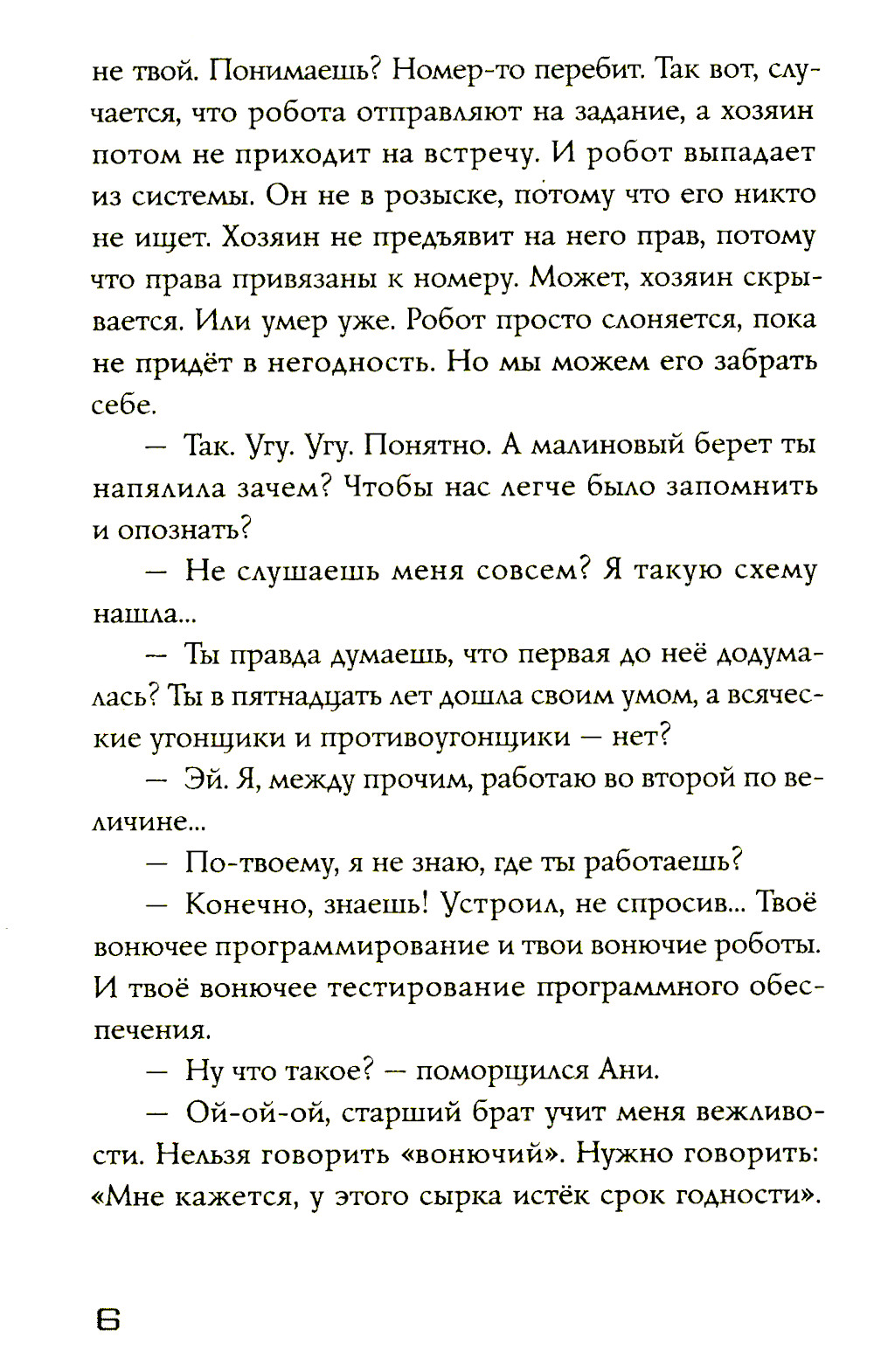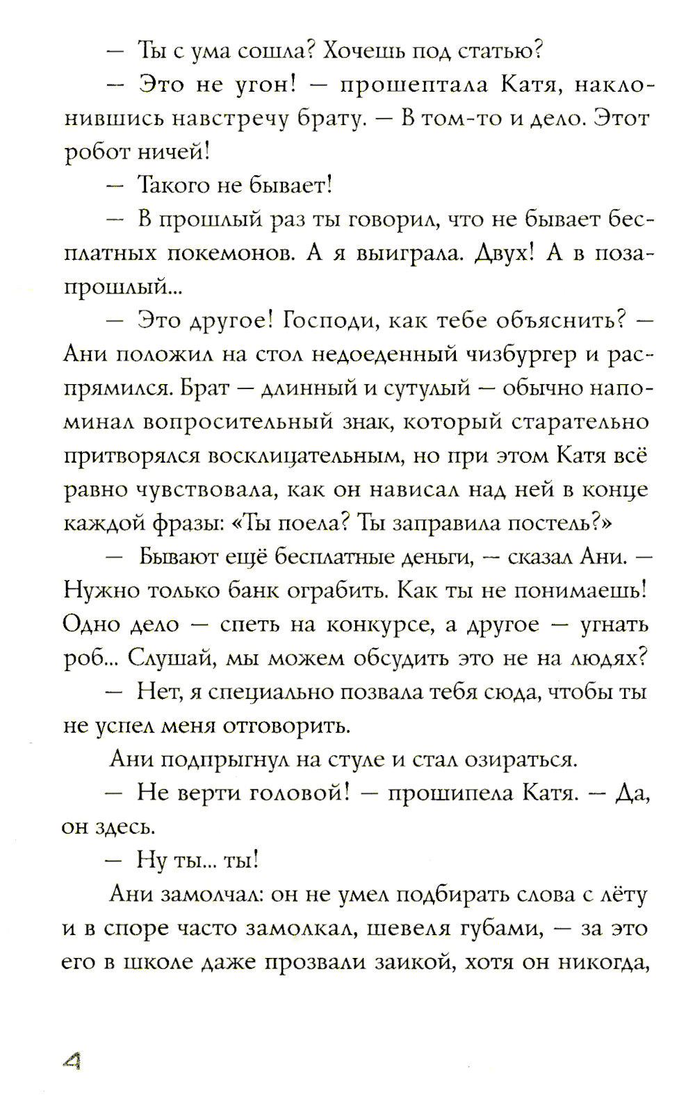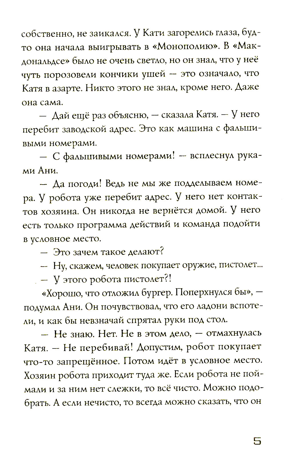 Катя всего-то и хотела, что угнать бесхозного робота с перебитыми номерами. Зачем? Ну, например, чтобы он приносил кофе в постель. Но пока она перебирала в планшете протоколы, по которым можно влезть в его алгоритмы, робот сам заговорил с ней. Он был весьма учтив и пригласил её на пробы. Как он узнал, что девушка мечтает стать актрисой? Катя пришла на встречу вместе с вечно опекающим старшим братом. А после этого заварилась такая история - с неожиданными знакомствами, нелегальными базами данных, погонями и особняками с мрачным прошлым, - из которой они вышли совсем другими людьми. В буквальном смысле. Действие остросюжетной повести Павла Губарева вращается вокруг искусственного интеллекта, но, как и у классиков, фантастика в «Имени Кати» - это линза, которая позволяет направить внимание читателя внутрь - для разговора о психологических защитах, манипуляциях и цене взросления. Для юношества.| Издательство | Пять четвертей |