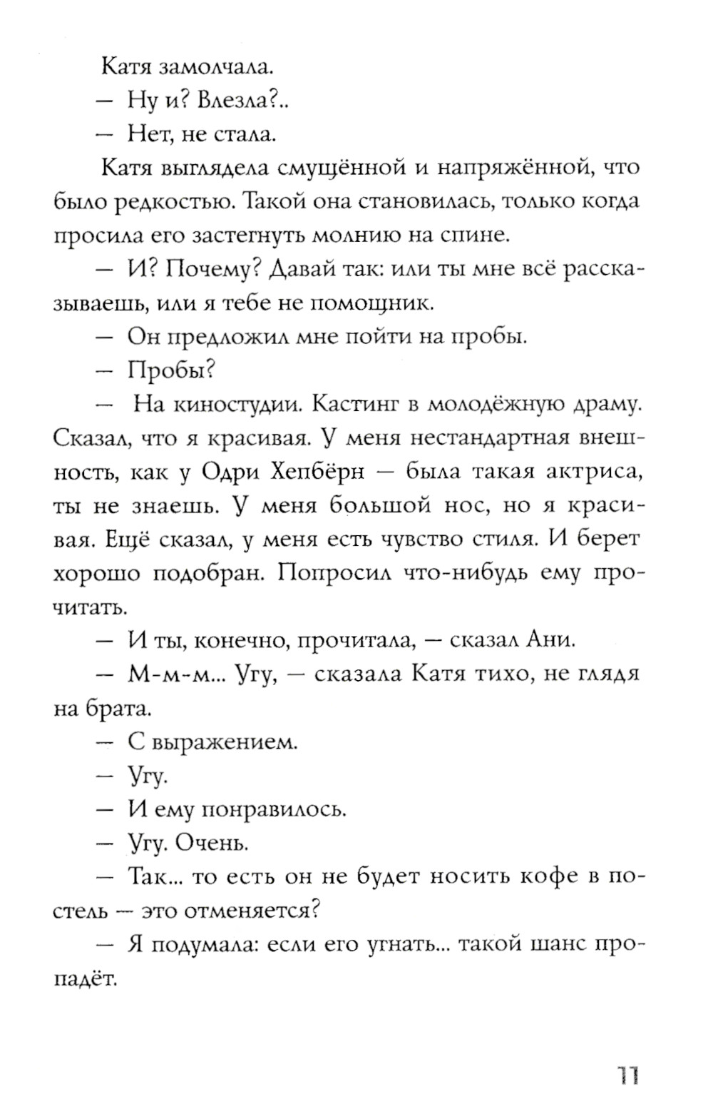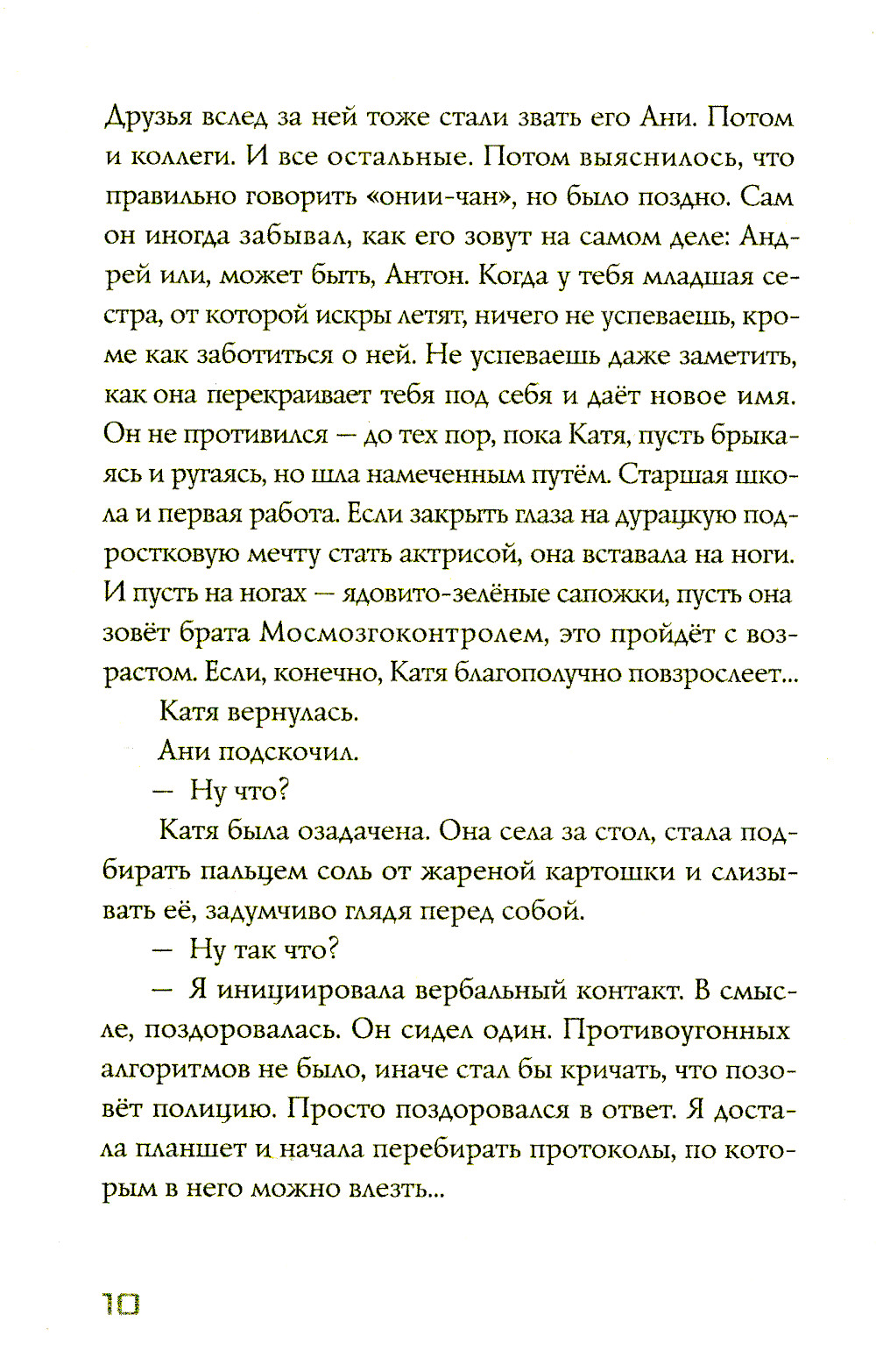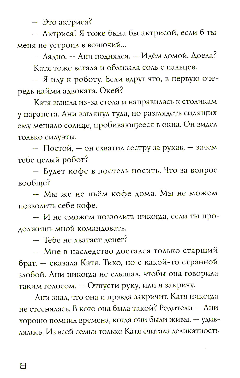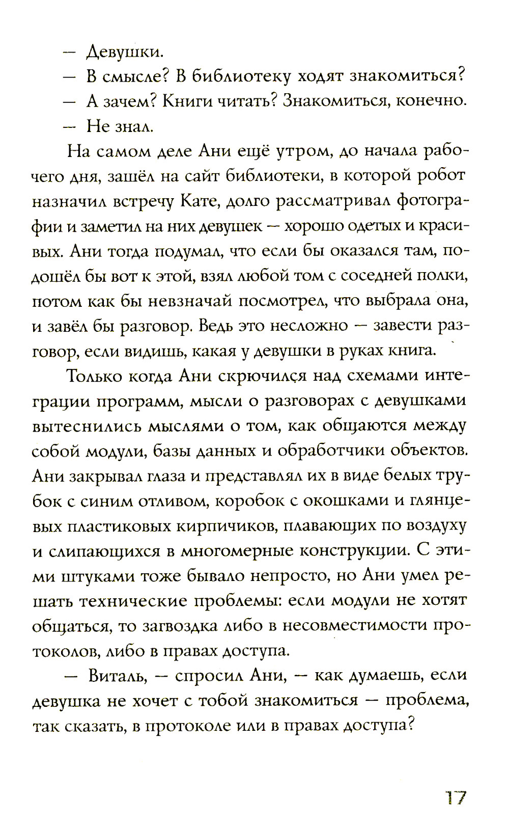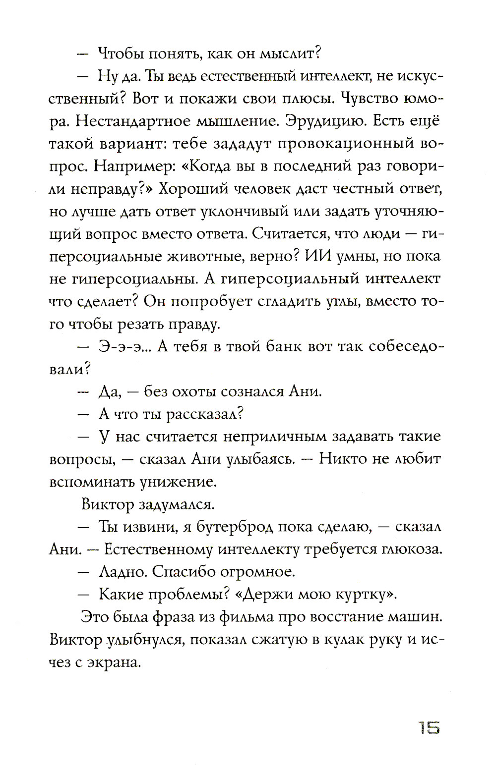Катя всего-то и хотела, что угнать бесхозного робота с перебитыми номерами. Зачем? Ну, например, чтобы он приносил кофе в постель. Но пока она перебирала в планшете протоколы, по которым можно влезть в его алгоритмы, робот сам заговорил с ней. Он был весьма учтив и пригласил её на пробы. Как он узнал, что девушка мечтает стать актрисой? Катя пришла на встречу вместе с вечно опекающим старшим братом. А после этого заварилась такая история - с неожиданными знакомствами, нелегальными базами данных, погонями и особняками с мрачным прошлым, - из которой они вышли совсем другими людьми. В буквальном смысле. Действие остросюжетной повести Павла Губарева вращается вокруг искусственного интеллекта, но, как и у классиков, фантастика в «Имени Кати» - это линза, которая позволяет направить внимание читателя внутрь - для разговора о психологических защитах, манипуляциях и цене взросления. Для юношества.| Издательство | Пять четвертей |