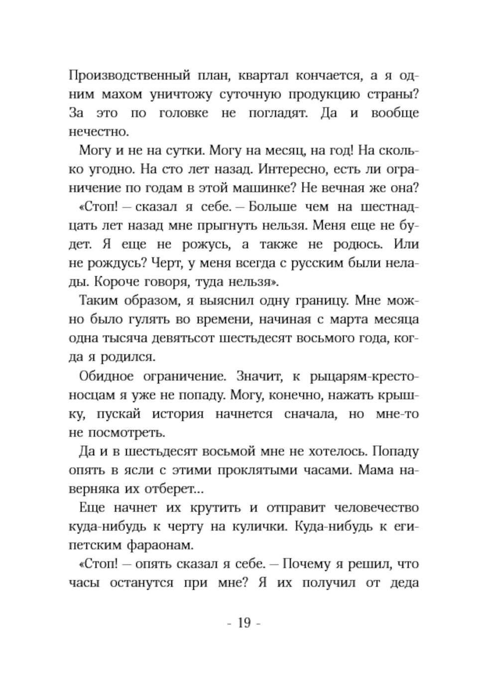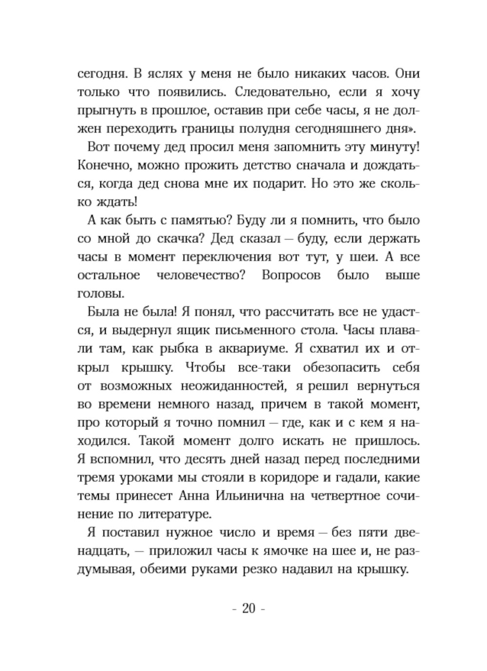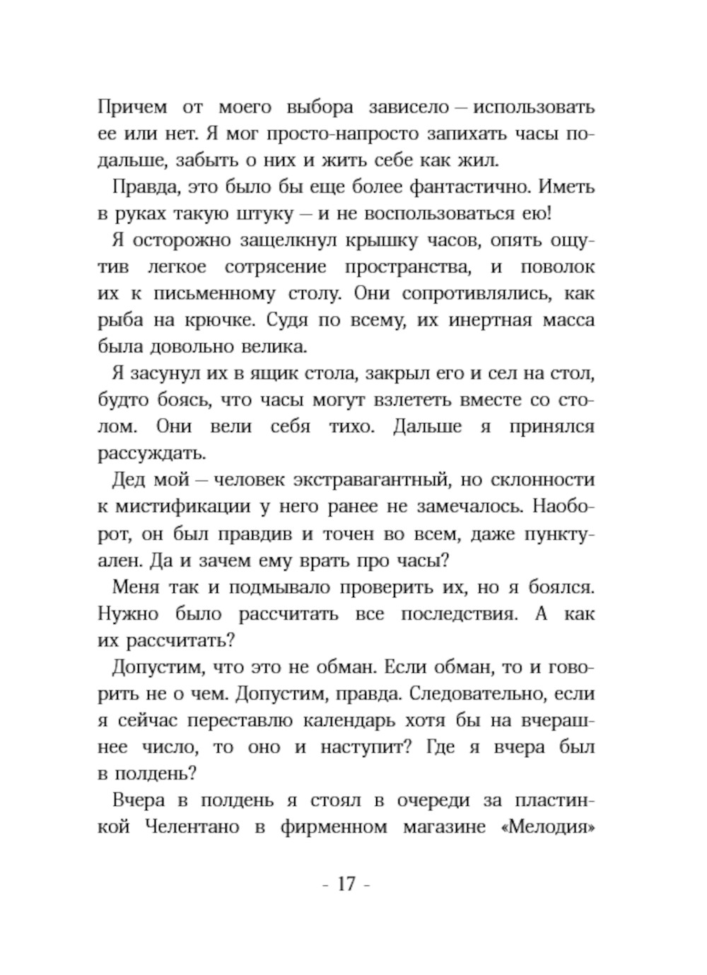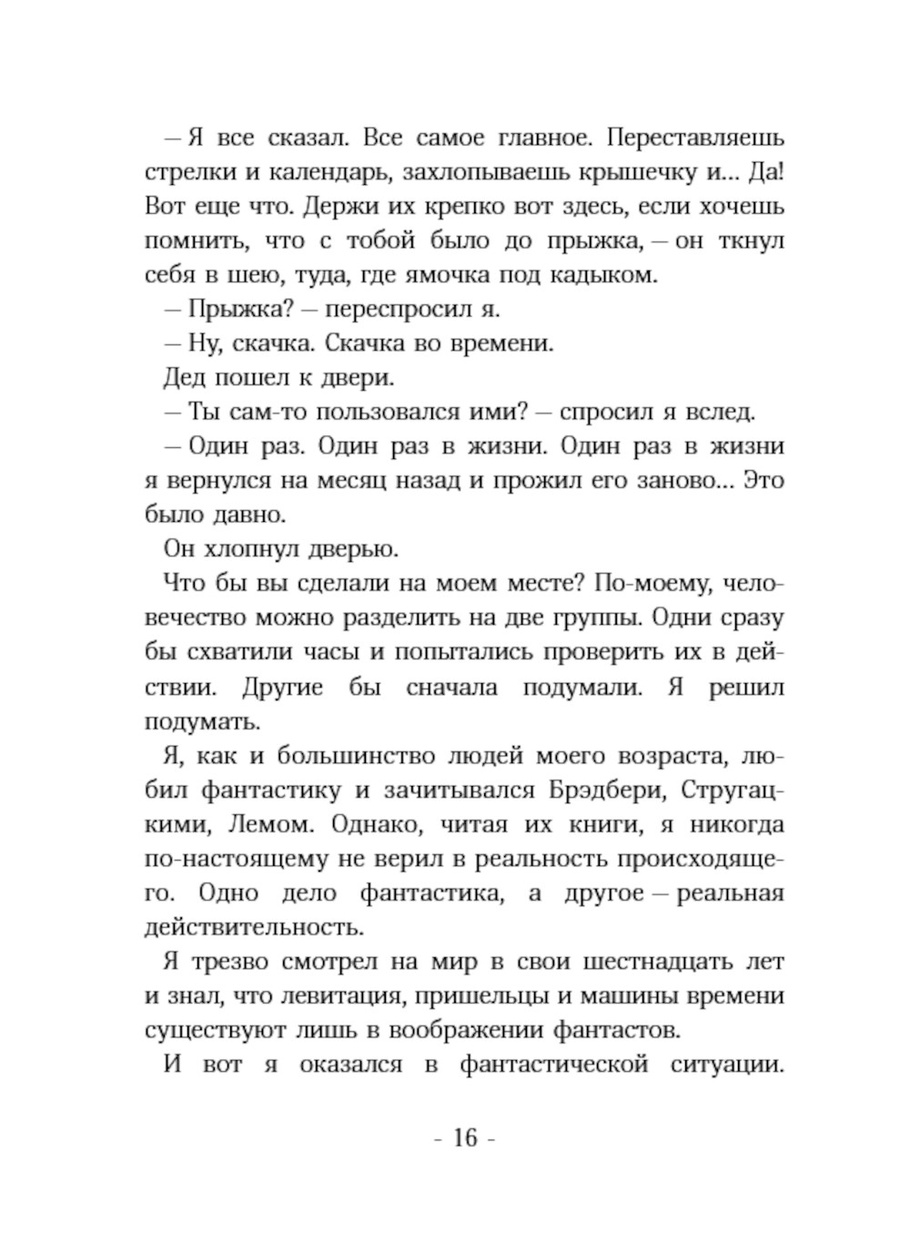 На свой шестнадцатый день рождения Сергей Мартынцев получает от дедушки необычный подарок - часы, с помощью которых можно путешествовать во времени. Он не сразу решается испытать их, но, попробовав, уже не может остановиться. Сергей то отправляется в прошлое и еще раз переживает лучшие моменты своей жизни, то, наоборот, устремляется в будущее в надежде избежать горестей и неудач. Однако вскоре приходит усталость от хаотичных передвижений во времени, и он начинает задумываться о смысле дедушкиного подарка. Для детей среднего школьного возраста.