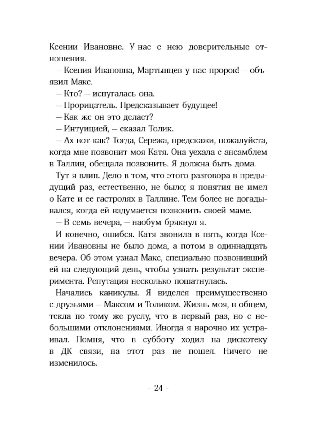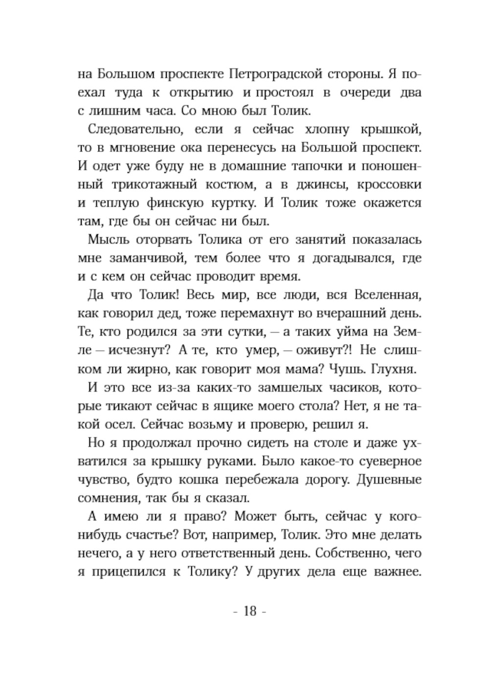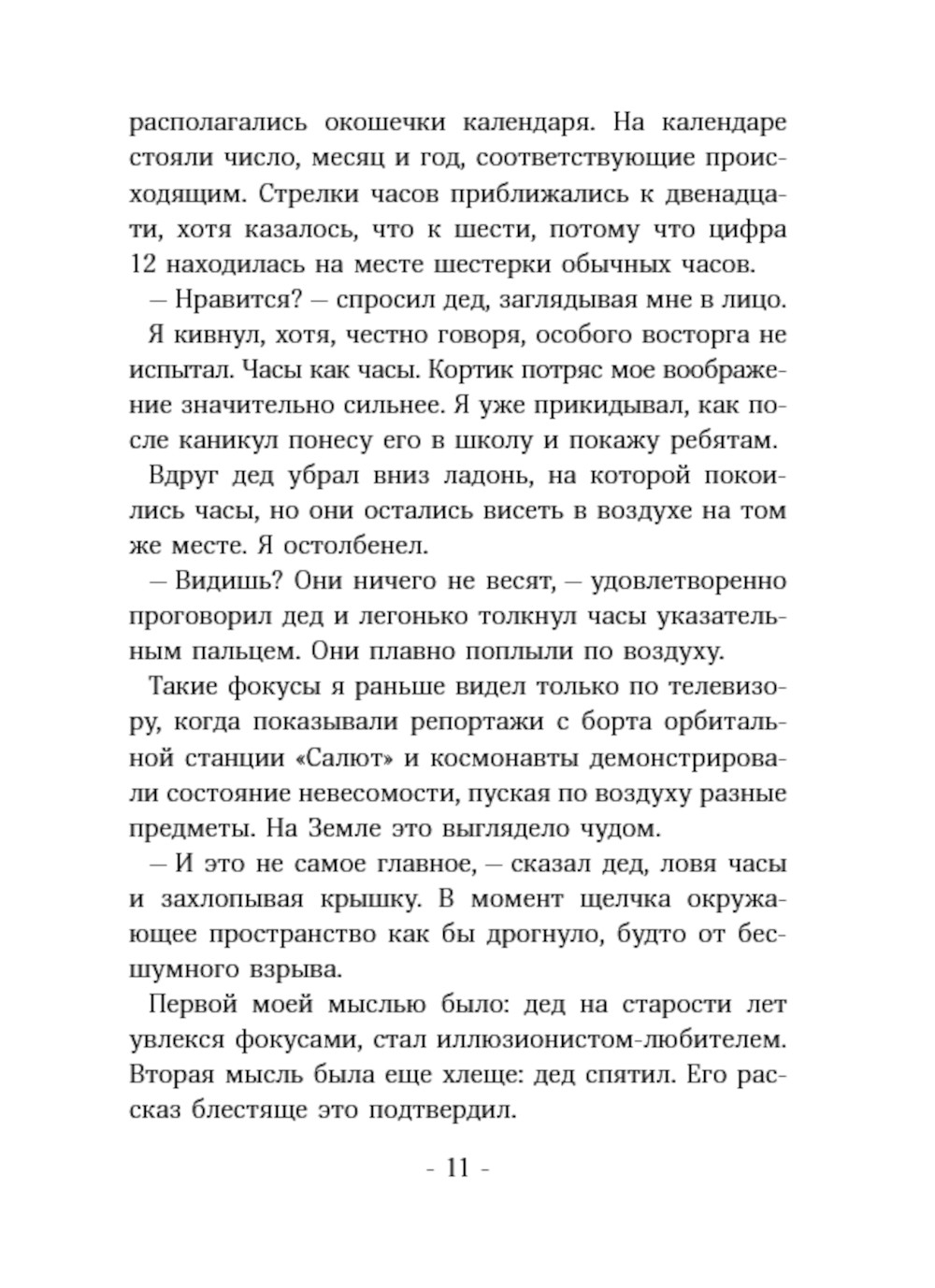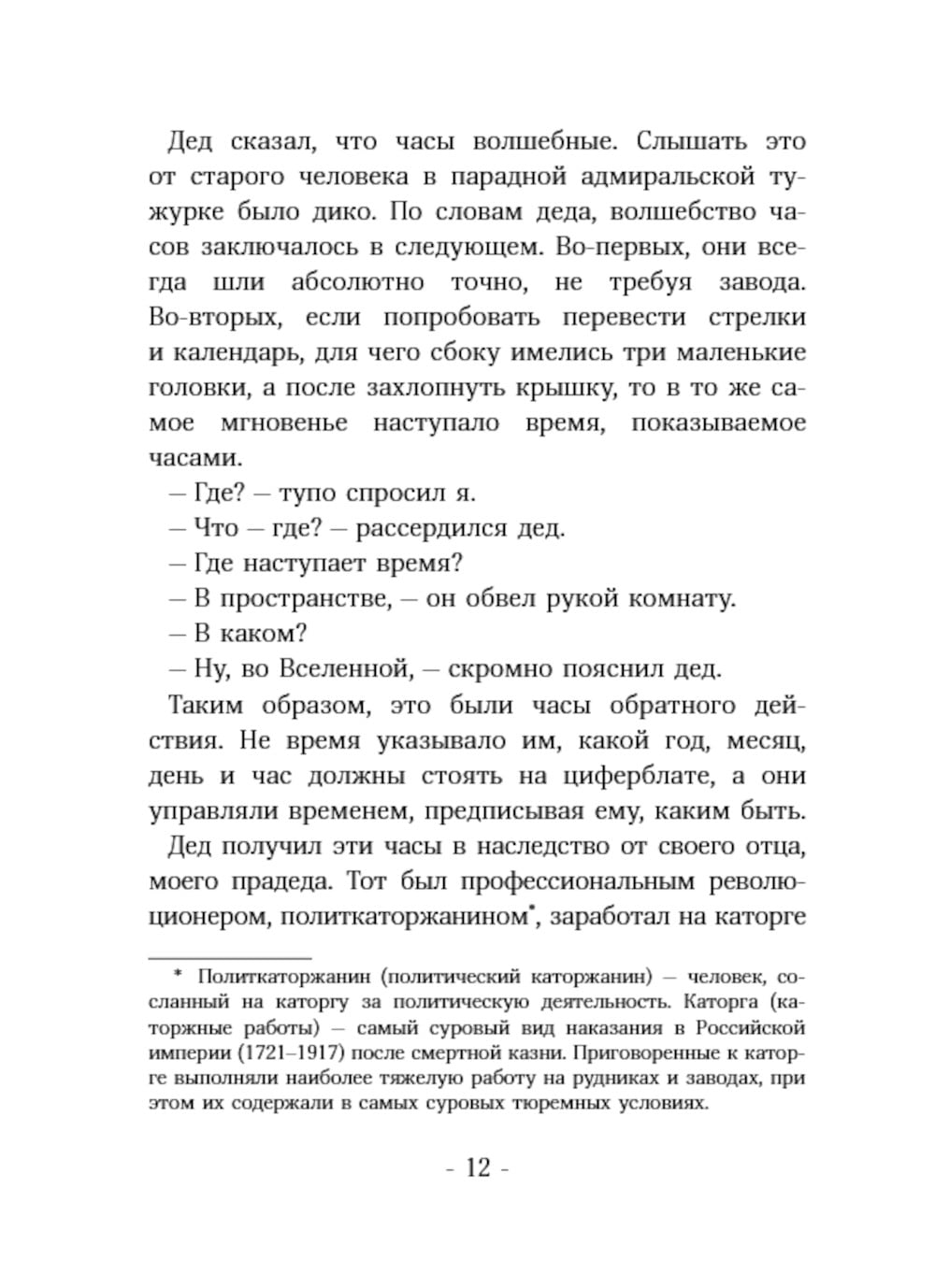На свой шестнадцатый день рождения Сергей Мартынцев получает от дедушки необычный подарок - часы, с помощью которых можно путешествовать во времени. Он не сразу решается испытать их, но, попробовав, уже не может остановиться. Сергей то отправляется в прошлое и еще раз переживает лучшие моменты своей жизни, то, наоборот, устремляется в будущее в надежде избежать горестей и неудач. Однако вскоре приходит усталость от хаотичных передвижений во времени, и он начинает задумываться о смысле дедушкиного подарка. Для детей среднего школьного возраста.