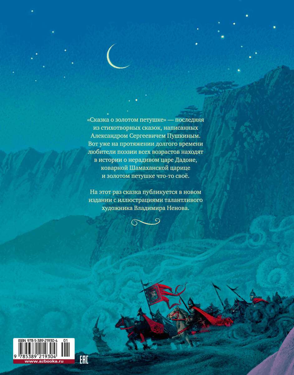 "Сказка о золотом петушке" - последняя из стихотворных сказок, написанных Александром Сергеевичем Пушкиным. Вот уже на протяжении нескольких веков любители поэзии всех возрастов находят в истории о нерадивом царе Додоне, коварной Шамаханской царице и золотом петушке что-то свое. На этот раз сказка публикуется в новом издании с иллюстрациями талантливого художника Владимира Ненова.| Издательство | Азбука-Аттикус Издат.группа ООО |