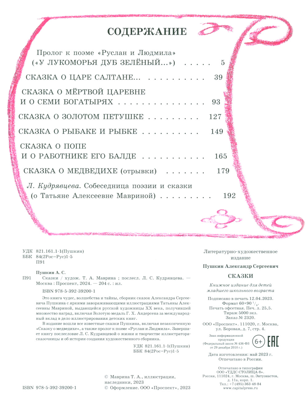 Это книга чудес, волшебства и тайны, сборник сказок Александра Сергеевича Пушкина с яркими завораживающими иллюстрациями Татьяны Алексеевны Мавриной, выдающейся русской художницы XX века, получившей множество наград, включая Золотую медаль Г. X. Андерсена за международный вклад в дело иллюстрирования детских книг. В издание вошли все известные сказки Пушкина, включая незаконченную «Сказку о медведихе», а также пролог к поэме «Руслан и Людмила». Завершает книгу послесловие Л. С. Кудрявцевой о жизни и творчестве иллюстратора-сказочницы и об истории создания художественного сборника.| Издательство | Проспект |