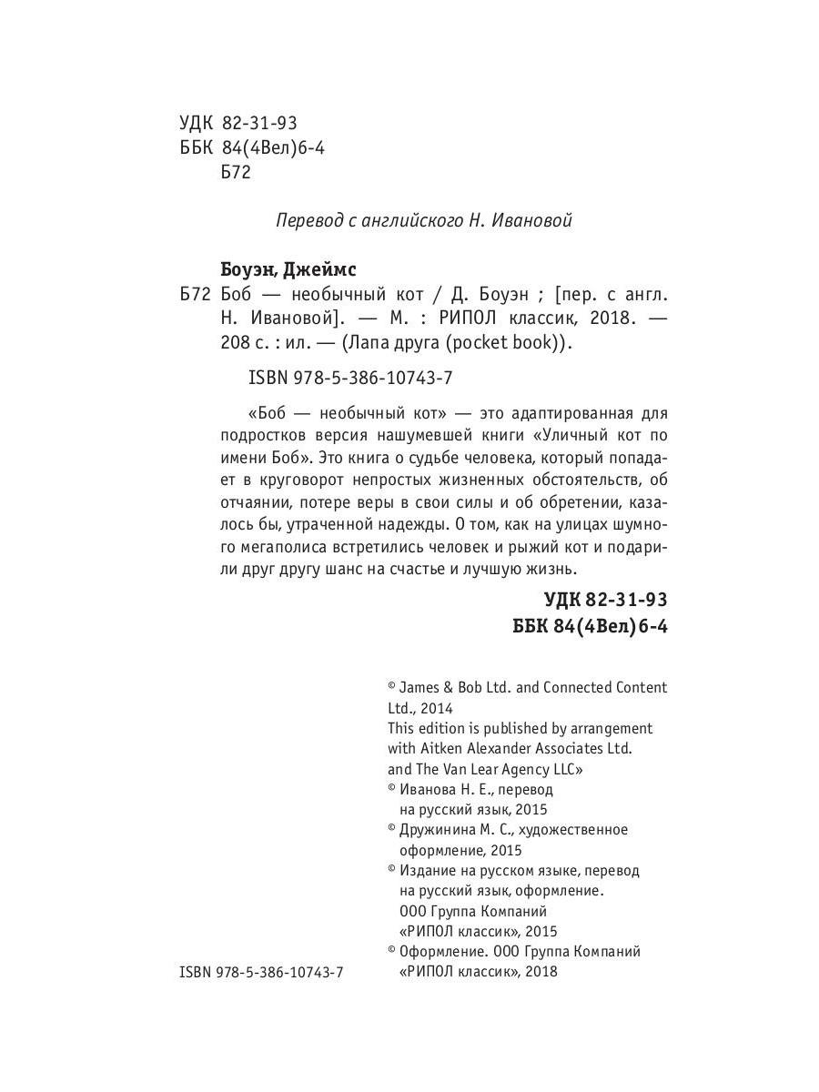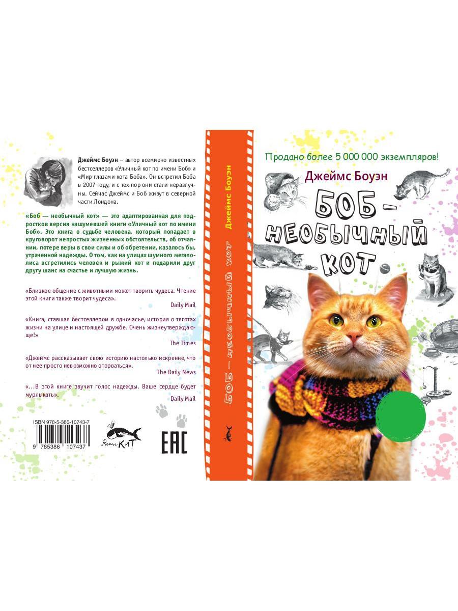 «Боб - необычный кот» - это адаптированная для подростков версия нашумевшей книги «Уличный кот по имени Боб». Это книга о судьбе человека, который попадает в круговорот непростых жизненных обстоятельств, об отчаянии, потере веры в свои силы и об обретении, казалось бы, утраченной надежды. О том, как на улицах шумного мегаполиса встретились человек и рыжий кот и подарили друг другу шанс на счастье и лучшую жизнь.| Издательство | Рипол Классик |