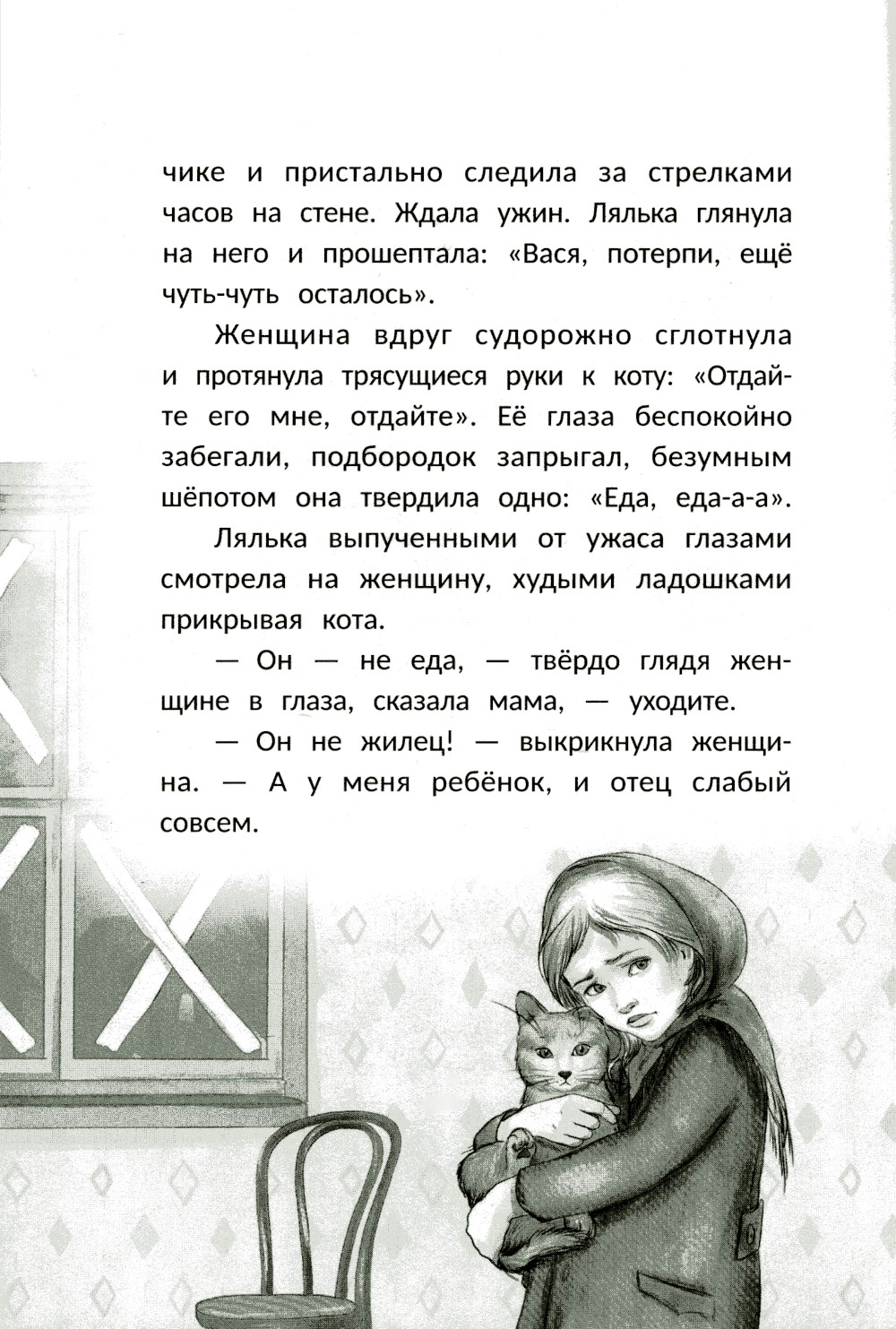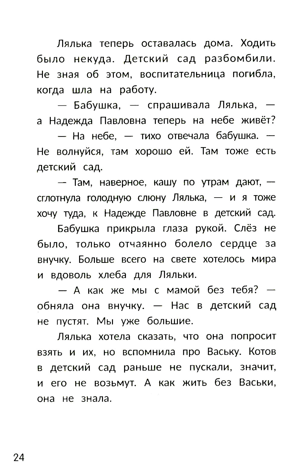 Действие истории происходит в блокадном Ленинграде 1941-1942 годов. Шестилетняя Лялька и её кот Васька вместе переживают ужасы войны. Девочка делится с пушистым другом последним куском хлеба, а Васька помогает семье Ляльки выжить в первую, самую суровую зиму блокады. Основанная на воспоминаниях очевидцев, дневниках и архивных материалах история погружает в атмосферу того времени и напоминает о ценности дружбы и надежды даже в самых страшных условиях.| Издательство | Феникс |