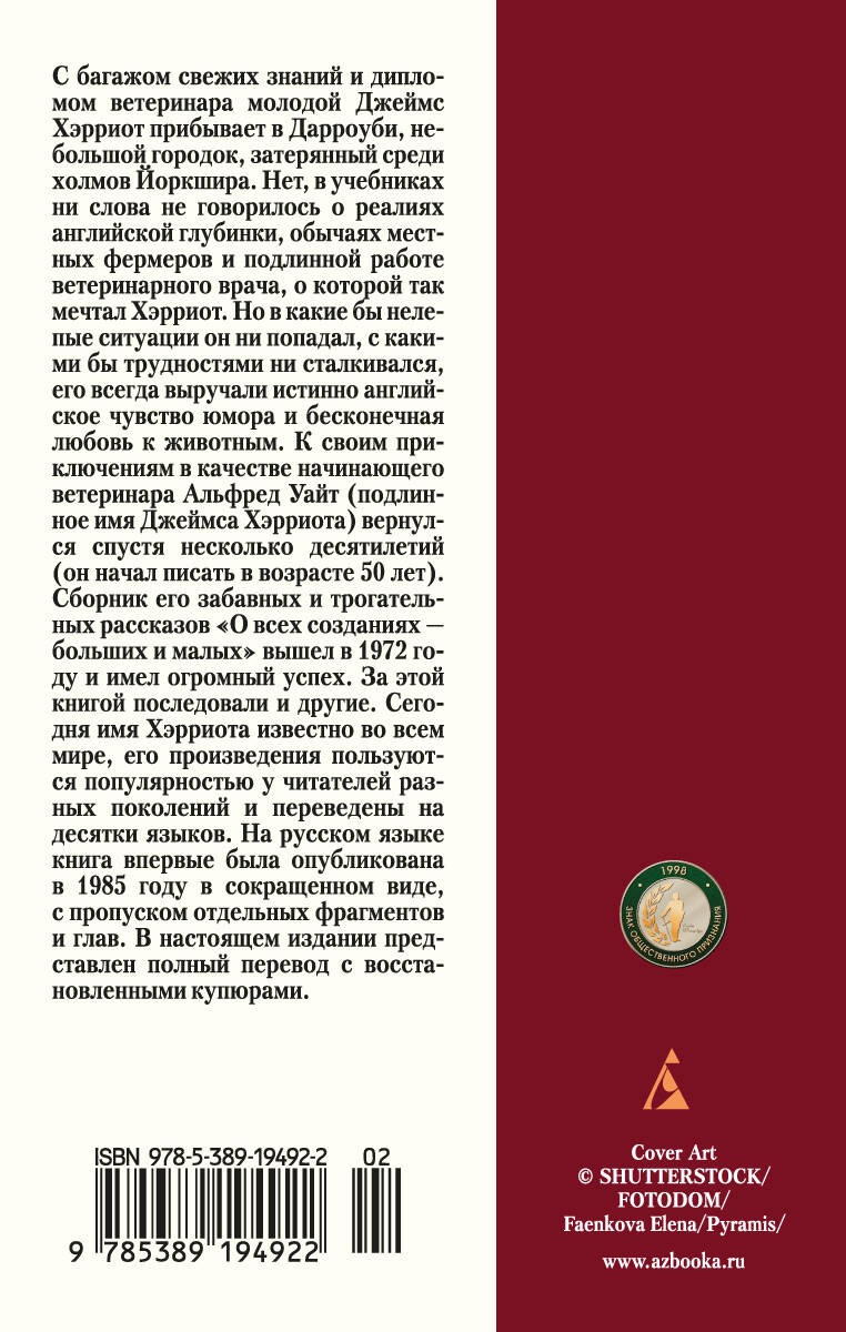С багажом свежих знаний и дипломом ветеринара молодой Джеймс Хэрриот пребывает в Дарроуби, небольшой городок, затерянный среди холмов Йоркшира. Нет, в учебниках ни слова не говорилось о реалиях английской глубинки, обычаях местных фермеров и подлинной раб| Издательство | Азбука-Аттикус Издат.группа ООО |