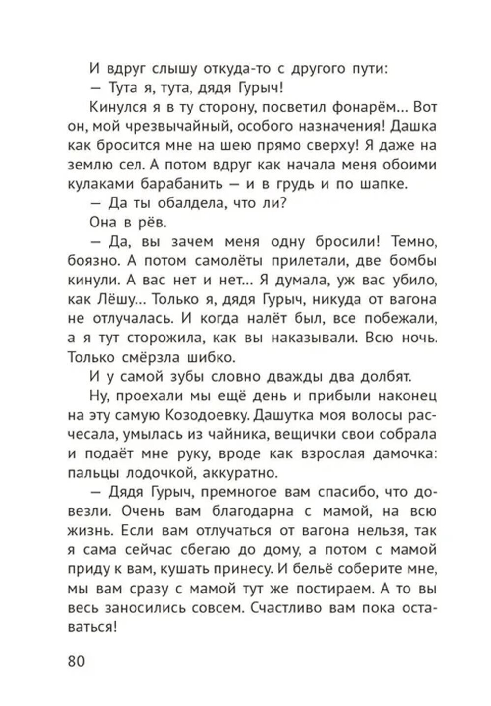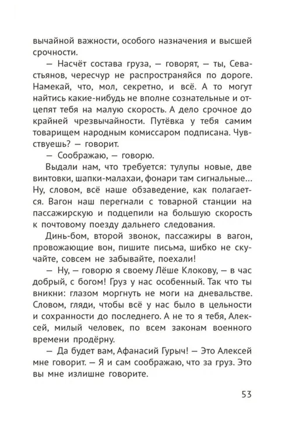 ...По рельсам мчится поезд с очень ценным грузом в вагоне. И груз этот «чрезвычайной важности, особого назначения и высшей срочности». Вот только очень боится этот важный груз огня. Потому-то один из рассказов этого сборника так и называется - «Огнеопасный груз». Так и проследовал бы этот вагон и дальше своим секретным путем, если бы не прицепился к нему на станции Синереченской «заяц», точнее «зайчиха» - грязная и голодная девчушка Даша, которая хотела доехать до мамы с братиком... «Батарейный заяц», «У классной доски», «Отметки Риммы Лебедевой», «Держись, капитан!», «Рассказ с бородой» - в сборник вошли патриотичные и трогательные рассказы Кассиля о чувстве долга, о настоящем мужестве, о добре и зле. Серия «Короткое детство» объединяет книги о войне для детей, для мальчиков и для девочек. В серии есть как небольшие произведения, например, понятные малышам рассказы о войне для детей 6 лет, так и повести для детей 10 лет, есть и книги для подростков, ровесники которых воевали и погибали на фронте. Это книги о жестокости войны и о человечности, о дружбе и о любви, о семьях, разлученных войной. Внеклассное чтение в детском саду и в школе. Эта книга про войну для детей станет хорошим подарком на День победы 9 мая и на 23 февраля мальчикам.| Издательство | Качели |