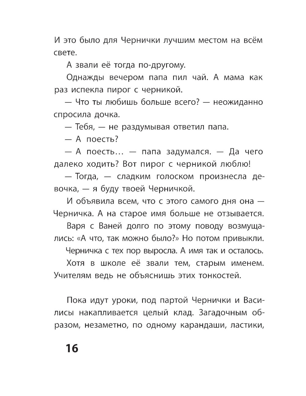 Черничке уже десять лет, но она по-прежнему настаивает, чтобы в семье её называли этим милым детским прозвищем. Маленькая непоседа находит себе увлекательные занятия в школе и дома: выдумывает разные игры, устраивает кукольные квесты, пишет письма домовому и сочиняет забавные истории. А на каникулах и вовсе начинается веселье! За три летних месяца Черничка становится героиней сельской легенды, запутанного детектива и настоящей истории с привидениями. Задорная и любопытная девчонка везде находит приключения и новых друзей.