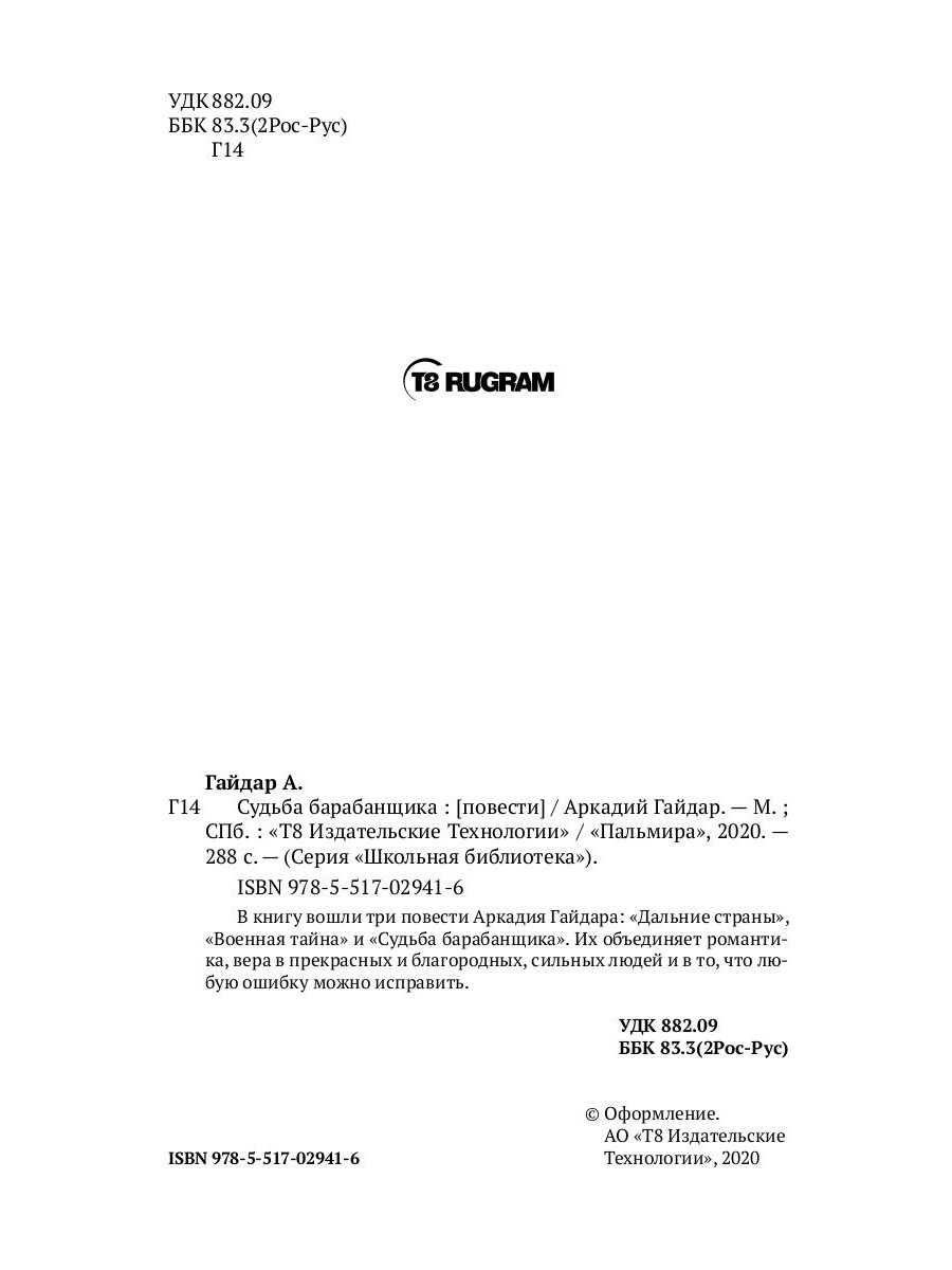 В книгу вошли три повести Аркадия Гайдара: «Дальние страны», «Военная тайна» и «Судьба барабанщика». Их объединяет романтика, вера в прекрасных и благородных, сильных людей и в то, что любую ошибку можно исправить.| Издательство | Т8 RUGRAM |