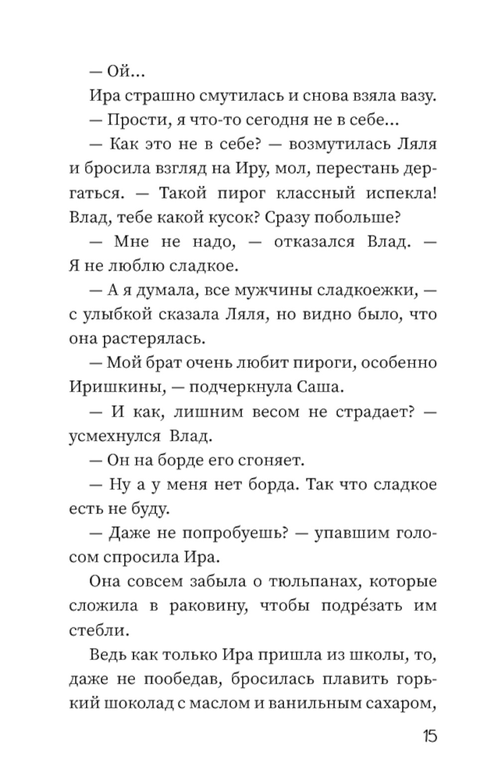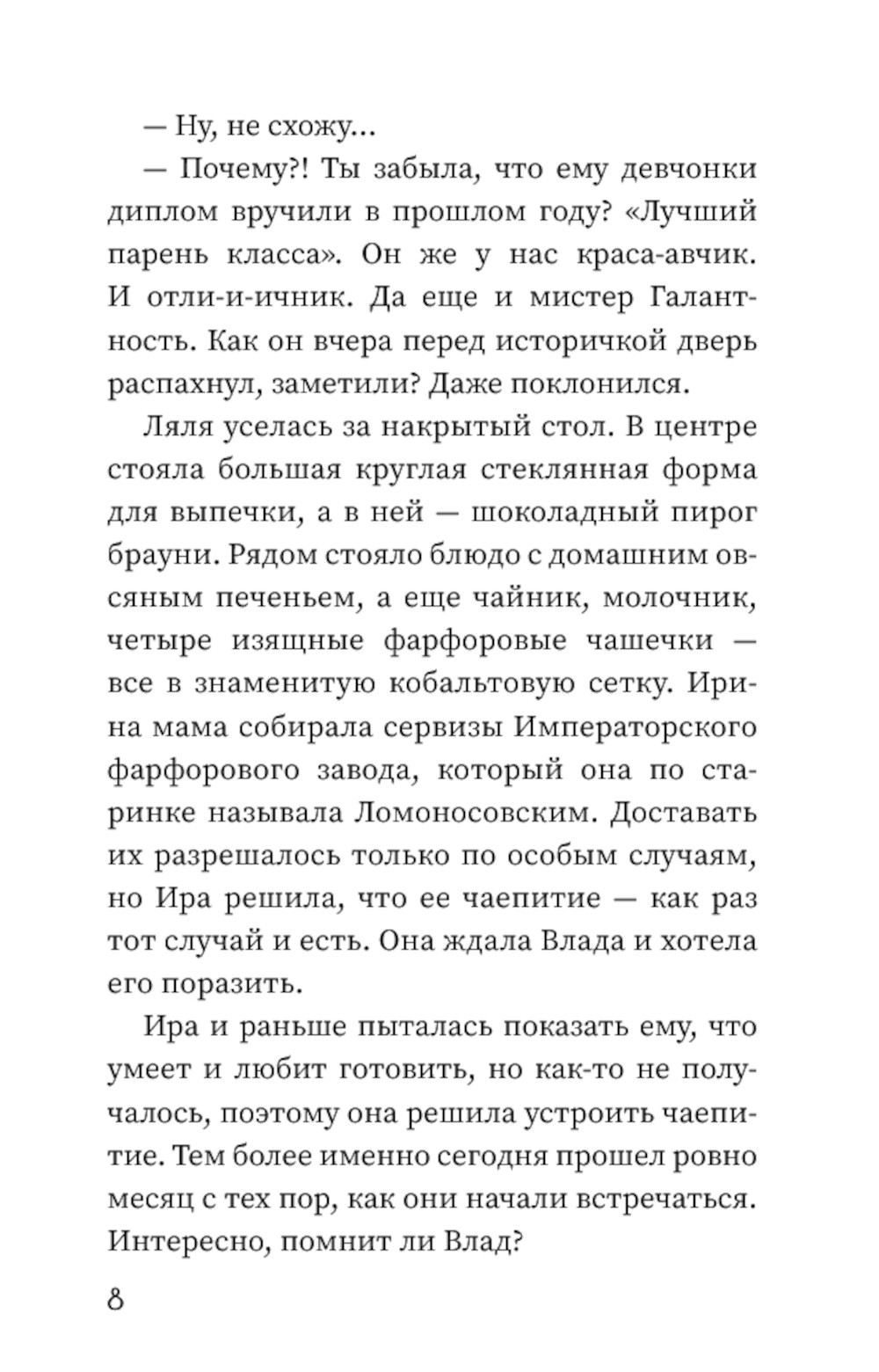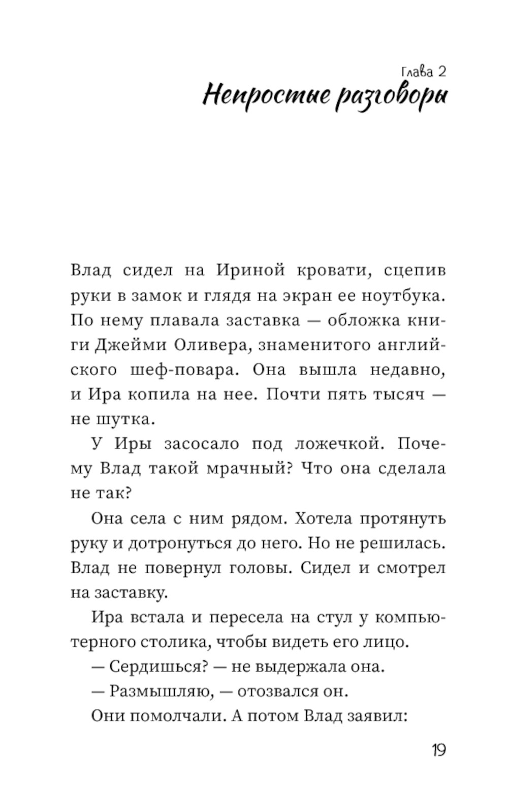 Ира любит готовить. Она смело экспериментирует на кухне, вдохновляясь кулинарными шоу и постами блогеров. Все карманные деньги она тратит на сборники рецептов и продукты для очередного шедевра. Подруги готовы драться за лишний кусочек ее брауни и мягкого овсяного печенья. А еще Ира любит Влада. Он красивый, спортивный и уверенный в себе. Он выбрал именно ее, и Ире завидует вся школа. Но Влад категорически против ее увлечения. Да и родители призывают больше сил отдавать учебе. Все-таки десятый класс, пора определяться с будущей профессией. Не в кулинарный же колледж поступать?! Юлия Кузнецова - российская писательница, переводчик, автор многочисленных книг для детей и подростков. Лауреат премии имени В. П. Крапивина, премий «Заветная мечта» и «Книгуру». Юлия Кузнецова отдает предпочтение жанру психологической прозы, ведь через нее можно ответить на самые актуальные вопросы понятным языком. Воздушные и нежные иллюстрации Маши Судовых дополняют настроение книги. Для среднего и старшего школьного возраста.