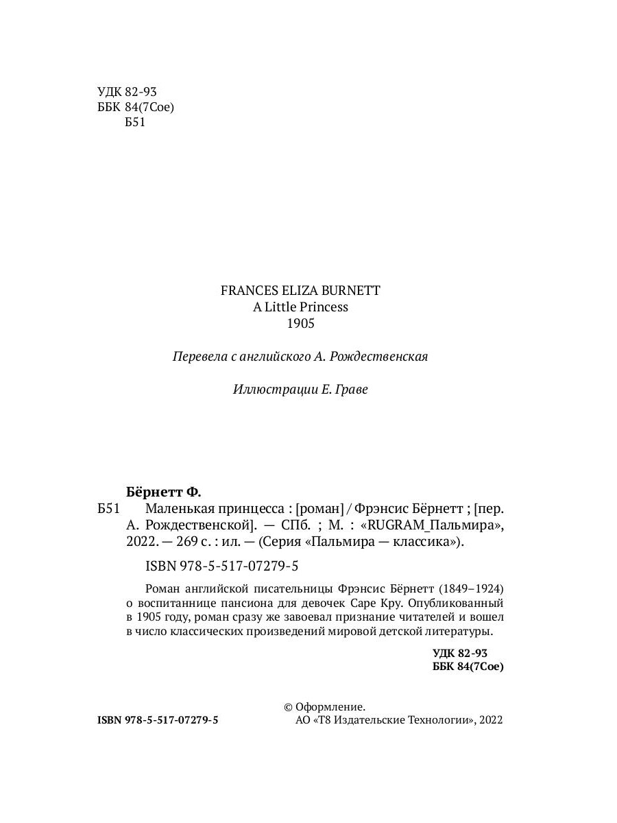 Роман английской писательницы Фрэнсис Бёрнетт (1849-1924) о воспитаннице пансиона для девочек Саре Кру. Опубликованный в 1905 году, роман сразу же завоевал признание читателей и вошел в число классических произведений мировой детской литературы.| Издательство | Т8 RUGRAM |