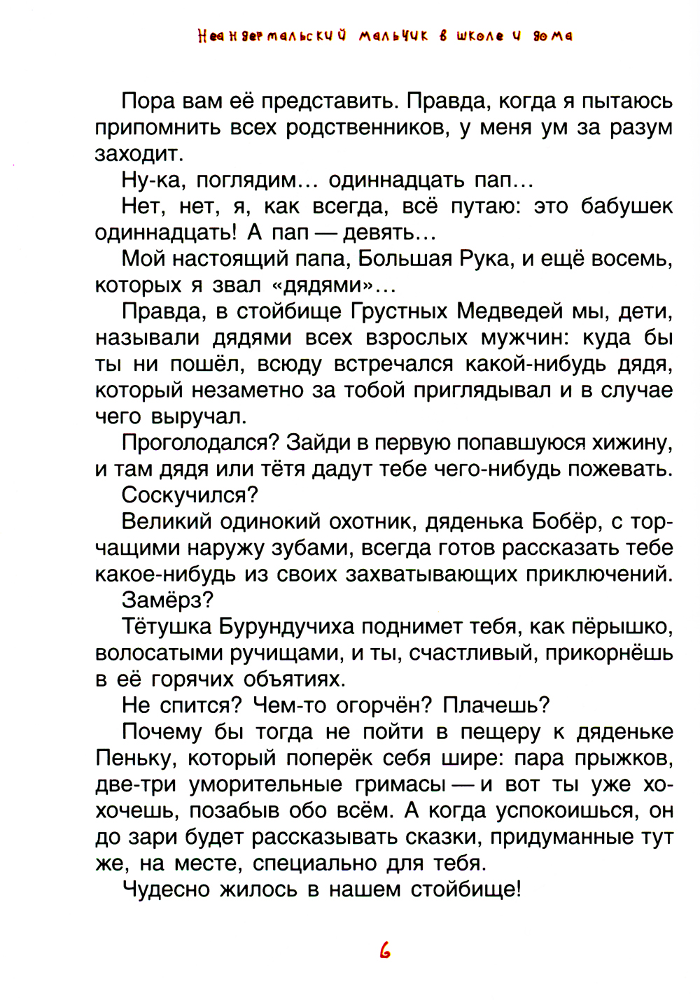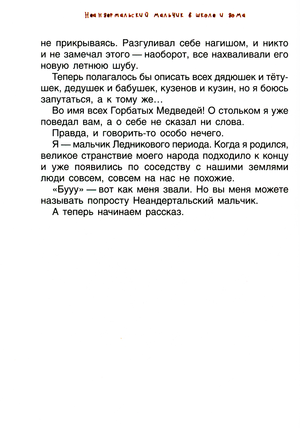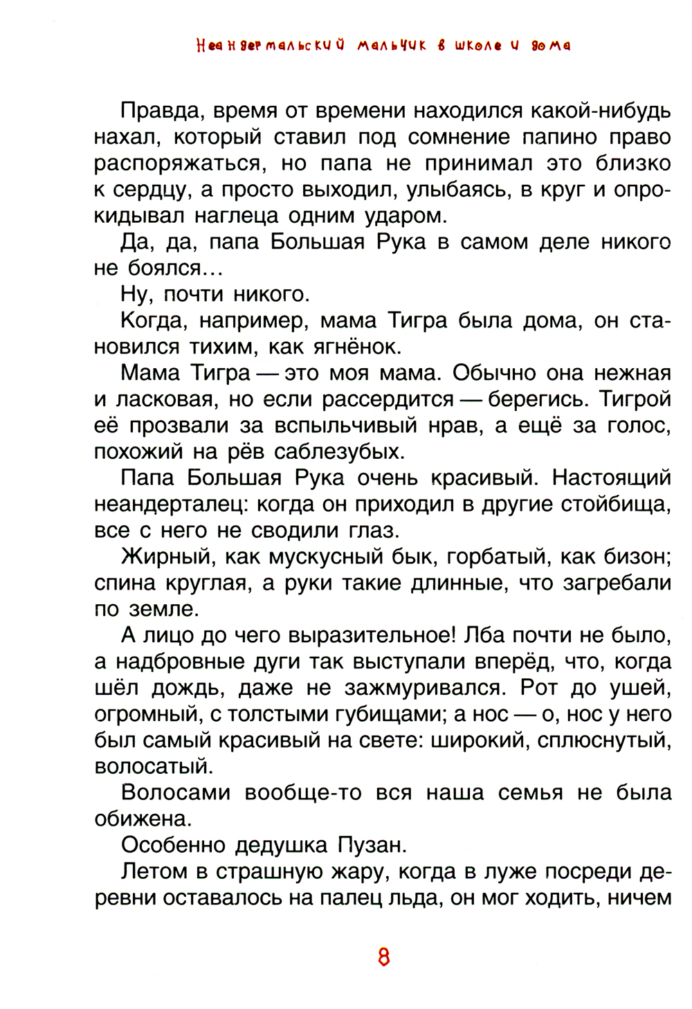Ледниковые люди очень чистоплотны. Они моются два раза в год: в начале и в конце долгой зимы. Ледниковые люди очень красивы. Они массивные, как быки, горбатые, как бизоны, и мохнатые, как медведи. Ледниковые дети ходят в школу. Охота, рыбалка и собирательство - основные уроки. Но есть и другие: обработка кремня, постройка хижины, магический рисунок... Вместо контрольной проводят Испытание Мальчика-с-пальчик. А вместо оценок выдают Годовые Копья разного размера. О буднях и праздниках, приключениях и развлечениях ледниковых детей расскажет Неандертальский мальчик. Его историю оживил самый весёлый детский художник - дядя Коля Воронцов. Добро пожаловать в ледниковый период! Для детей младшего школьного возраста.| Издательство | Качели |
