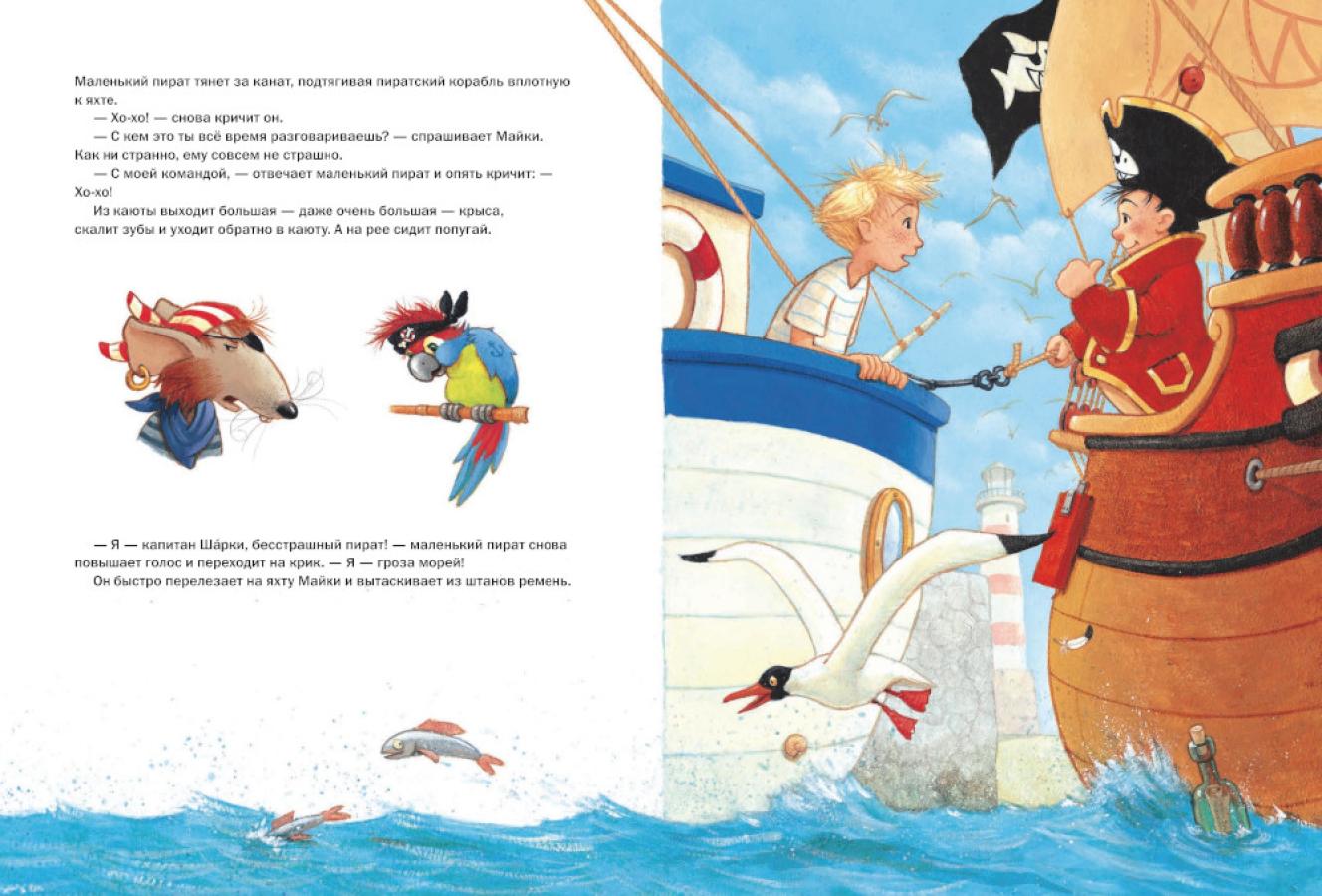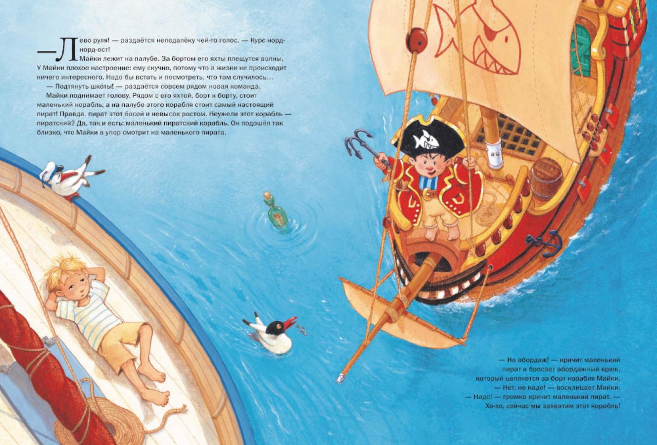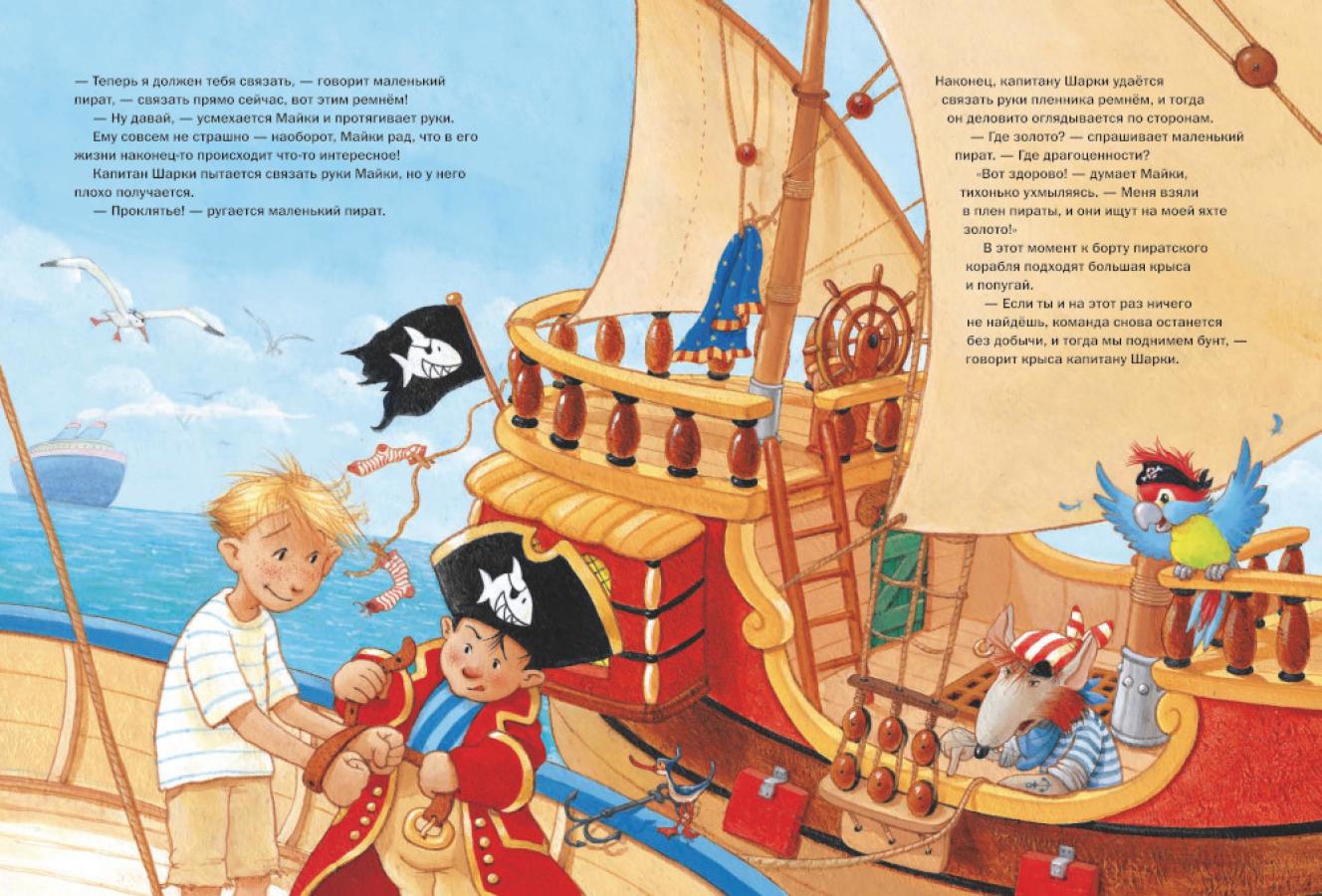 - На абордаж! - кричит капитан Шарки и прыгает на палубу яхты, где сидит и скучает мальчик по имени Мaйки. Наконец-то в жизни Майки происходит что-то интересное: он оказывается на настоящем пиратском корабле в компании маленького пирата и его команды! Капитан Шарки и Майки быстро становятся друзьями. В бутылке, которую капитан Шарки подобрал в океане, они находят старую пожелтевшую карту острова, где зарыт клад, и отправляются на поиски сокровищ...| Издательство | Добрая книга |
