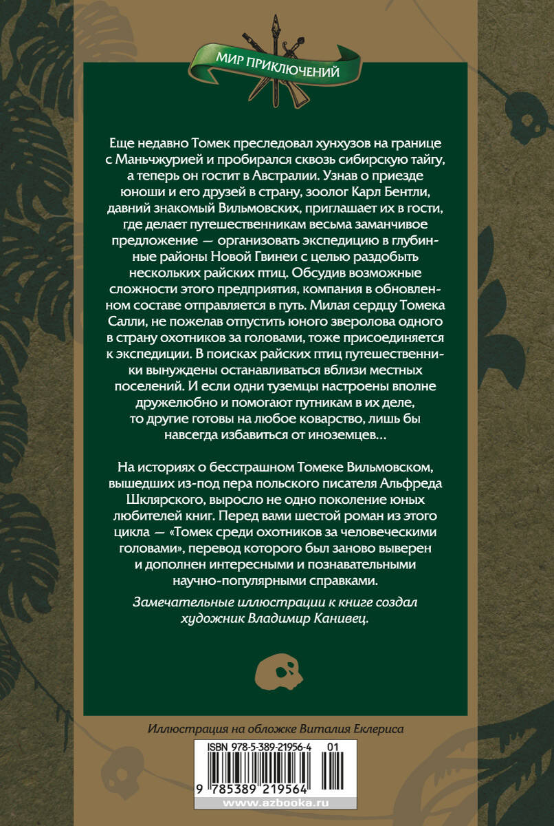 Еще недавно Томек преследовал хунхузов на границе с Маньчжурией и пробирался сквозь сибирскую тайгу, а теперь он гостит в Австралии. Узнав о приезде юноши и его друзей в страну, зоолог Карл Бентли, давний знакомый Вильмовских, приглашает их в гости, где делает путешественникам весьма заманчивое предложение - организовать экспедицию в глубинные районы Новой Гвинеи с целью раздобыть нескольких райских птиц. Обсудив возможные сложности этого предприятия, компания в обновленном составе отправляется в путь. Милая сердцу Томека Салли, не пожелав отпустить юного зверолова одного в страну охотников за головами, тоже присоединяется к экспедиции. В поисках райских птиц путешественники вынуждены останавливаться вблизи местных поселений. И если одни туземцы настроены вполне дружелюбно и помогают путникам в их деле, то другие готовы на любое коварство, лишь бы навсегда избавиться от иноземцев… На историях о бесстрашном Томеке Вильмовском, вышедших из-под пера польского писателя Альфреда Шклярского, выросло не одно поколение юных любителей книг. Перед вами шестой роман из этого цикла - "Томек среди охотников за человеческими головами", перевод которого был заново выверен и дополнен интересными и познавательными научно-популярными справками. Замечательные иллюстрации к книге создал художник Владимир Канивец.| Издательство | Азбука-Аттикус Издат.группа ООО |
