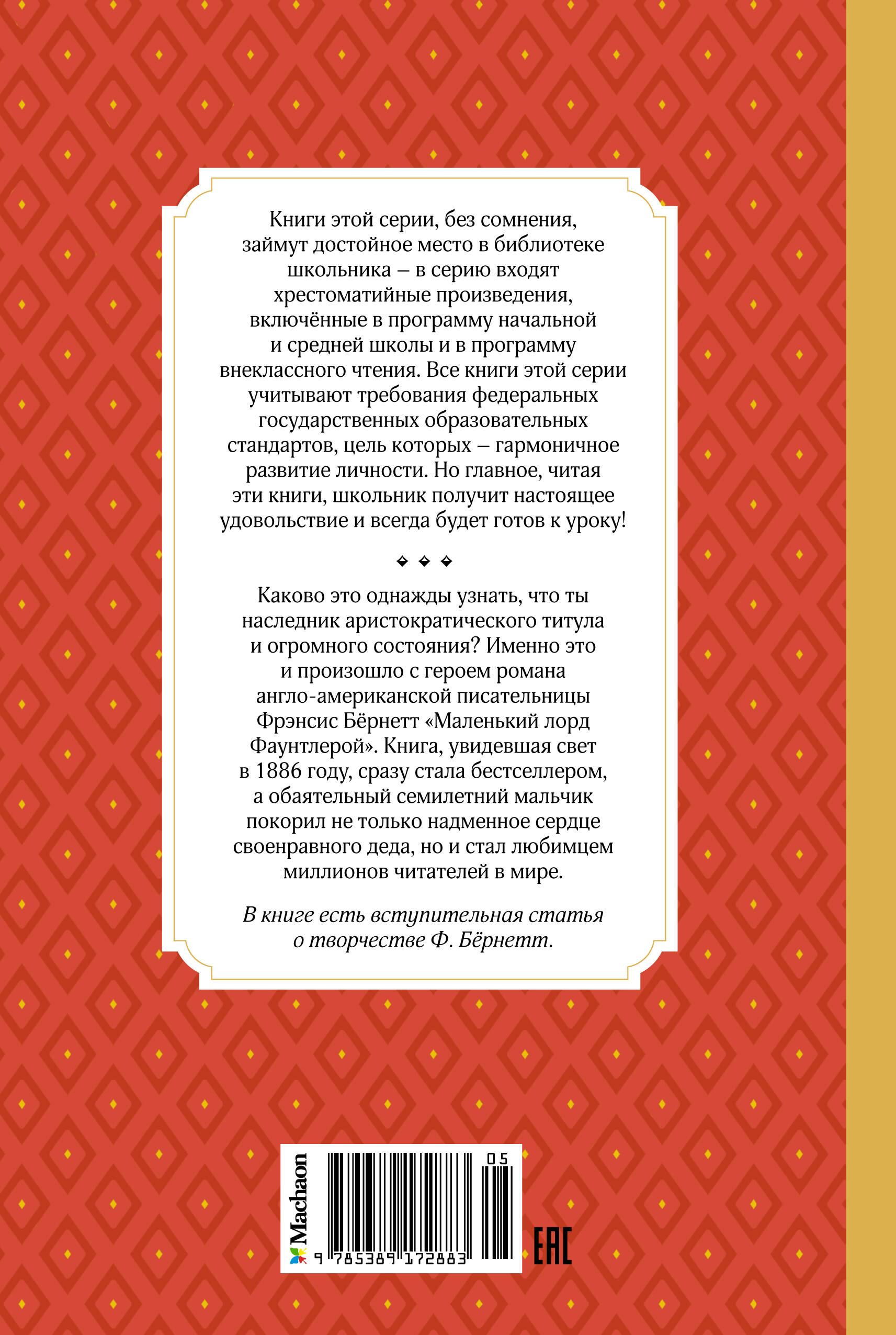 Каково это однажды узнать, что ты наследник аристократического титула и огромного состояния? Именно это и произошло с героем романа американской писательницы Фрэнсис Бёрнетт "Маленький лорд Фаунтлерой". Книга, увидевшая свет в 1886 году, сразу стала бестселлером, а обаятельный семилетний мальчик покорил не только надменное сердце своенравного деда, но и стал любимцем миллионов читателей в мире. В книге есть вступительная статья о творчестве Ф. Бёрнетт. Все произведения в серии "Чтение - лучшее учение" публикуются в полном объеме без сокращений и адаптации.| Издательство | Азбука-Аттикус Издат.группа ООО |