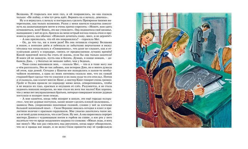 Роман американской писательницы Луизы М. Олкотт - про четырёх сестёр, совсем разных и по внешности, и по характеру, но очень похожих в одном: они чётко понимают, что такое хорошо, а что - плохо, и стараются жить "правильно". Мег, самая старшая и красивая, не лишена тщеславия и амбиций, но старательно избавляется от них и отдаёт себя счастью материнства. Сорванец в юбке Джо, с её презрением к девичьим разговорам и романтическим бредням, лишённая всякого лукавства и кокетства, решает стать писательницей. Затворница Бет помогает всем, кто страдает, и находит радость в музыке. И Эми, самая юная из сестер и самая несовершенная, постоянно пытается преодолеть свой эгоизм, и задача эта не из лёгких.| Издательство | Издательство АЗБУКА ООО |