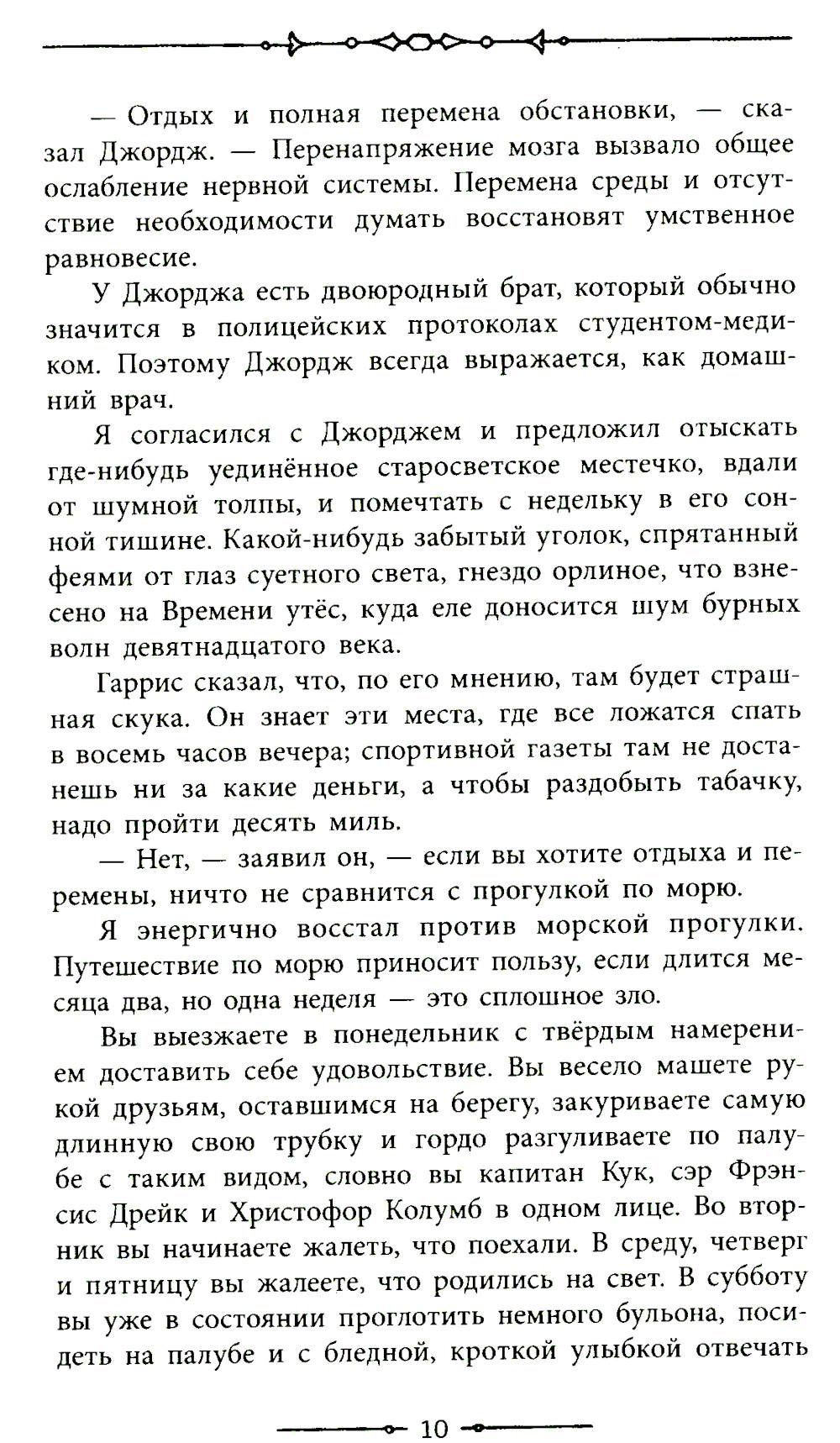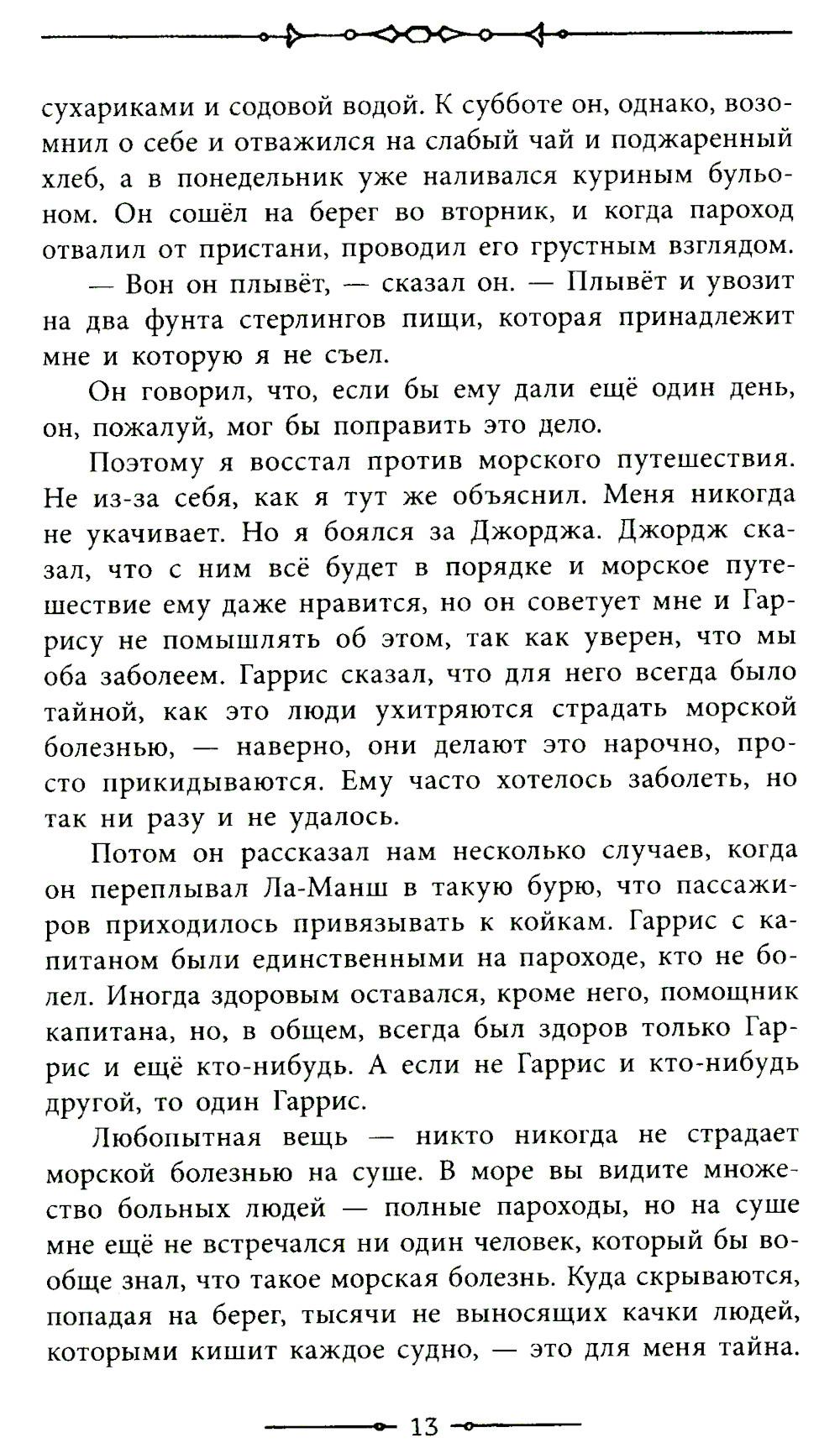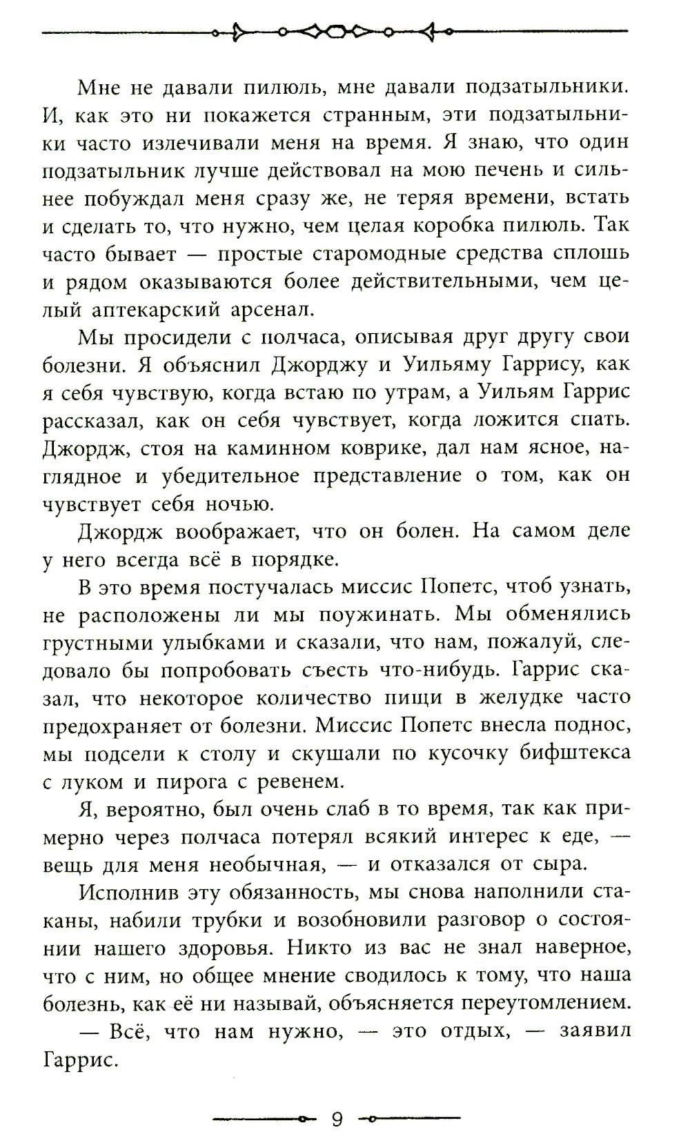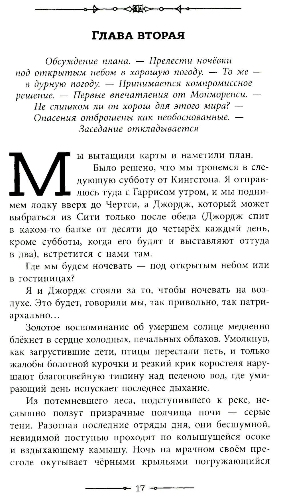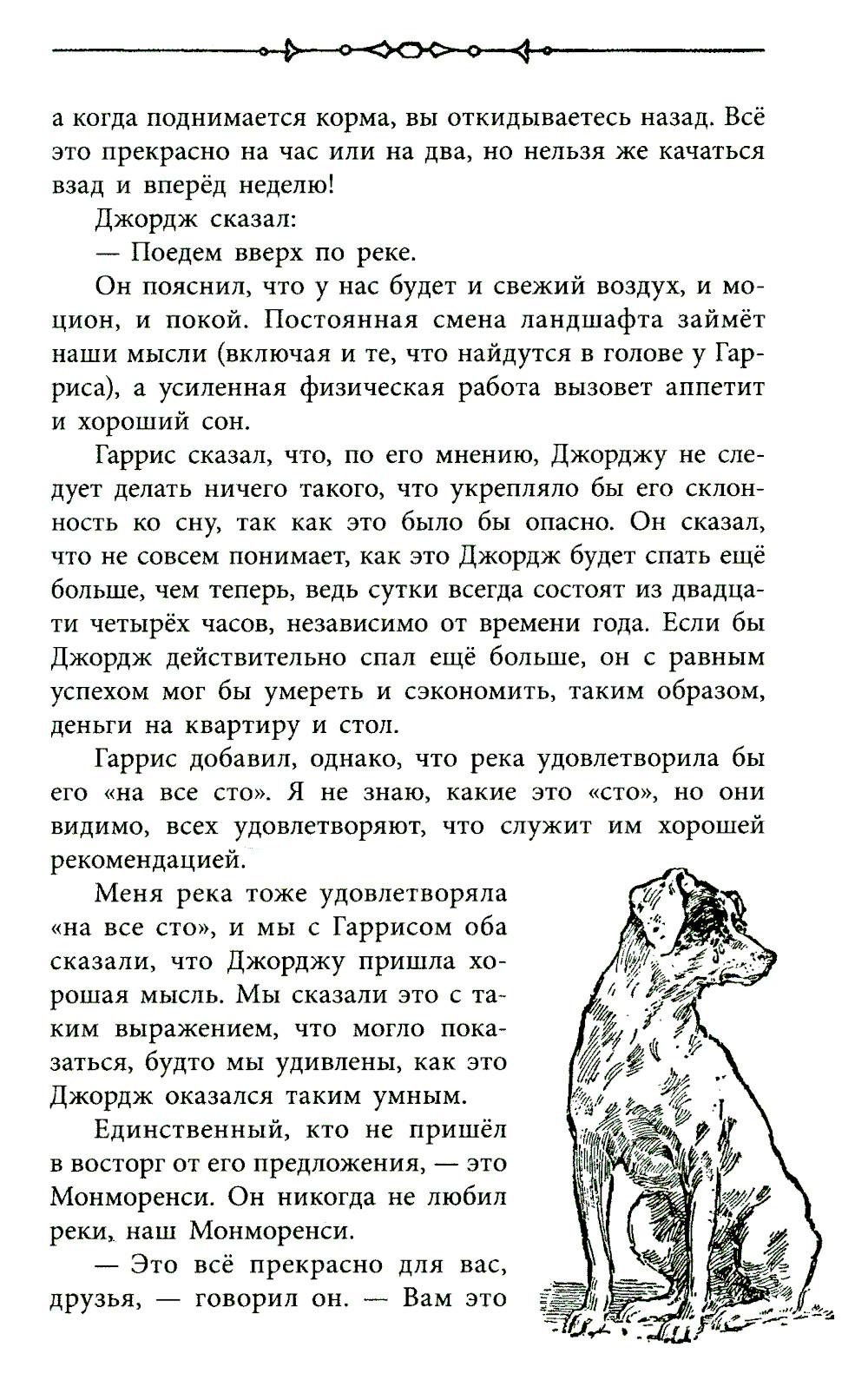 Трое друзей вместе с фокстерьером Монморенси отправляются на лодочную прогулку по Темзе. На своем пути они столкнутся с препятствиями, которые неизбежно преследуют любого путешественника: намертво запутавшаяся бечева, неоткрывающиеся консервы, отвратительная погода. Но наши друзья не теряют присутствия духа и из любой ситуации выходят с юмором. Иллюстрации Альфреда Фредерикса.