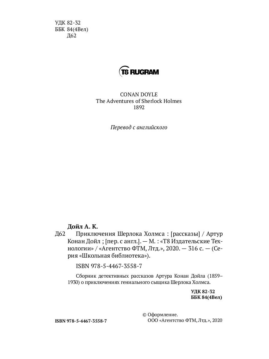 Сборник детективных рассказов Артура Конан Дойла (1859-1930) о приключениях гениального сыщика Шерлока Холмса.| Издательство | Т8 RUGRAM |
