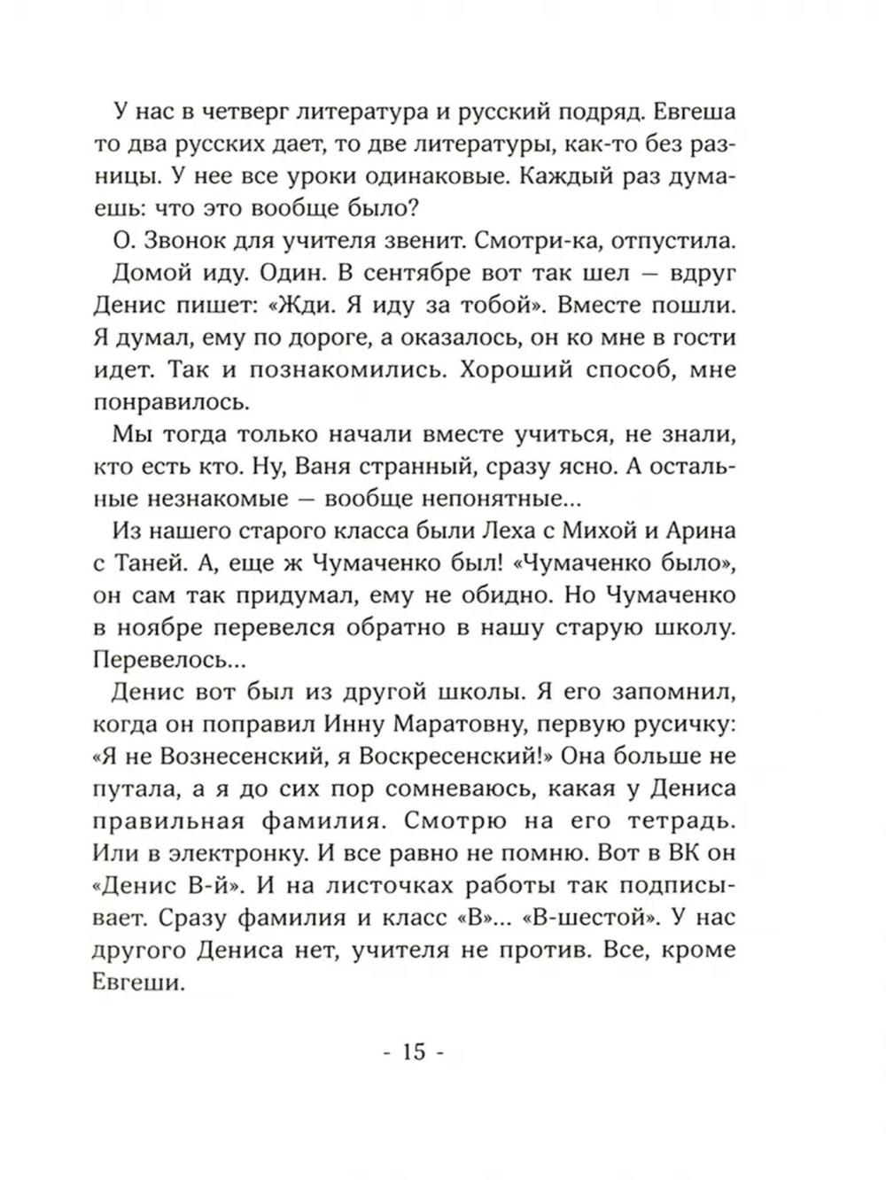 «Школа - это просто камера хранения», - говорит один из героев повести. Не так уж и «просто», если вспомнить о бесконечных диктантах, контрольных и проверочных. Каждый день и каждый час тебя здесь оценивают, взвешивают на весах - годен или не годен, прошел или не прошел. «Мы изучаем в школе уравнения. Нас тут уравнивают. Всех со всеми», - это уже другой герой. И он тоже ошибается. Для того ведь и придумали гимназические классы, чтобы избежать уравниловки. Однако стало почему-то только хуже: теперь все озабочены тем, как бы не вылететь из этого самого гимназического класса. Можно подумать, нет ничего важнее в жизни. Кандидаты на вылет уже определены и названы, но вот с тем, что считать важным, а что - нет, им еще предстоит разобраться. Для детей среднего школьного возраста.| Издательство | Лабиринт |