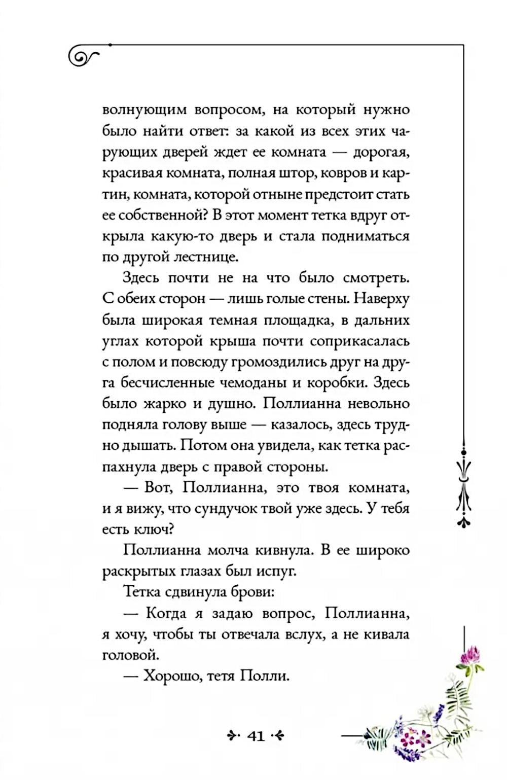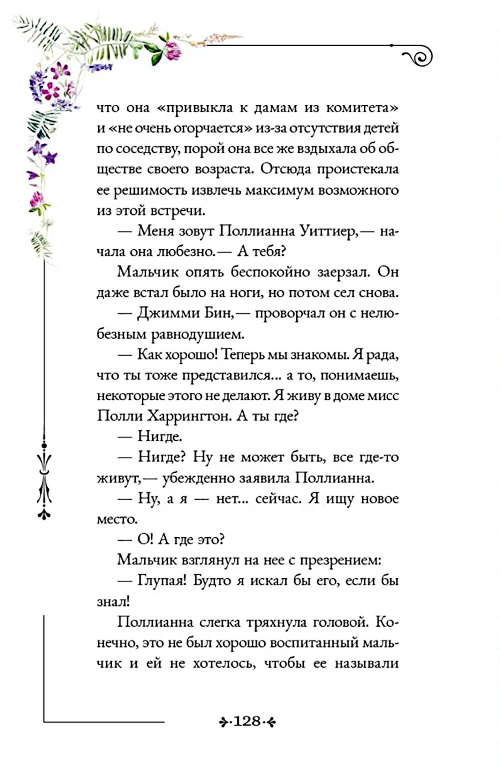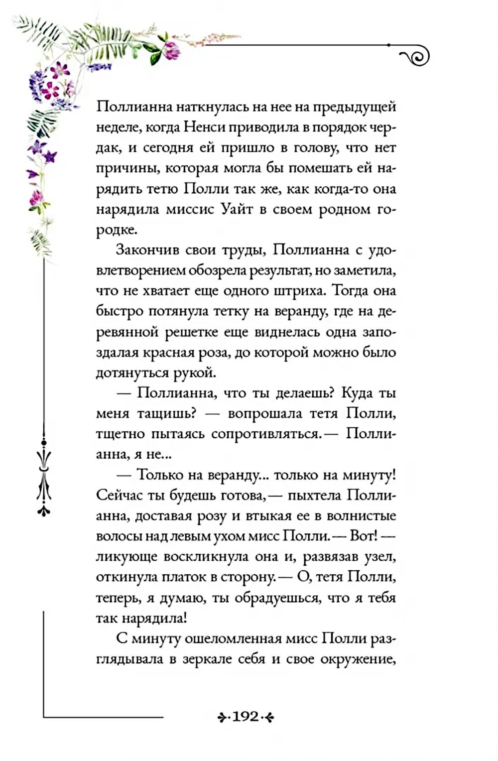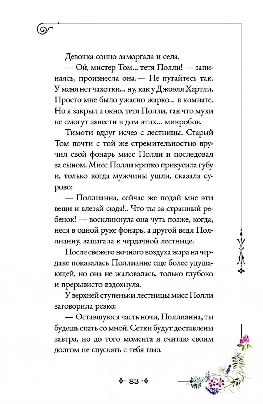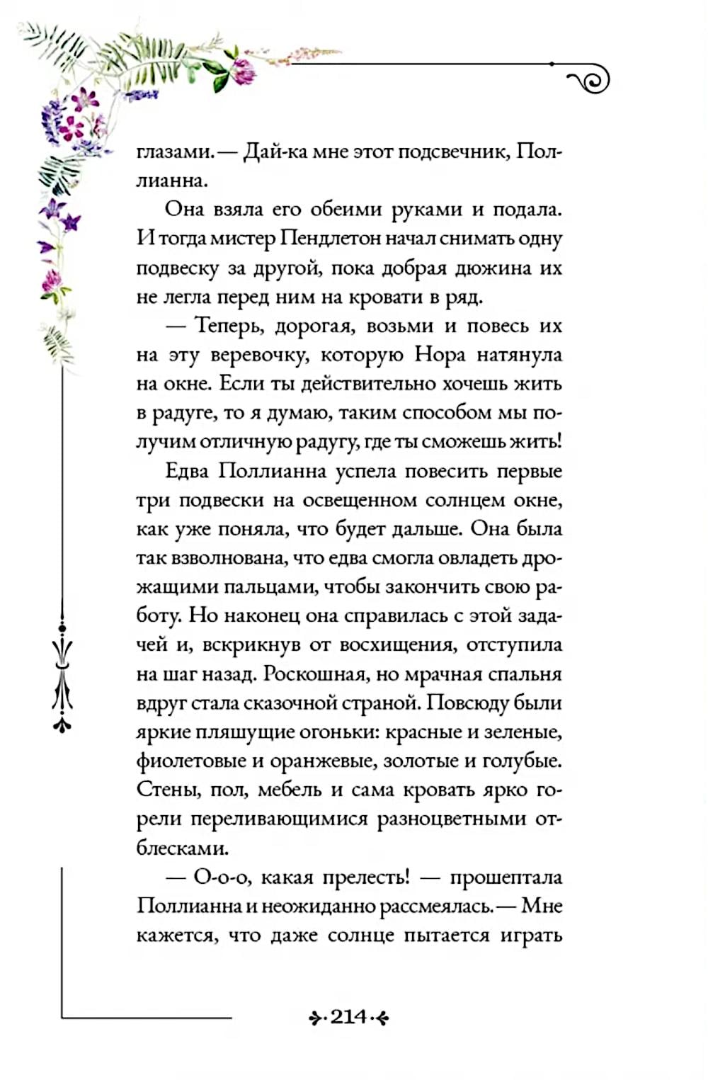 Элинор Портер - американская детская писательница, завоевавшая всемирную славу благодаря книге о Поллианне. С тех пор как читатели познакомились с этой обаятельной героиней в 1913 году, книга о ней стала излюбленным чтением для многих поколений девочек. Одиннадцатилетнюю сироту Поллианну берет на воспитание ее тетя, чопорная старая дева. Поначалу непоседливая и чересчур общительная девочка вызывает у мисс Полли и некоторых других жителей городка недоумение и даже раздражение. Она нарушает всевозможные правила, притаскивает домой котенка, собаку и даже мальчика, сбежавшего из приюта, разговаривает с незнакомцами и всем рассказывает об «игре в радость», смысл которой заключается в том, чтобы в любой ситуации находить что-то хорошее. Но постепенно эта необыкновенная девочка умудряется подобрать ключик к каждому сердцу, а когда с ней случается несчастье, все бросаются ей на помощь. Стильные акварельные иллюстрации создала Полина Дикова.| Издательство | Качели |