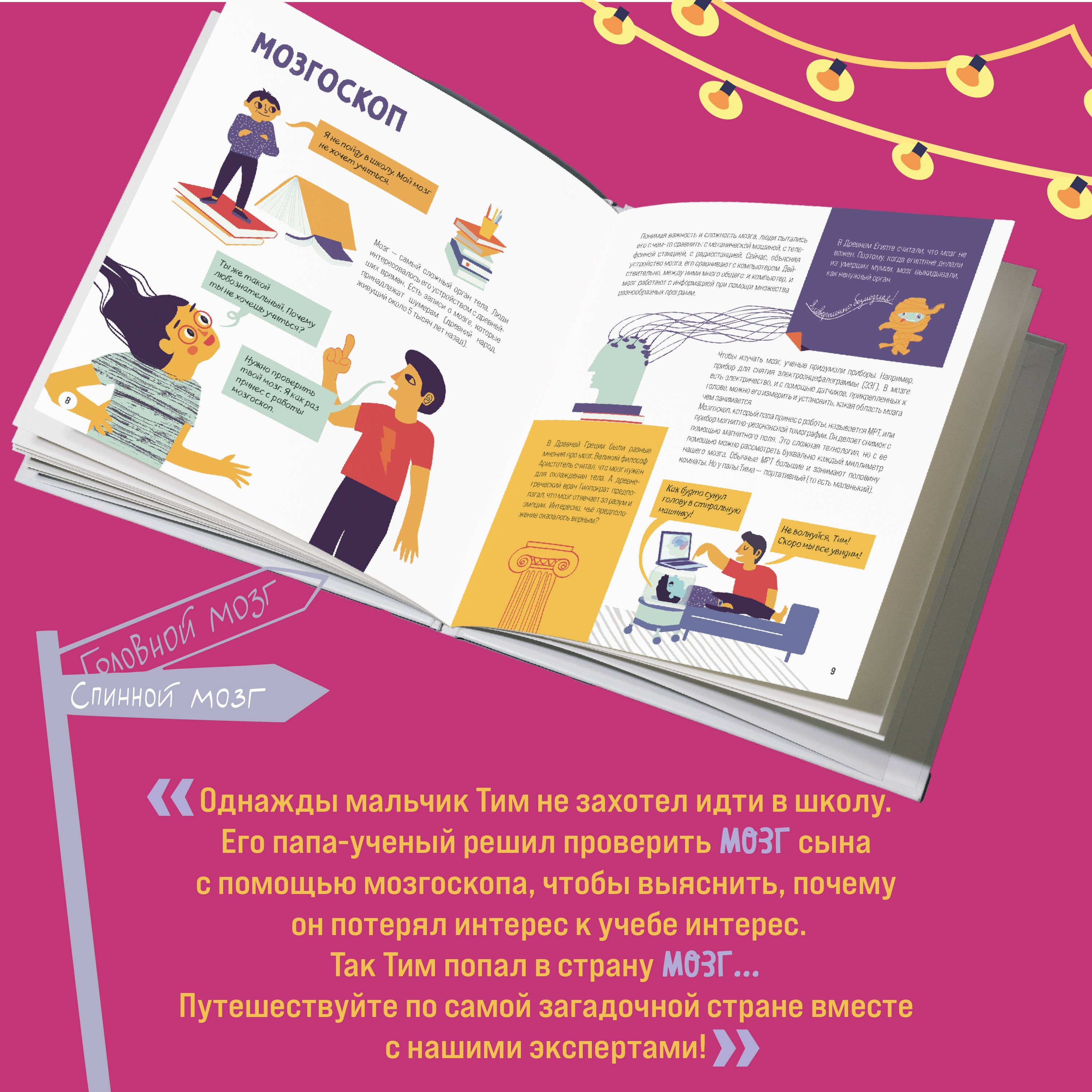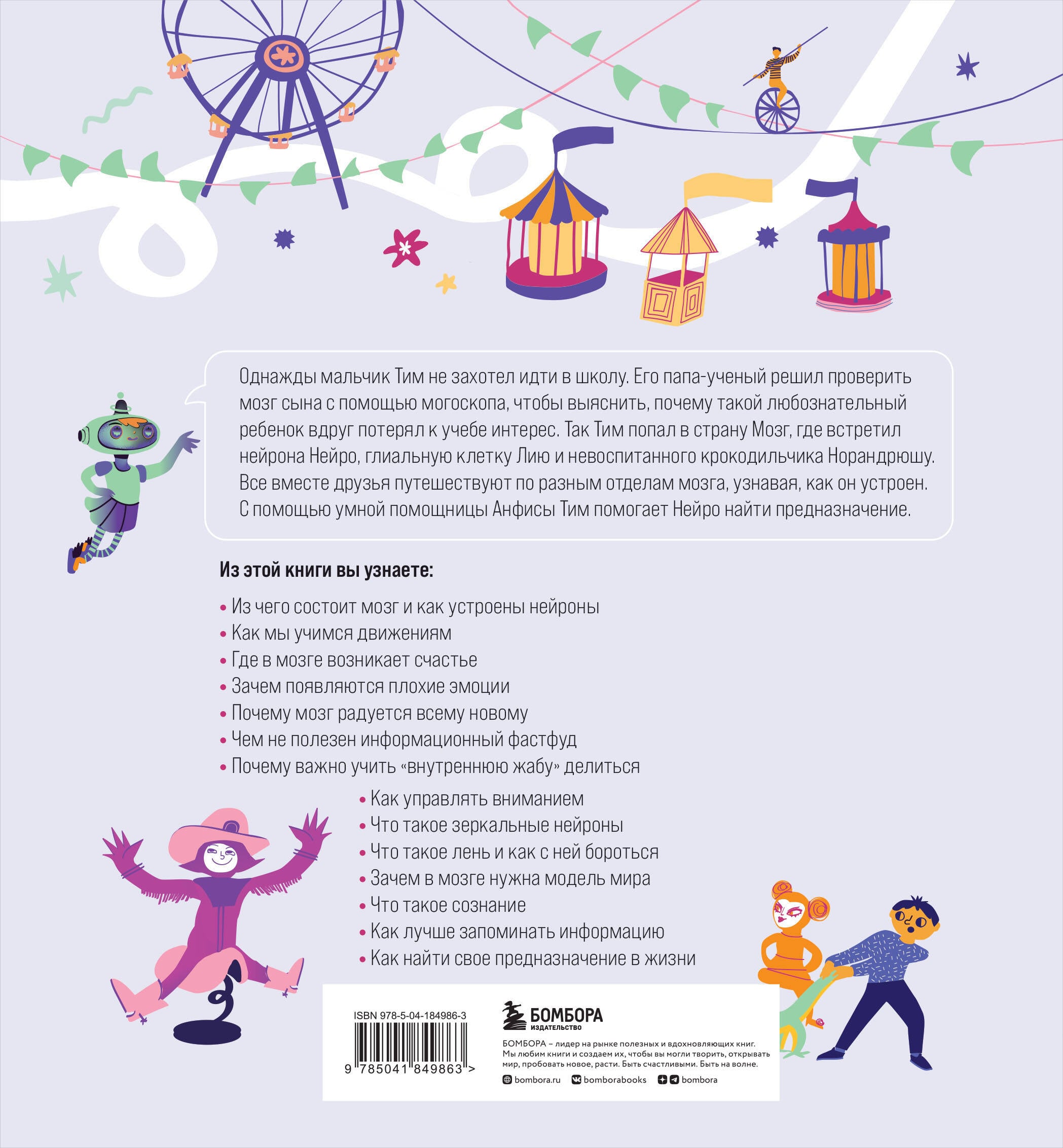 Если у вас есть ребенок, то это лучшая книга про мозг, которую можно читать с ним вместе. Благодаря творческой команде, состоящей из двух ученых, писателя и иллюстратора, книга получилась легкой для восприятия, информативной, красочной и познавательной. Прекрасный подарок для мам, пап и их детей. Вячеслав Дубынин, один из соавторов книги - профессор МГУ, один из ведущих экспертов в области исследований мозга. Однажды мальчик Тим не захотел идти в школу. Его папа-ученый решил проверить мозг сына с помощью мозгоскопа, чтобы выяснить, почему такой любознательный ребенок вдруг потерял к учебе интерес. Так Тим попал в страну Мозг, где встретил нейрона Нейро, глиальную клетку Лию и невоспитанного крокодильчика Норандрюшу. Все вместе друзья путешествуют по разным отделам мозга, узнавая, как он устроен. С помощью умной помощницы Анфисы Тим помогает Нейро найти предназначение.