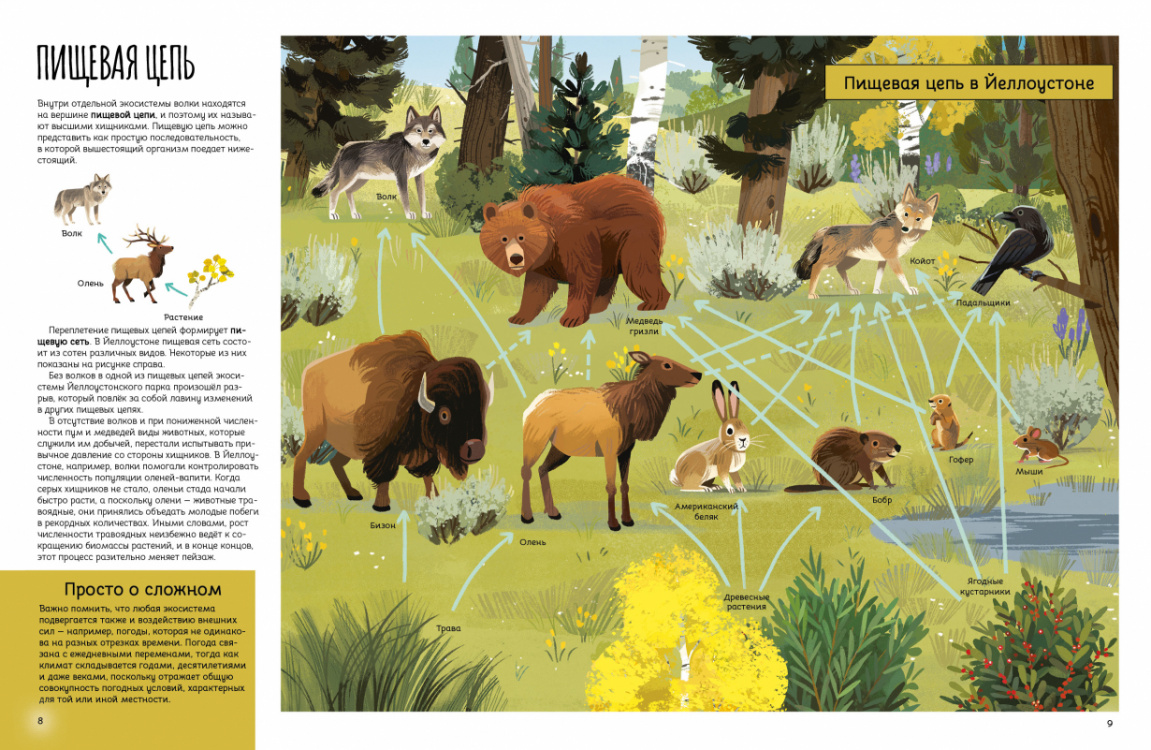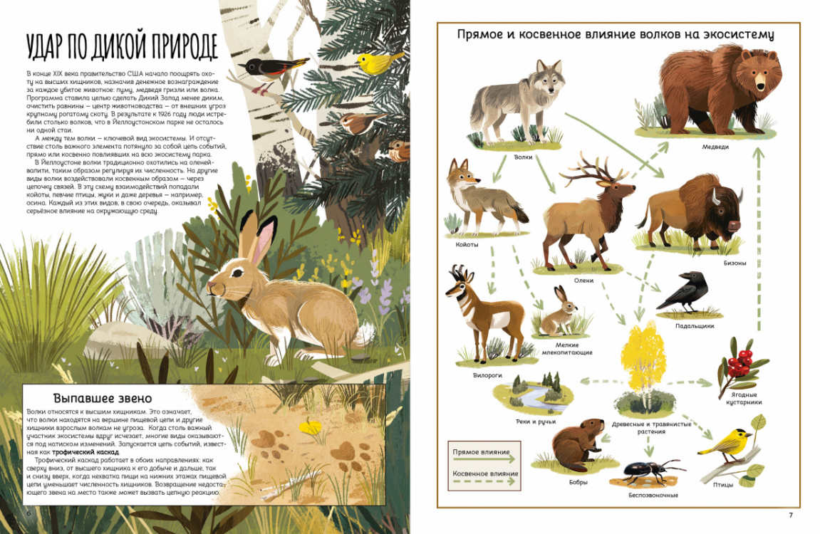 <div class="b-post-content _bookPage"><h2 id="o-chem">О чем</h2><p>Волки - не просто гордые и красивые звери, исчезновение которых само по себе обедняет природу. Это крупные активные хищники, регулирующие всю систему пищевых связей в экосистеме, например, в России, где ареал волков покрывает практически всю территорию страны, от Калининградской области до Камчатки. После семидесятилетнего отсутствия волки возвращаются в Йеллоустонский заповедник в США. </p><p>На страницах этой книги перед вами развернутся удивительные события: трансформация целой экосистемы! Изменится жизнь практически всех обитателей парка, да и сама местность преобразится. Этот опыт позволяет на наглядном примере рассмотреть сложную и причудливую систему взаимосвязей в дикой природе. Он доказывает, что непродуманные вмешательства в естественный ход событий могут привести к тяжёлым, порой необратимым последствиям. К счастью, это история с хорошим концом: кропотливый труд и энтузиазм десятков специалистов и волонтёров помог восстановить пошатнувшееся равновесие.</p><div class="box _cite"><div class="i-cite"><p class="i-cite__text"> «Внутри отдельной экосистемы волки находятся на вершине пищевой цепи, и поэтому их называ - ют высшими хищниками. Пищевую цепь можно представить как простую последовательность, в которой вышестоящий организм поедает ниже - стоящий». </p></div></div><div class="i-cut"><div class="i-cut__inner"><h2 id="osobennosti">Особенности</h2><p></p><ul><li>Иллюстрации Ким Смит - художницы, детского иллюстратора, арт-терапевта </li><li>Книга доступным языком объясняет опасность человеческого вмешательства в природу </li><li>Наглядный пример того, как можно спасти равновесие экосистемы.</li></ul><p></p><div class="box _cite"><div class="i-cite"><p class="i-cite__text"> «Волки - плотоядные. Как и у всех плотоядных, у волков есть особые зубы в задней части челюсти, которые так и называются - хищные, или карнассальные. Эти четыре зуба похожи на лезвия и приспособлены, чтобы разрывать и разрезать мясо, измельчать пищу на удобные для глотания куски. Хищные зубы затачиваются сами: когда животное закрывает пасть, то хищные зубы - два сверху и два снизу - трутся друг о друга, как половинки ножниц». </p></div></div><h2 id="dlya-kogo">Для кого</h2><p>Для детей от 6-ти лет. </p></div><div class="i-cut__action"><a class="i-cut__activator link-txt _caps-14 _gray _t-bold" data-cut-text-active="Свернуть" data-cut-text-default="Развернуть" href="#">Развернуть</a></div></div></div>| Издательство | Альпина |