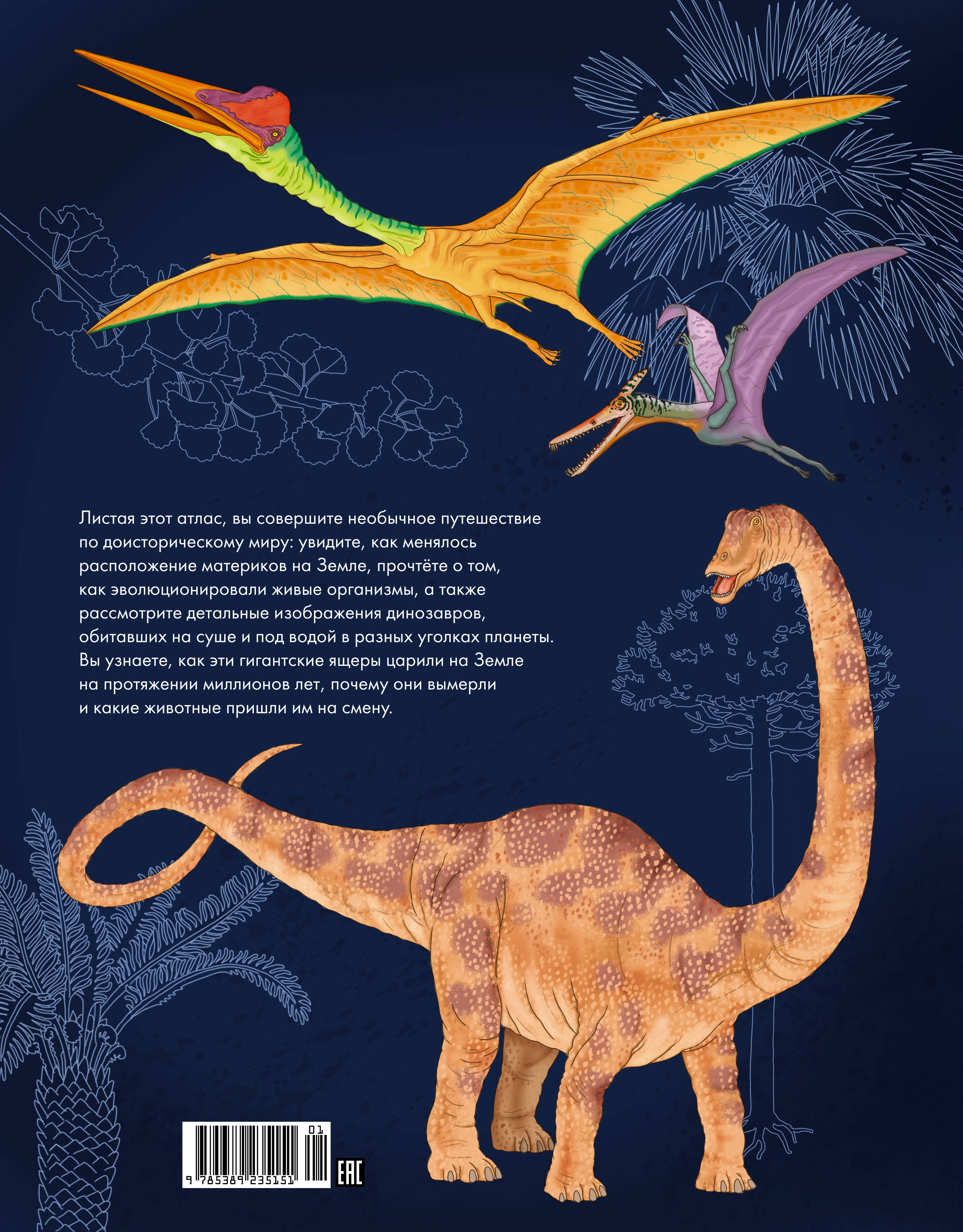 Листая этот атлас, вы совершите необычное путешествие по доисторическому миру: увидите, как менялось расположение материков на Земле, прочтёте о том, как эволюционировали живые организмы, а также рассмотрите детальные изображения динозавров, обитавших на суше и под водой в разных уголках планеты. Вы узнаете, как эти гигантские ящеры царили на Земле на протяжении миллионов лет, почему они вымерли и какие животные пришли им на смену.