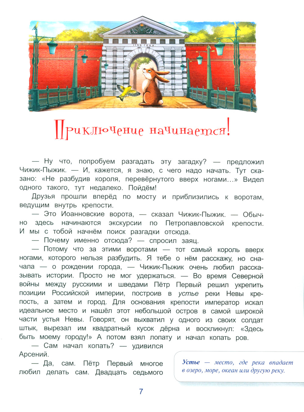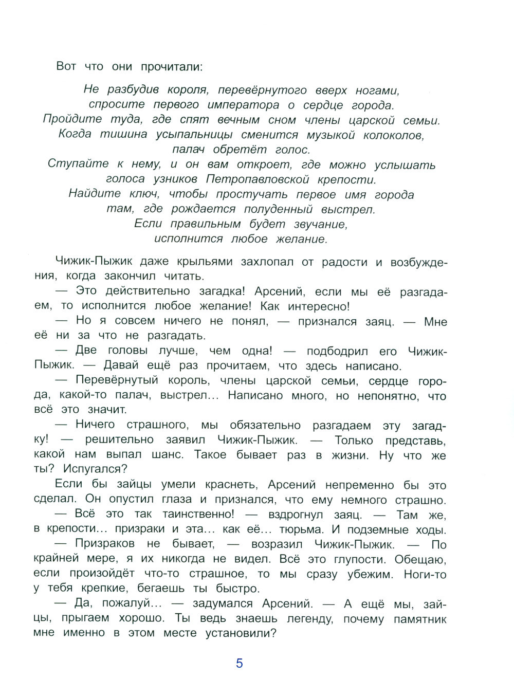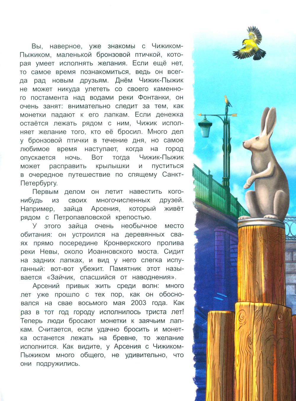 Книга входит в серию познавательной литературы для детей младшего и среднего школьного возраста «Города и чудеса». Чижику-Пыжику предстоит новое увлекательное приключение, да не где-нибудь, а в самом сердце Санкт-Петербурга. Спутником его станет Арсений - зайчик, спасшийся от наводнения, что сидит на свае у Иоанновского моста. Друзьям предстоит разгадать загадку старинного манускрипта и заглянуть в самые таинственные уголки Петропавловской крепости. Почему остров называется Заячьим? Зачем кораблю дом? Кто подвесил короля вверх ногами? Как звучит музыка колоколов? Угрожают ли наводнения городу на Неве? Что такое тюремная азбука и куда ведёт тайный ход в крепостной стене? Ответы на эти и многие другие вопросы ты найдёшь, если отправишься в новое путешествие с Чижиком-Пыжиком. Книга предназначена для семейного и самостоятельного чтения детям 9-12 лет.| Издательство | Антология |
