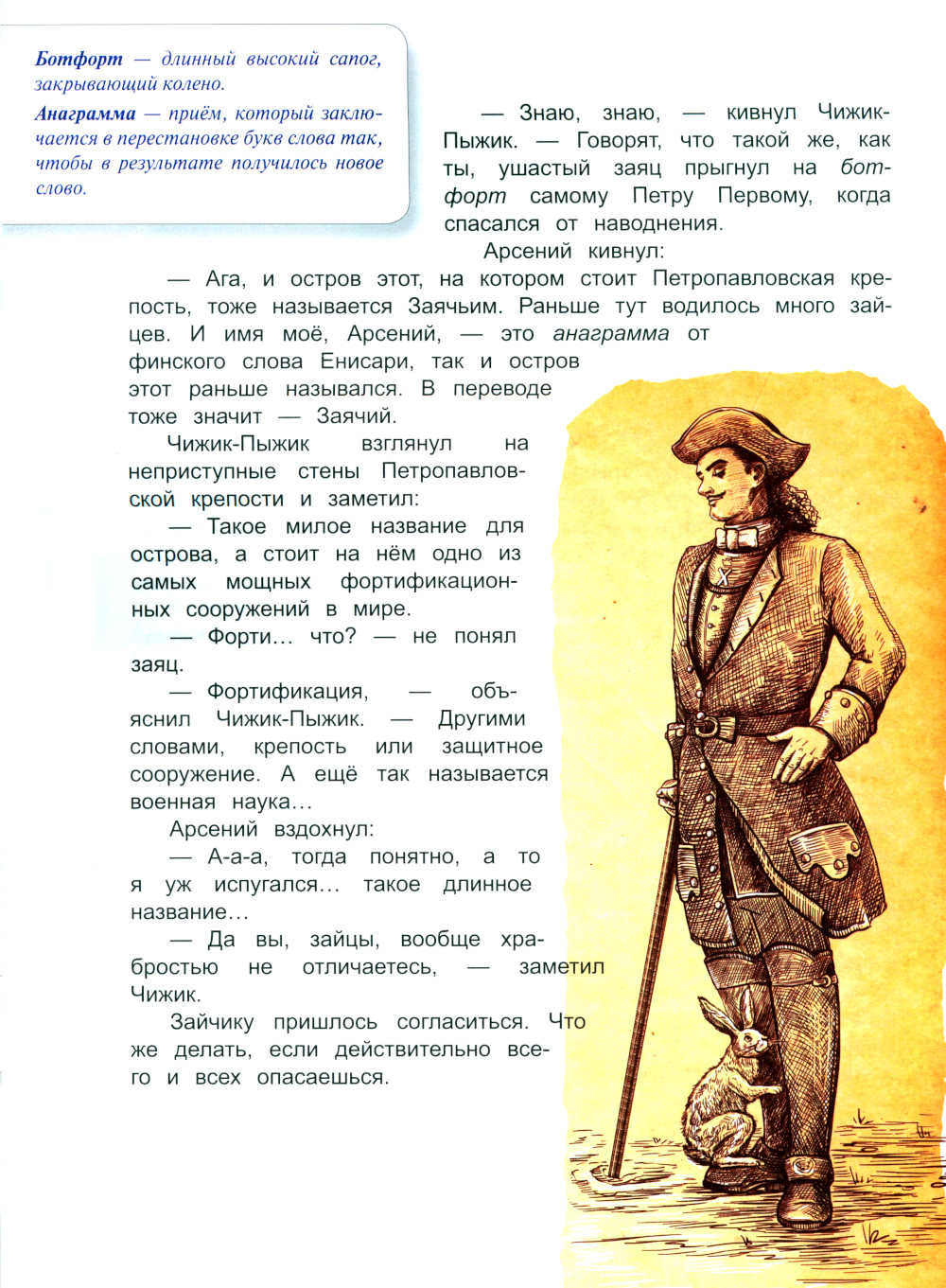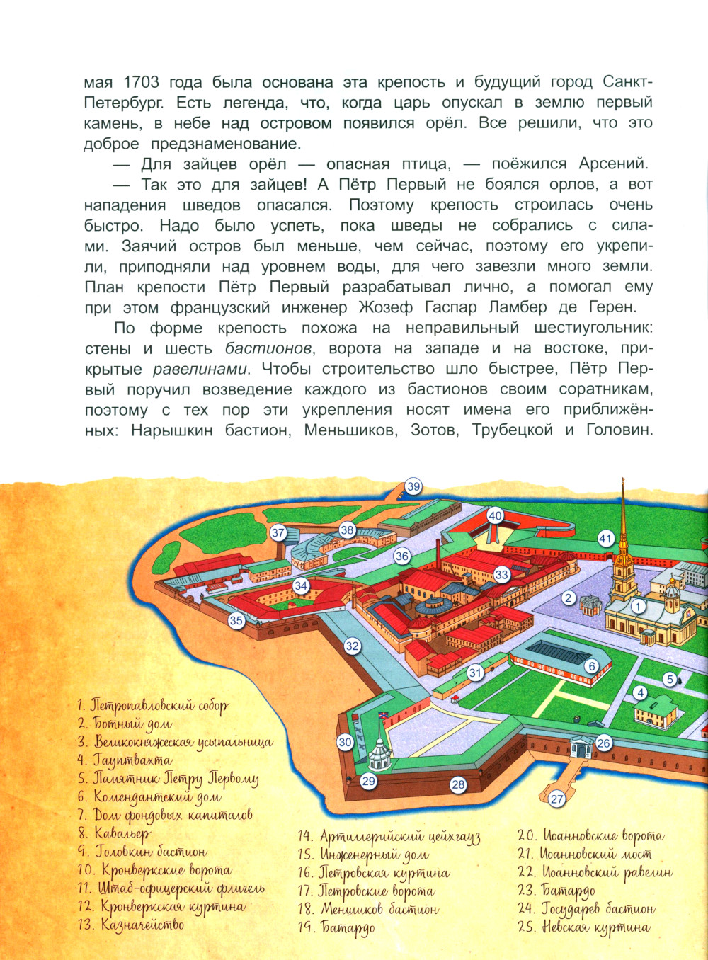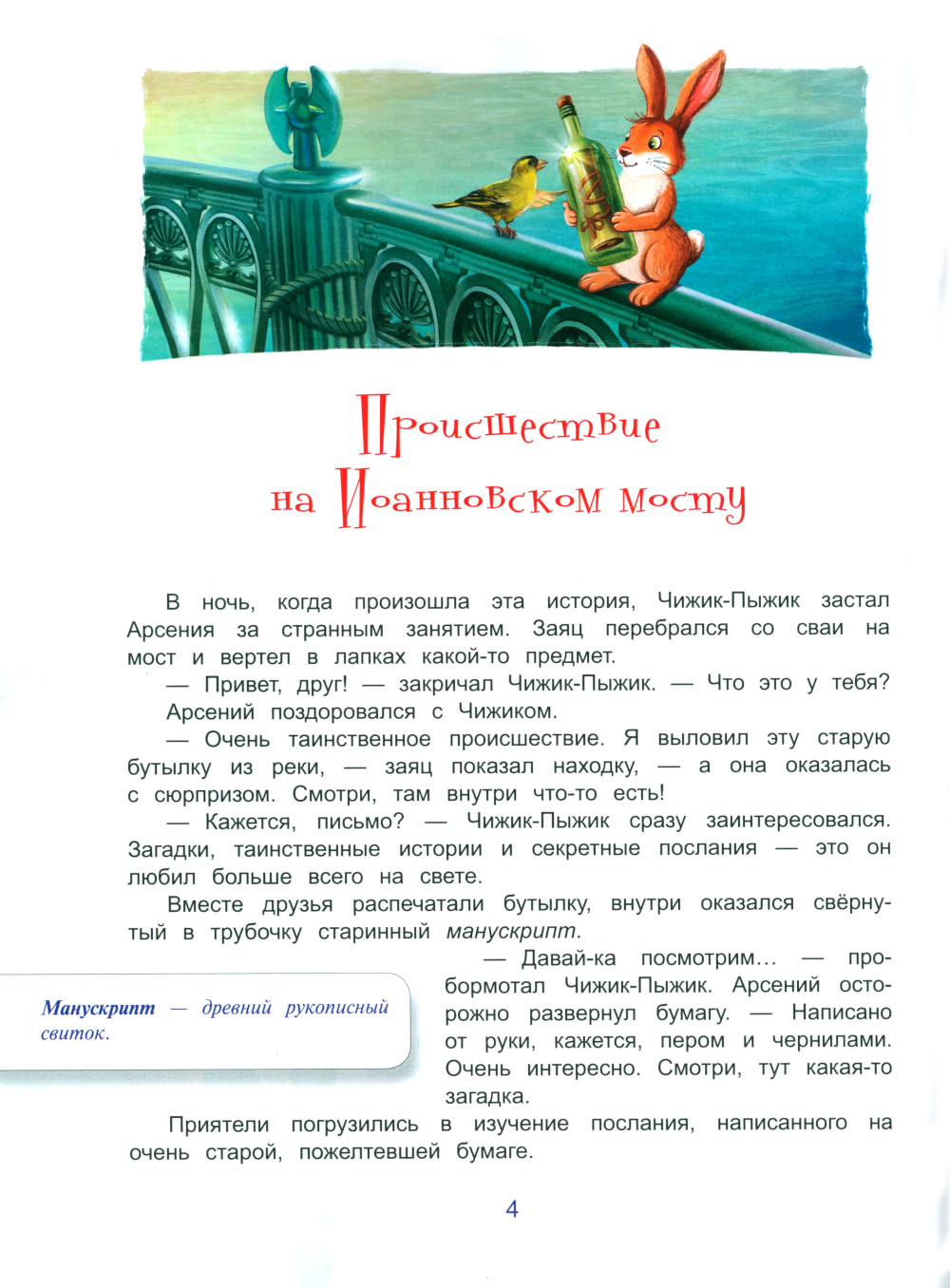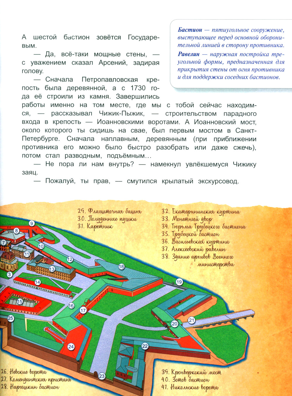 Книга входит в серию познавательной литературы для детей младшего и среднего школьного возраста «Города и чудеса». Чижику-Пыжику предстоит новое увлекательное приключение, да не где-нибудь, а в самом сердце Санкт-Петербурга. Спутником его станет Арсений - зайчик, спасшийся от наводнения, что сидит на свае у Иоанновского моста. Друзьям предстоит разгадать загадку старинного манускрипта и заглянуть в самые таинственные уголки Петропавловской крепости. Почему остров называется Заячьим? Зачем кораблю дом? Кто подвесил короля вверх ногами? Как звучит музыка колоколов? Угрожают ли наводнения городу на Неве? Что такое тюремная азбука и куда ведёт тайный ход в крепостной стене? Ответы на эти и многие другие вопросы ты найдёшь, если отправишься в новое путешествие с Чижиком-Пыжиком. Книга предназначена для семейного и самостоятельного чтения детям 9-12 лет.| Издательство | Антология |