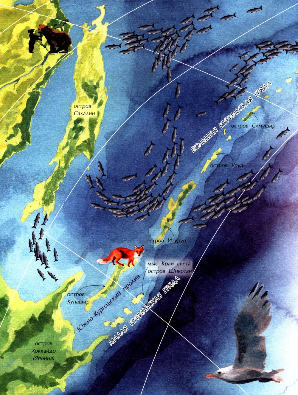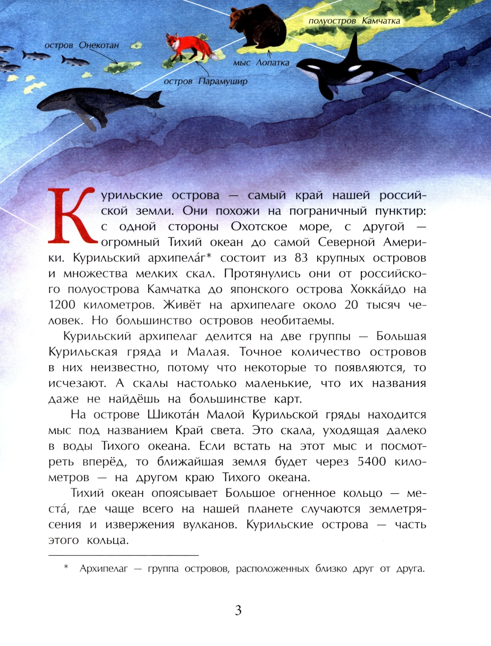 Курильские острова - это горы, вулканы, скалы, Охотское море с одной стороны и огромный Тихий океан с другой. Деревья здесь маленькие, а травы гигантские. На суше животный мир не очень разнообразен, зато в воде кого только нет! Местные жители используют вертолёты вместо маршруток, а учёные почти в каждый свой приезд совершают открытия - от нового растения до целого острова.| Издательство | Настя и Никита |