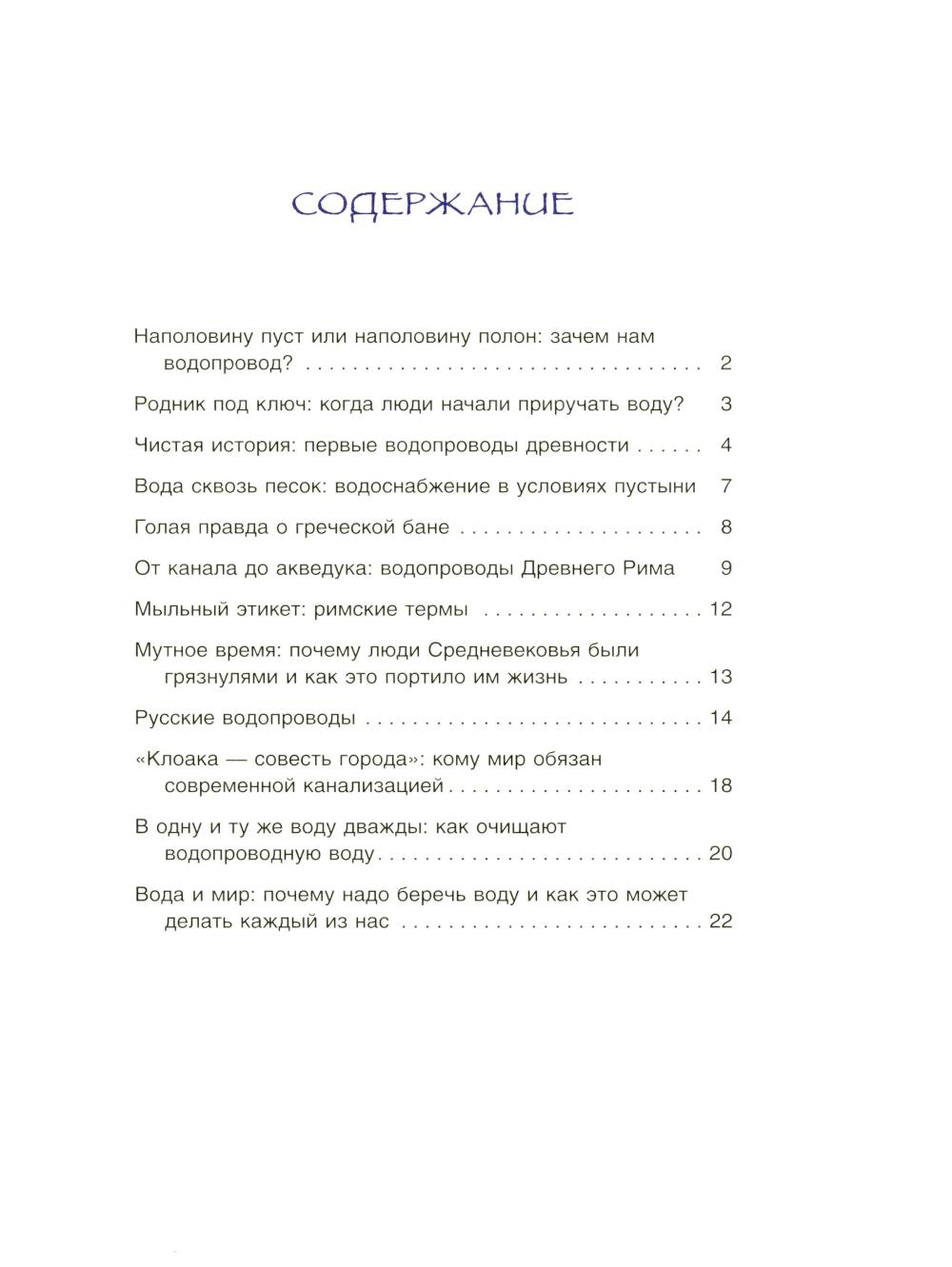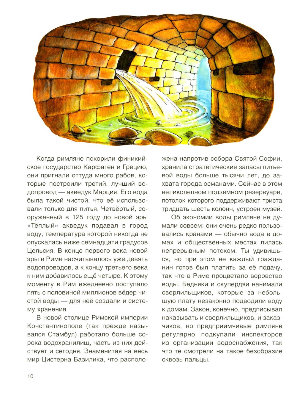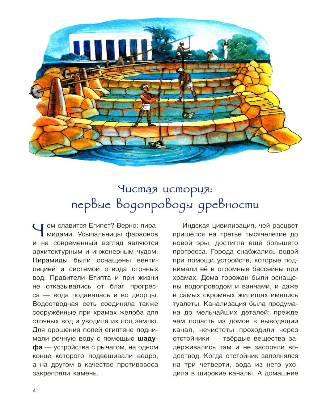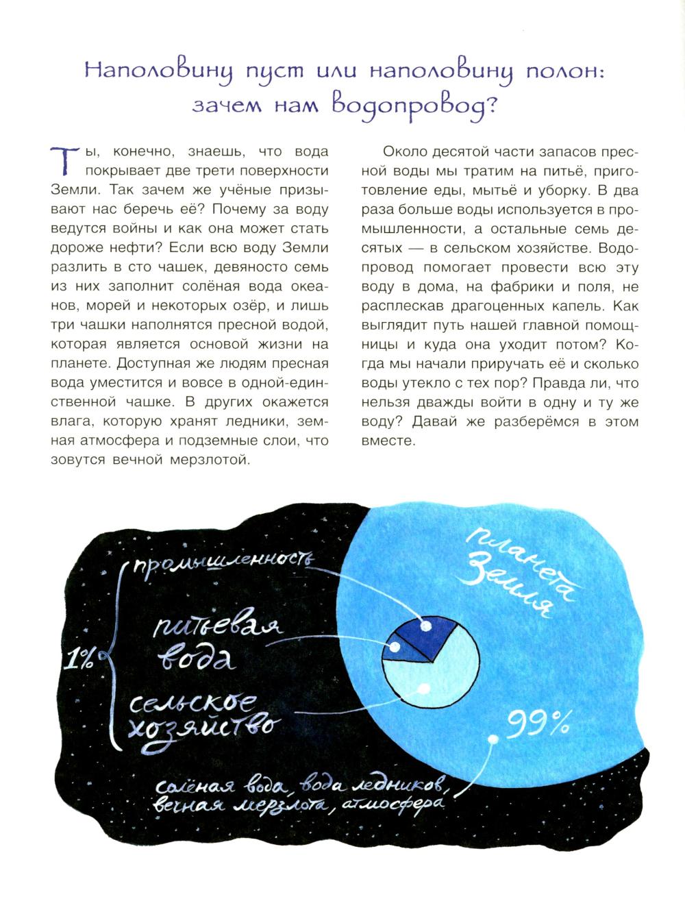В мире нет вещества привычнее и в то же время важнее воды - ведь она покрывает две трети поверхности Земли. Но если всю эту воду разлить в сто чашек, доступная людям пресная вода уместится в одной-единственной чашке. Провести эту заветную жидкость в дома, на фабрики и поля, не расплескав драгоценных капель, нам помогает водопровод. Как выглядит путь нашей главной помощницы и куда она уходит потом? Когда мы начали приручать её и сколько воды утекло с тех пор? Правда ли, что нельзя дважды войти в одну и ту же воду? Давайте разберемся в этом вместе с научным журналистом Ксенией Друговейко. Для среднего школьного возраста.| Издательство | Качели |