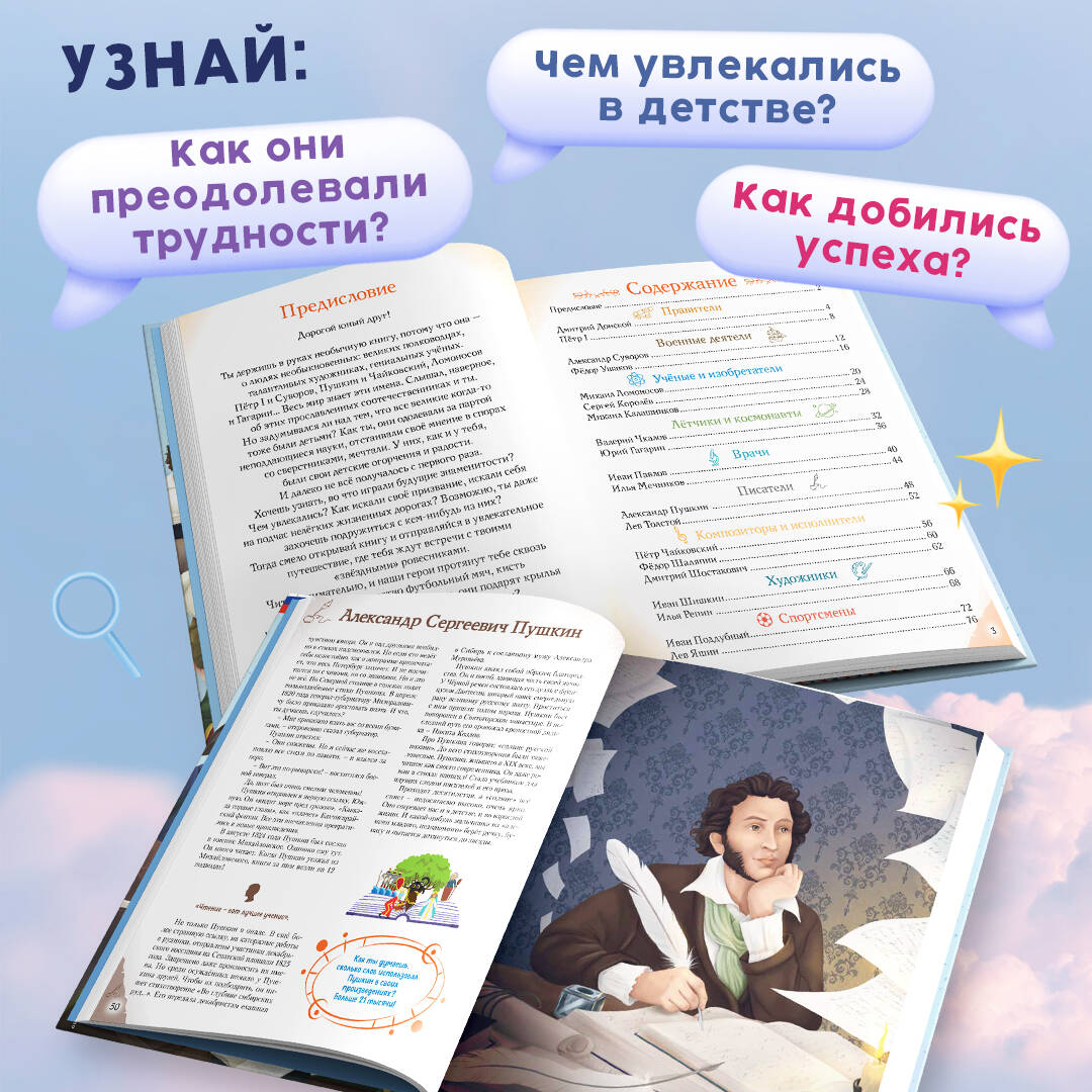 Отправляйтесь в захватывающее путешествие по разным эпохам нашей страны! Вы хотите познакомить вашего ребёнка с известными людьми России - Петром I и Суворовым, Пушкиным и Чайковским, Ломоносовым и Гагариным? Узнать, во что играли будущие исторические личности? Чем увлекались в детстве? Как искали свою судьбу, искали себя на нелёгких жизненных дорогах? Ведь они так же, как и все мы, одолевали за партой неподдающиеся науки, отстаивали собственное мнение в спорах; у них были свои детские огорчения и радости. И далеко не всё получалось с первого раза... Тогда открывайте эту книгу! В каждом из 20 биографических рассказов, адаптированных для детей 7-10 лет, - невероятный образец силы воли и стойкости характера, мотивирующий ребят на собственные свершения. Их сопровождают красочные полосные иллюстрации и занимательные факты, чтобы знакомиться с выдающимися соотечественниками было наглядно и увлекательно. А ещё это неповторимый подарок для всех, кто гордится историей и культурой своего Отечества!| Издательство | ООО "Издательство "Эксмо" |