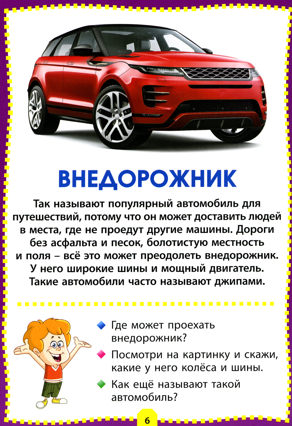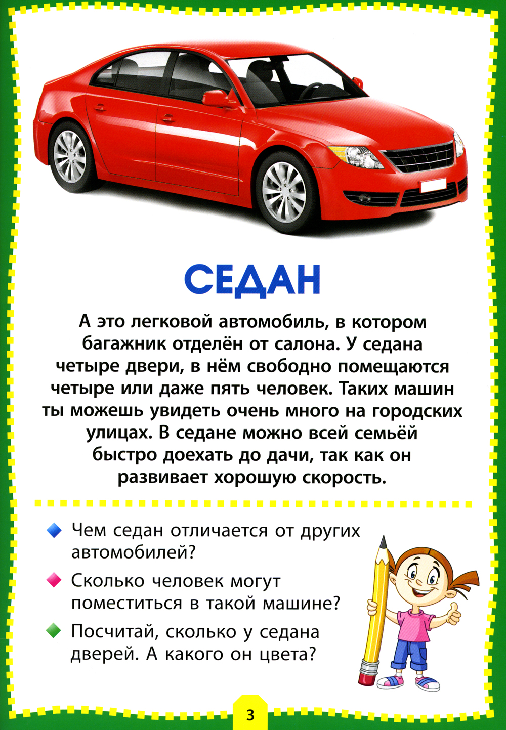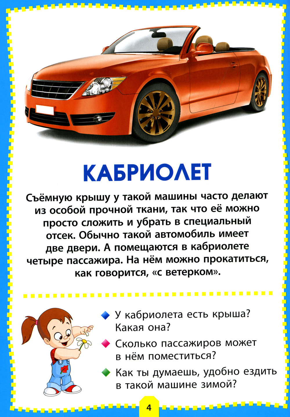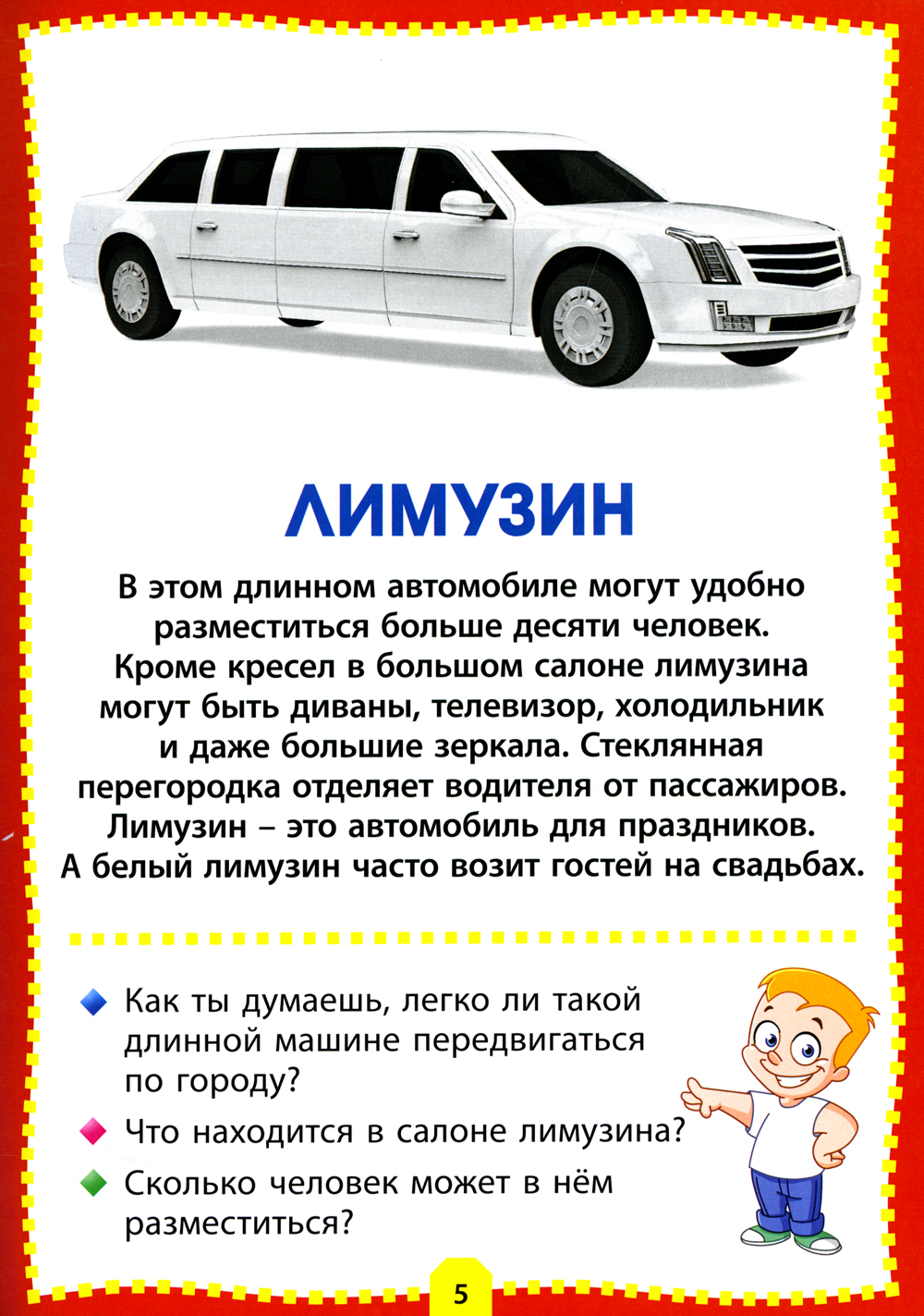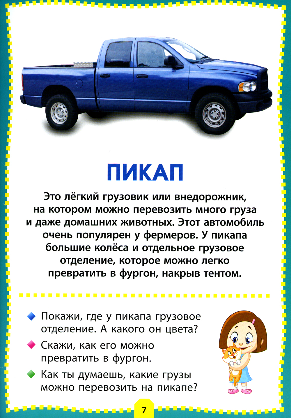 Предлагаем вам развивающую серию для вашего ребёнка, которая познакомит малыша с окружающим миром, а яркие фотографии и реалистичные картинки помогут ему в этом. Кроме того, в игровой форме «вопрос-ответ» вы сможете закрепить у ребёнка полученные знания. В книге «Машины» дети смогут познакомиться с самыми разными автомобилями и транспортом: внедорожником и самосвалом, кабриолетом и болидом, автовозом и фурой, трамваем и троллейбусом, а также узнают, чем, например, отличается седан от пикапа или автокран от бульдозера.| Издательство | Владис |